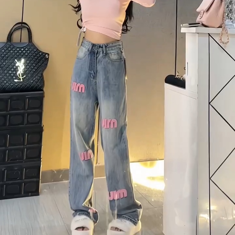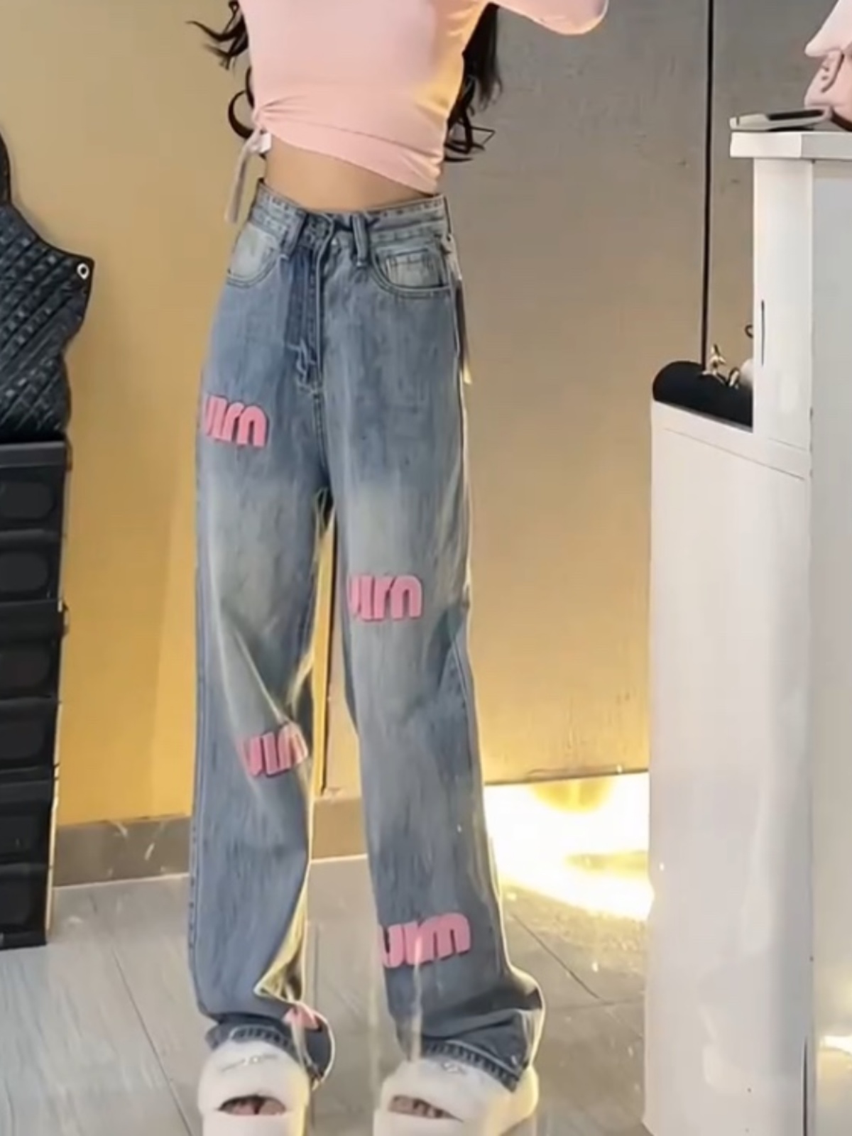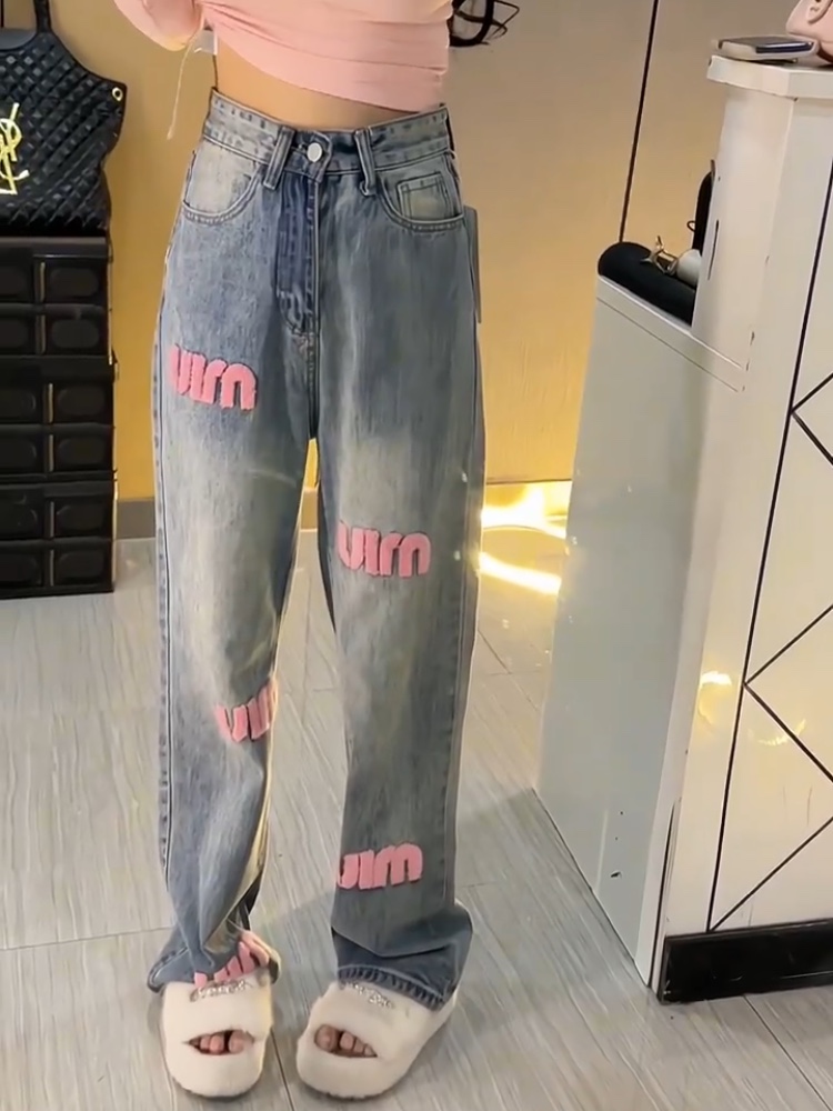 RM29690#欧洲站粉色刺绣字母毛巾绣直筒牛仔裤女2023年冬季加绒阔腿长裤潮