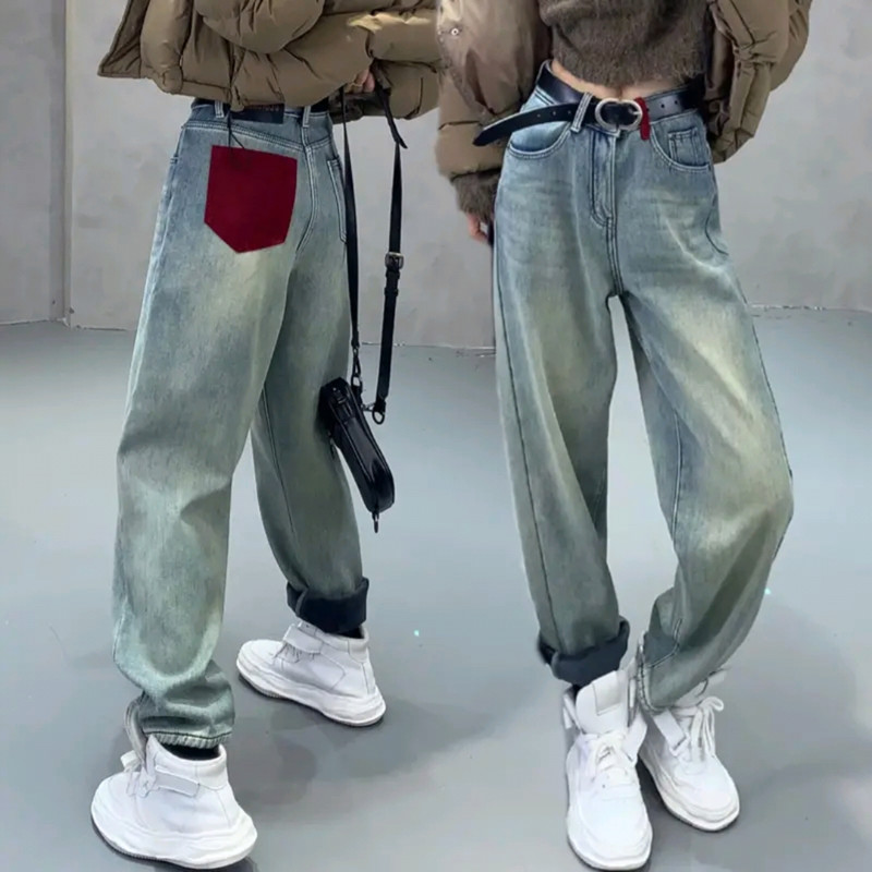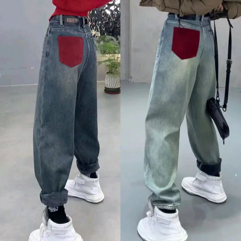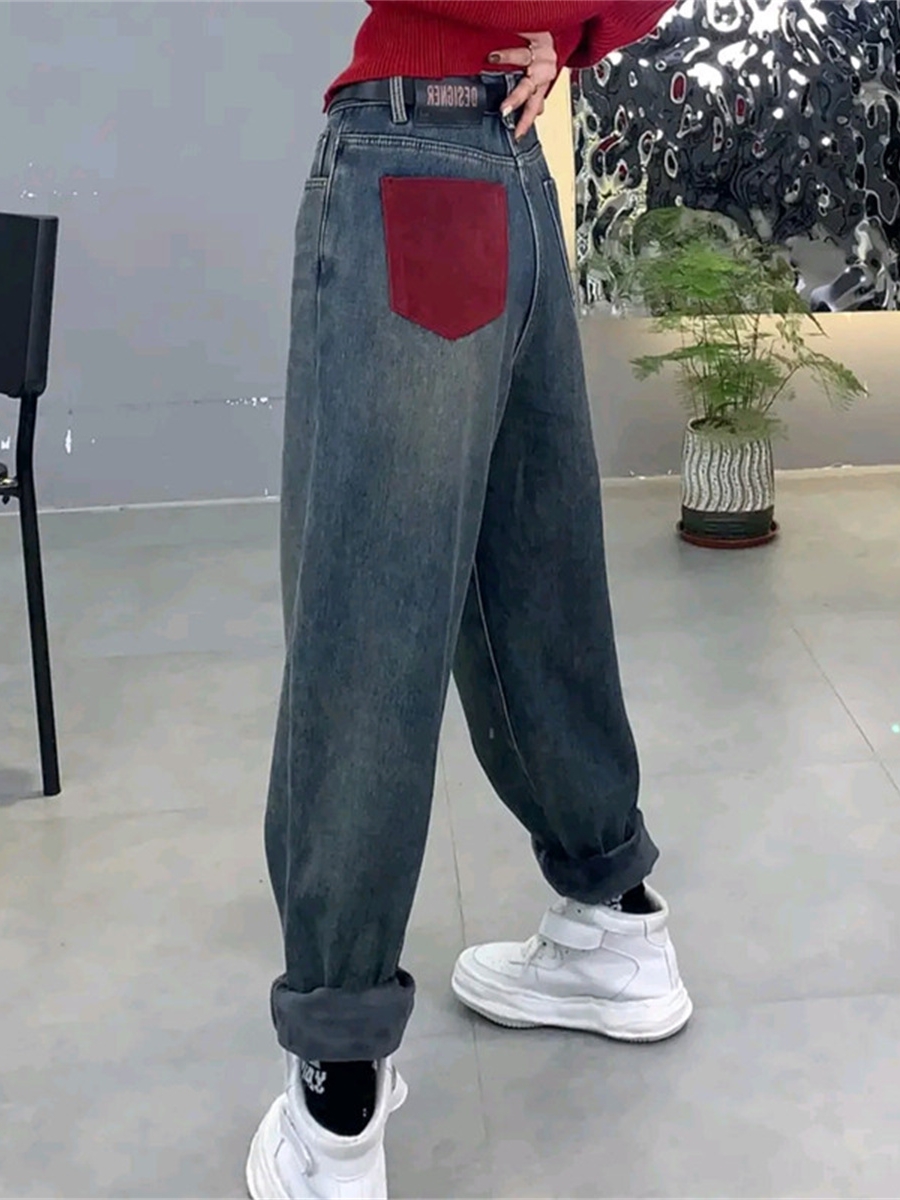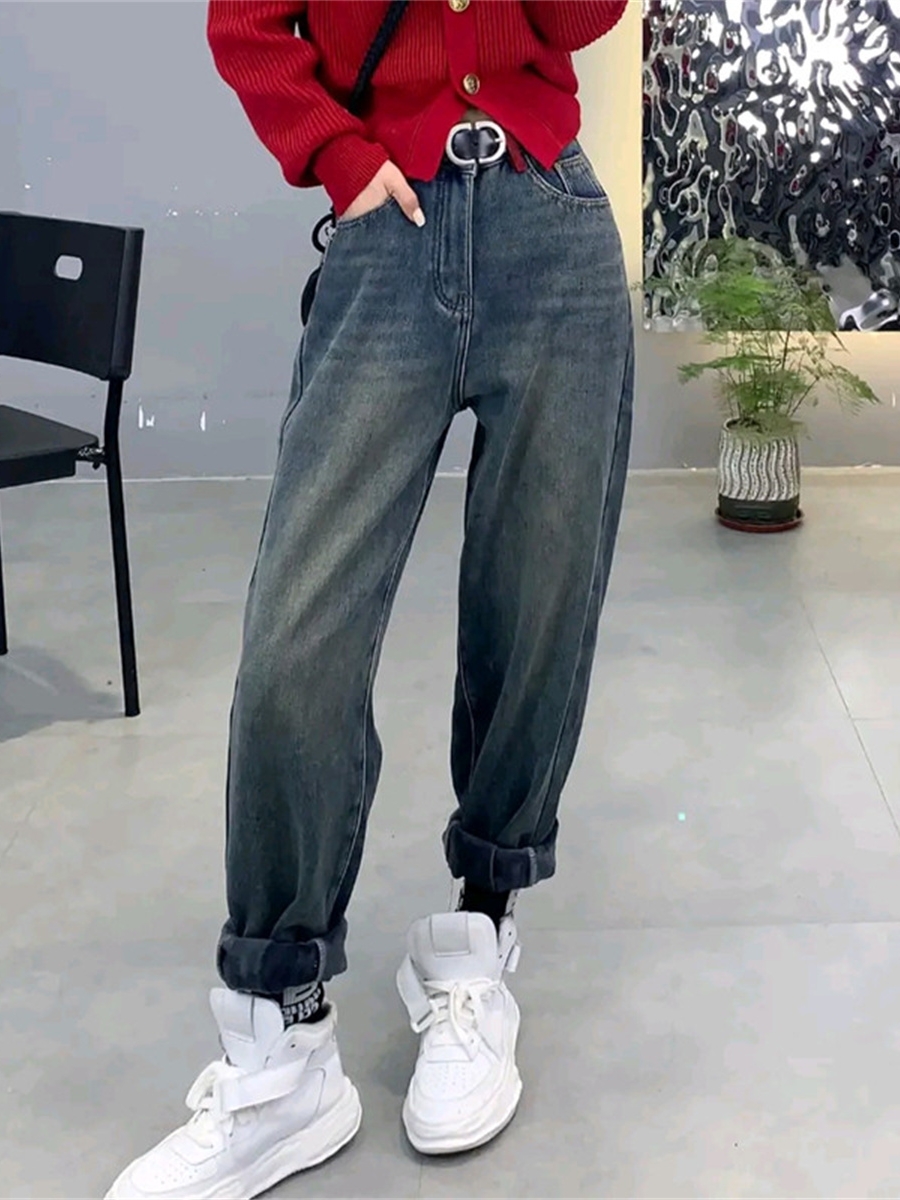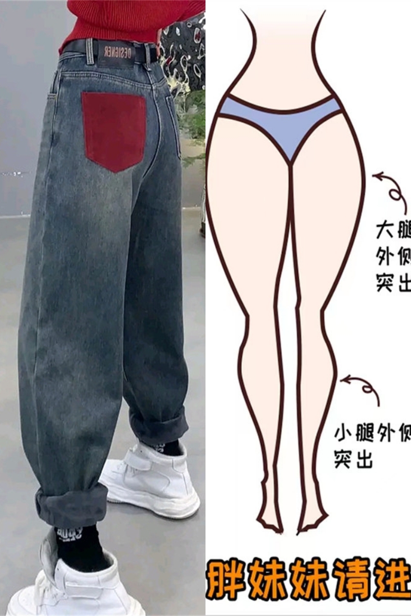 RM29691#大码冬季新款高腰加厚加绒哈伦牛仔裤女胖妹妹mm宽松百搭老爹裤子