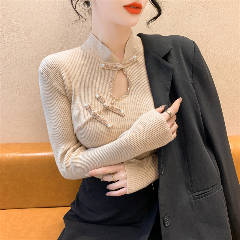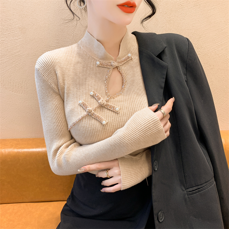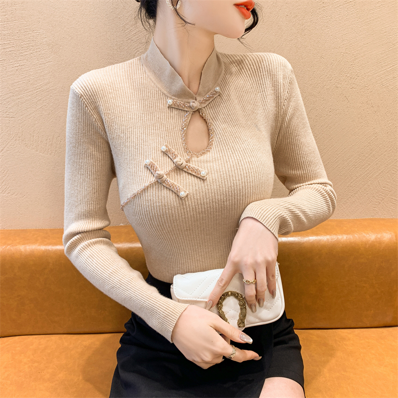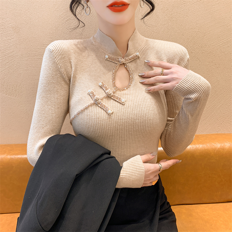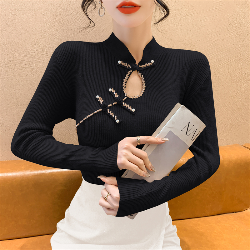 RM29693#重工钉钻半高领新中式盘扣泡泡袖针织衫毛衣女打底衫
