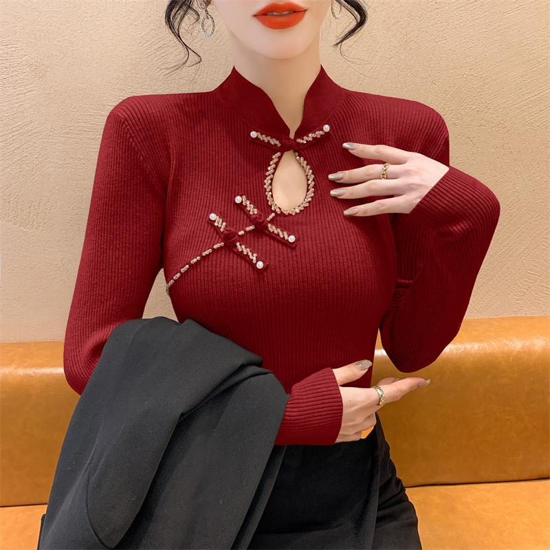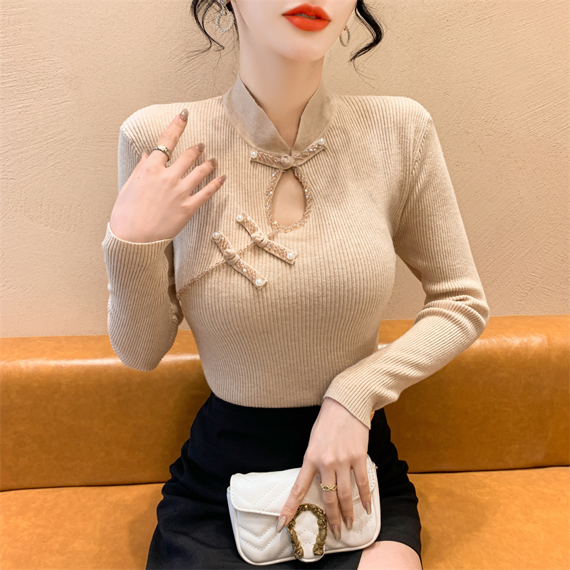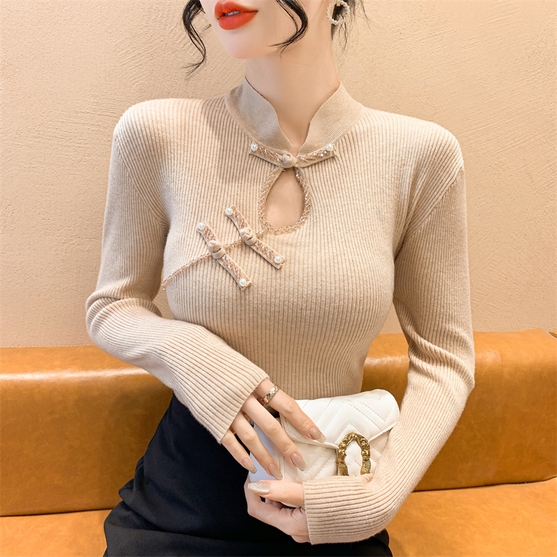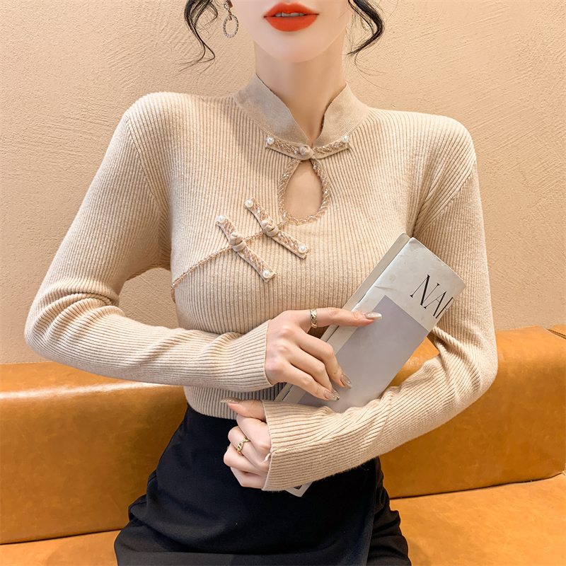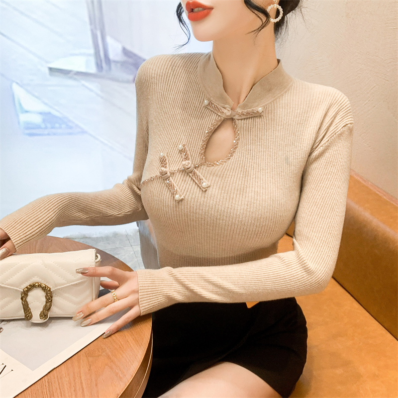 RM29693#重工钉钻半高领新中式盘扣泡泡袖针织衫毛衣女打底衫
