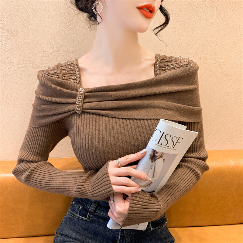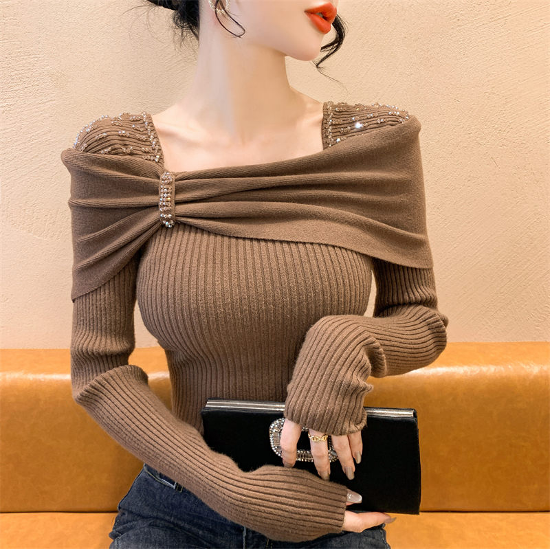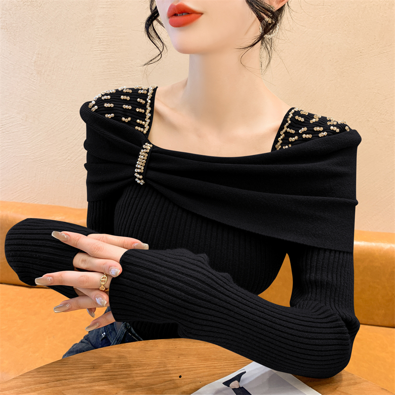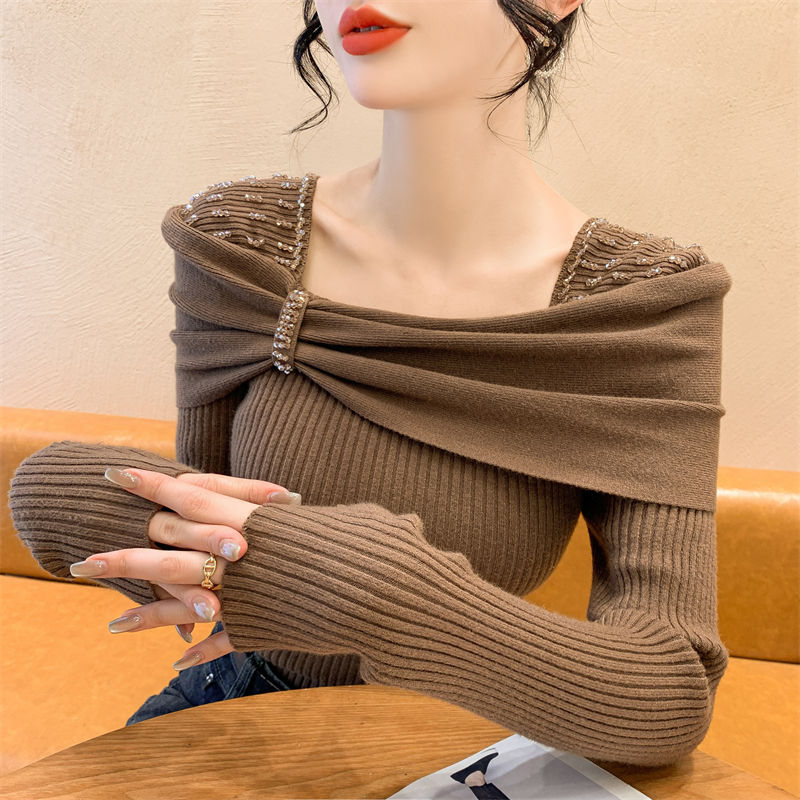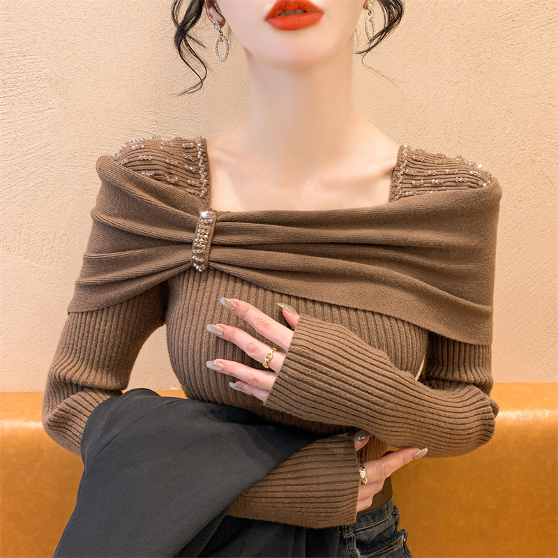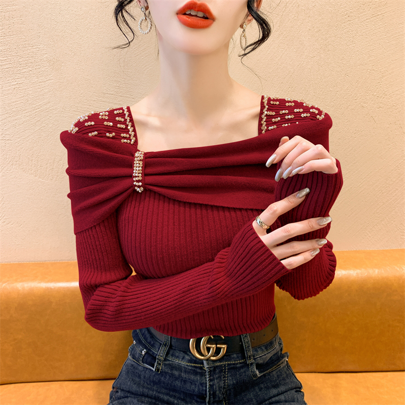 RM29696#钉钻法式气质蝴蝶结一字肩针织打底衫高级感秋冬新款毛衣上衣