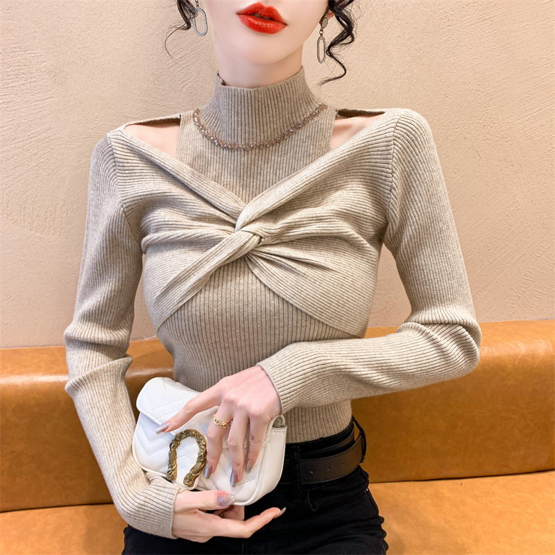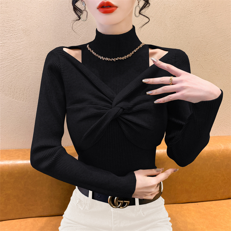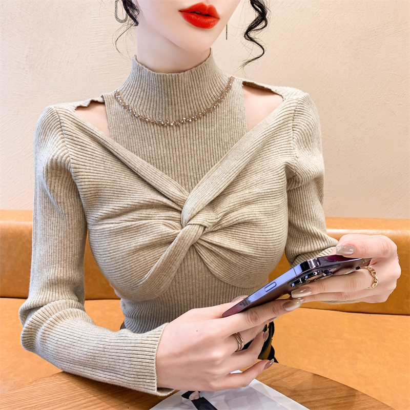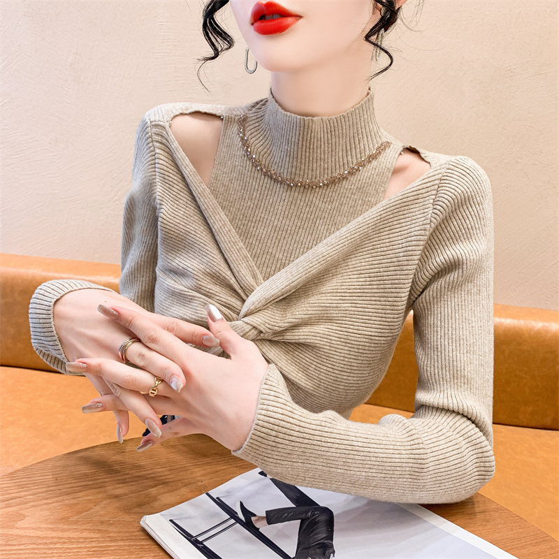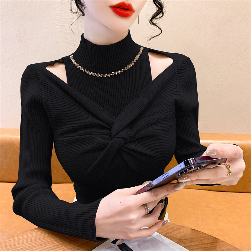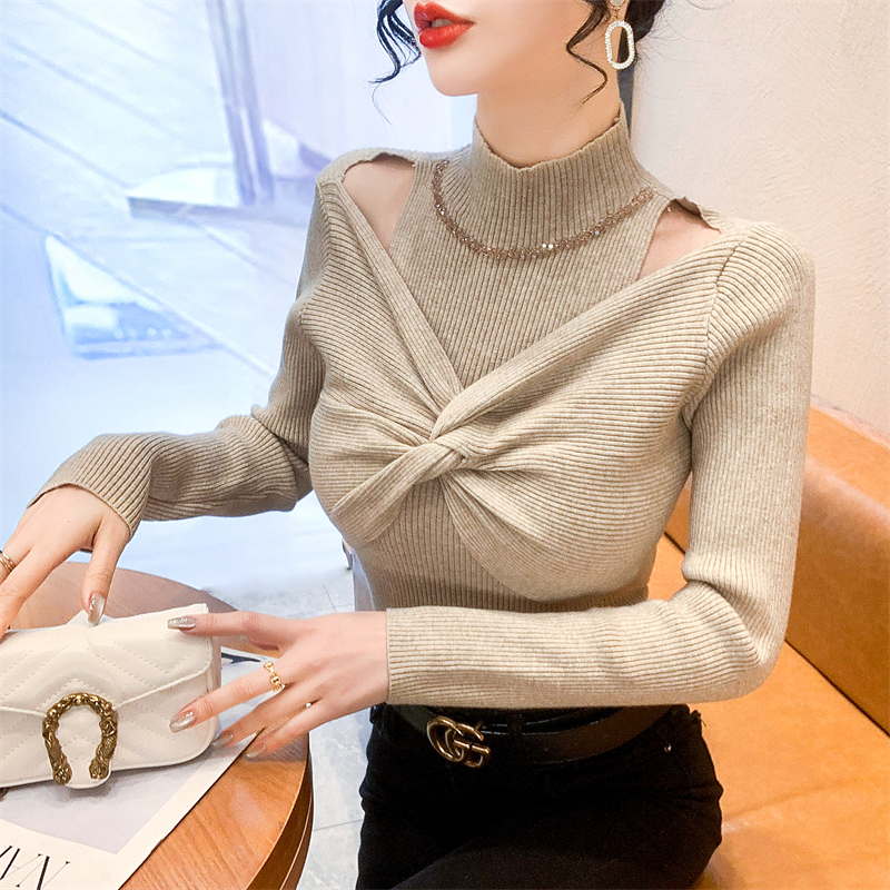 RM29698#高端钉钻漏肩镂空半高领扭结显瘦针织衫气质洋气打底衫女