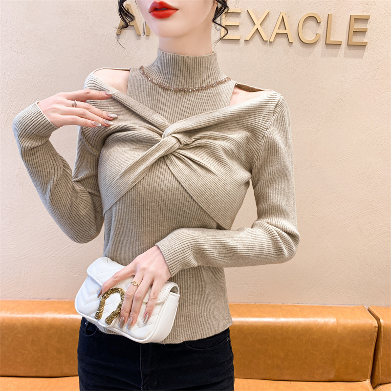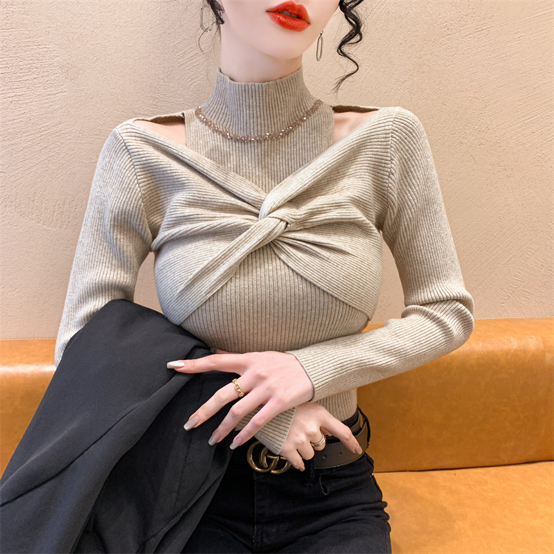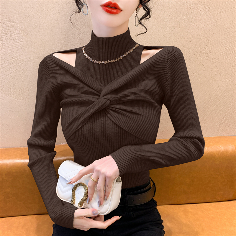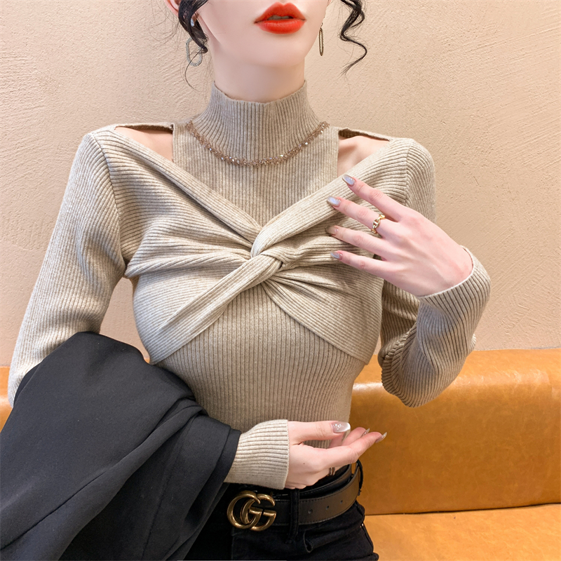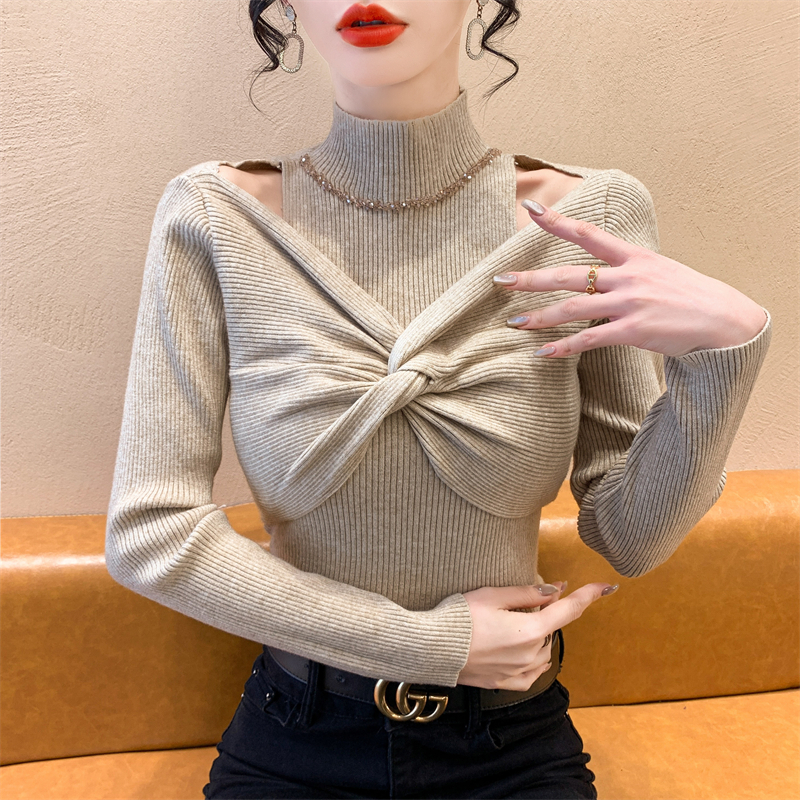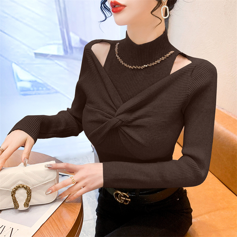 RM29698#高端钉钻漏肩镂空半高领扭结显瘦针织衫气质洋气打底衫女