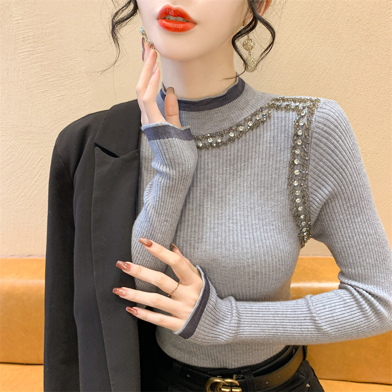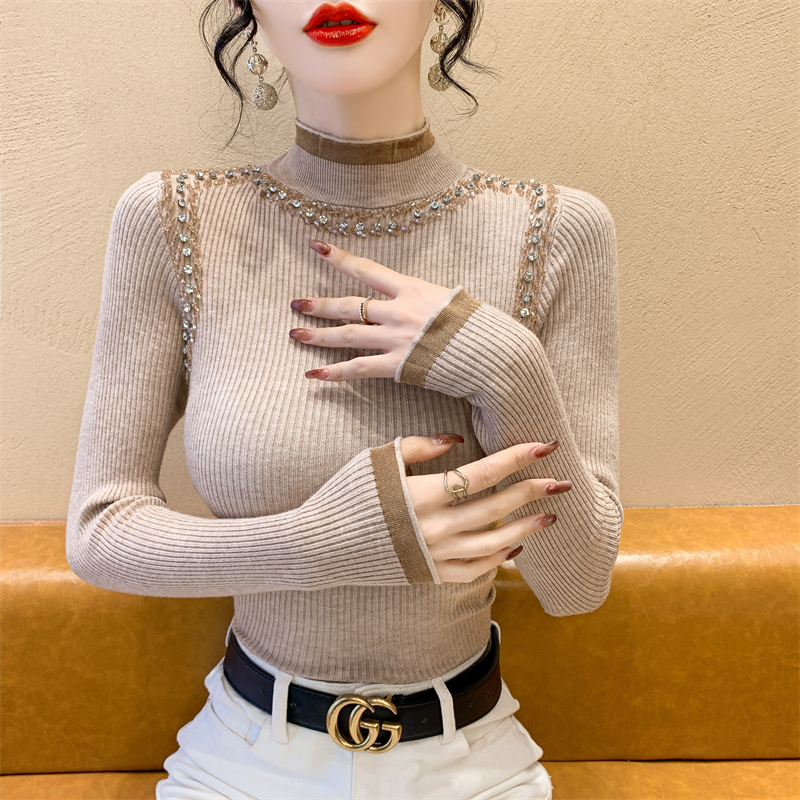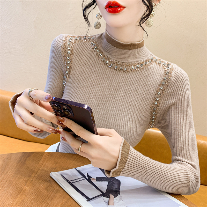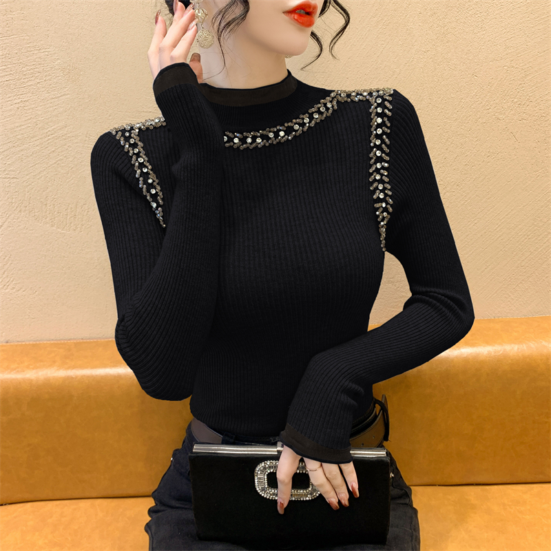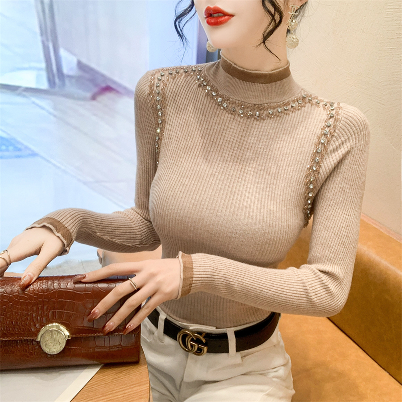 RM29703#重工钉钻半高领打底针织衫洋气内搭设计网纱蕾丝毛衣女