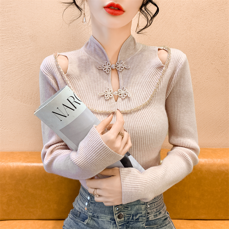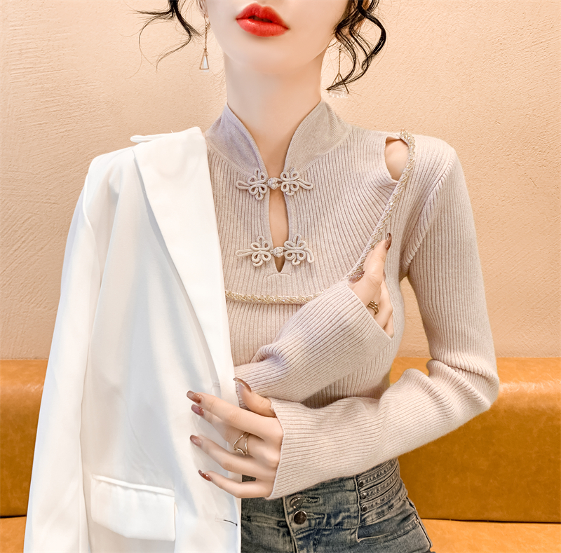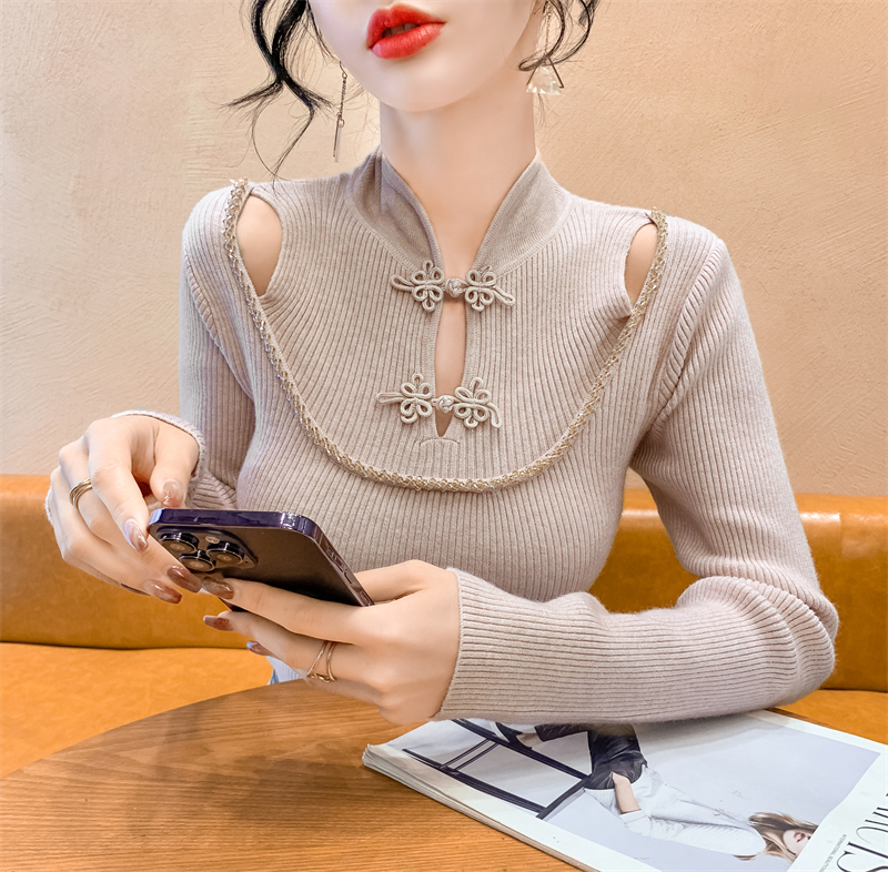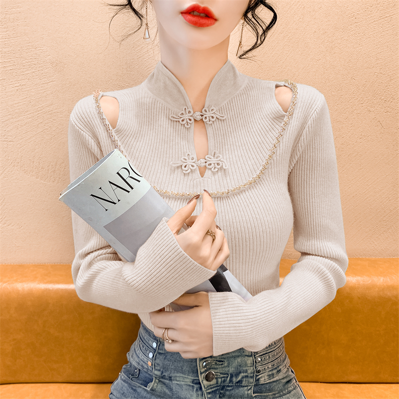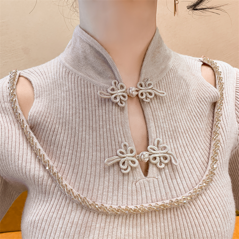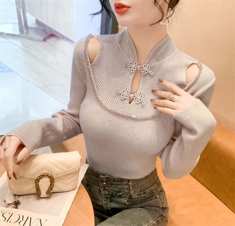 RM29704#钉钻新中式假两件盘扣镂空针织衫性感露肩短款毛衣