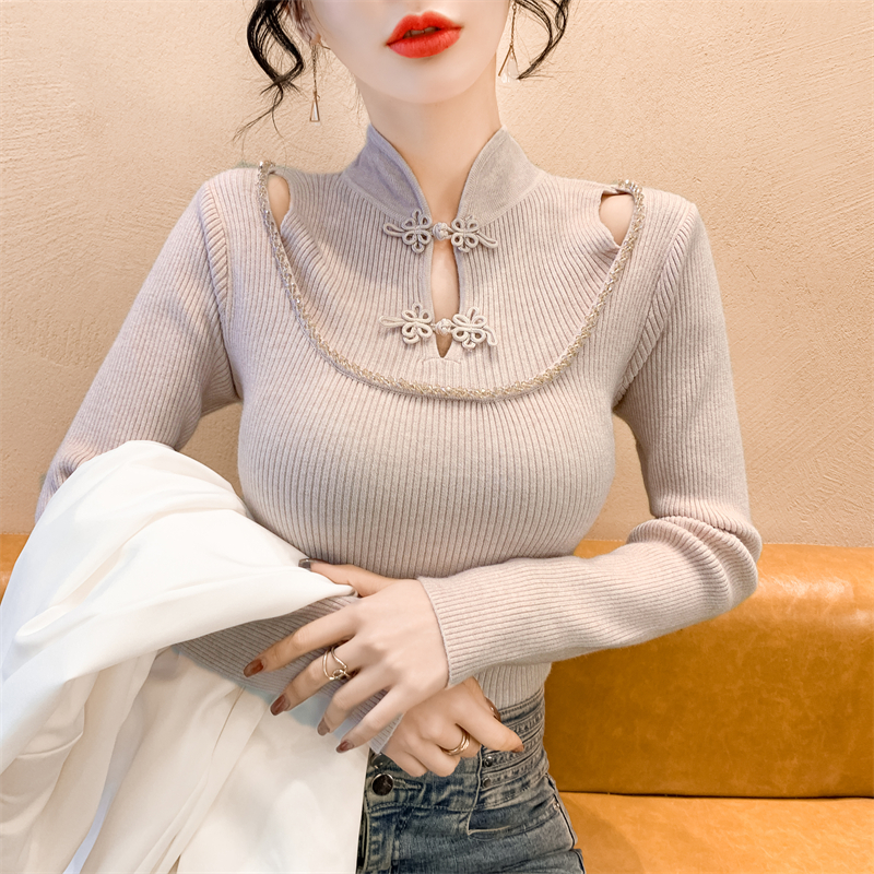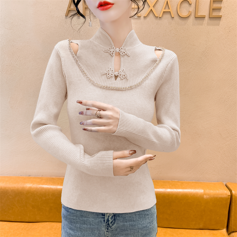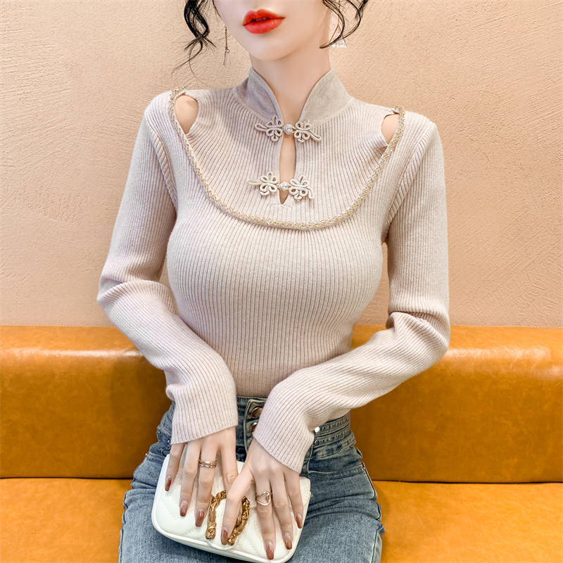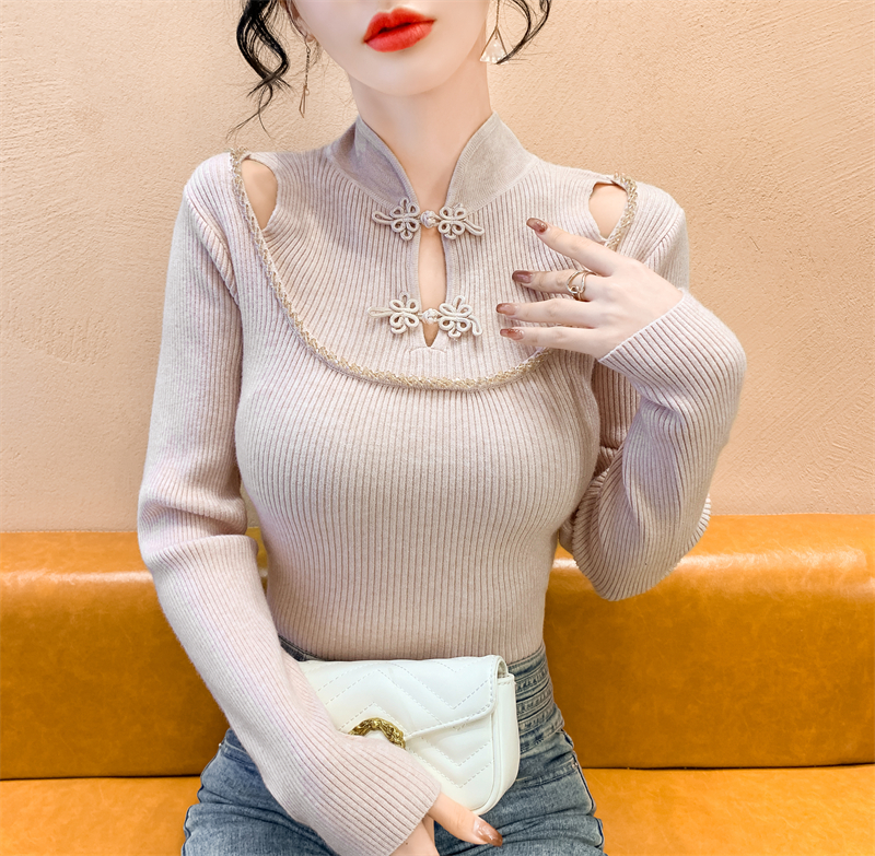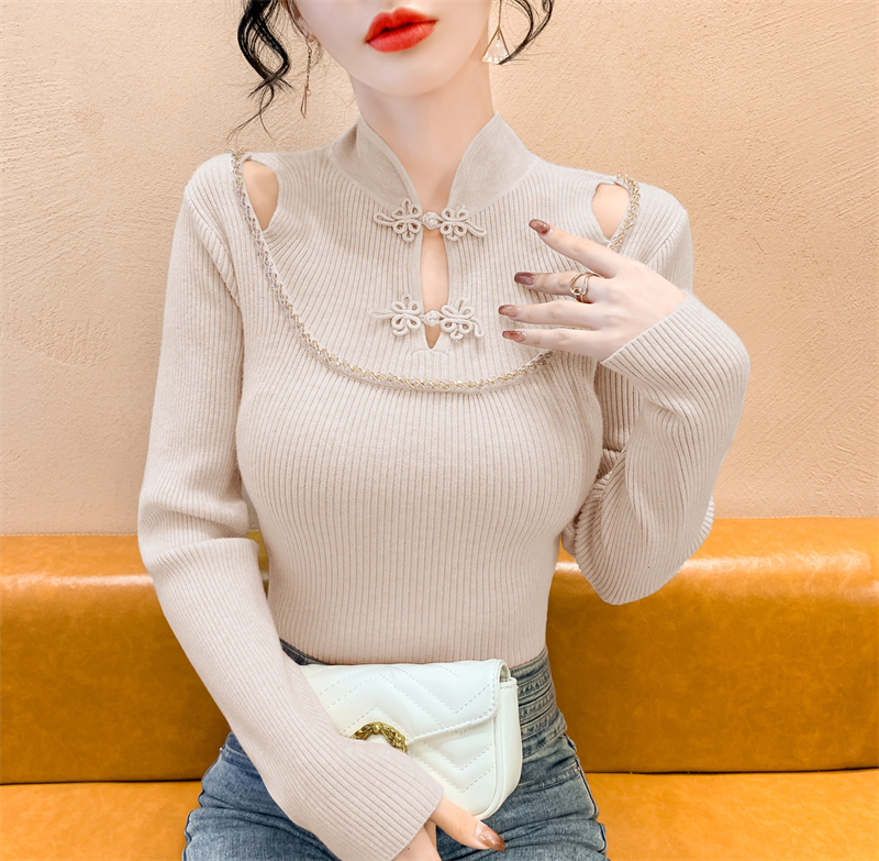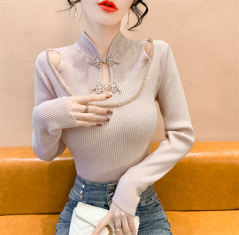 RM29704#钉钻新中式假两件盘扣镂空针织衫性感露肩短款毛衣