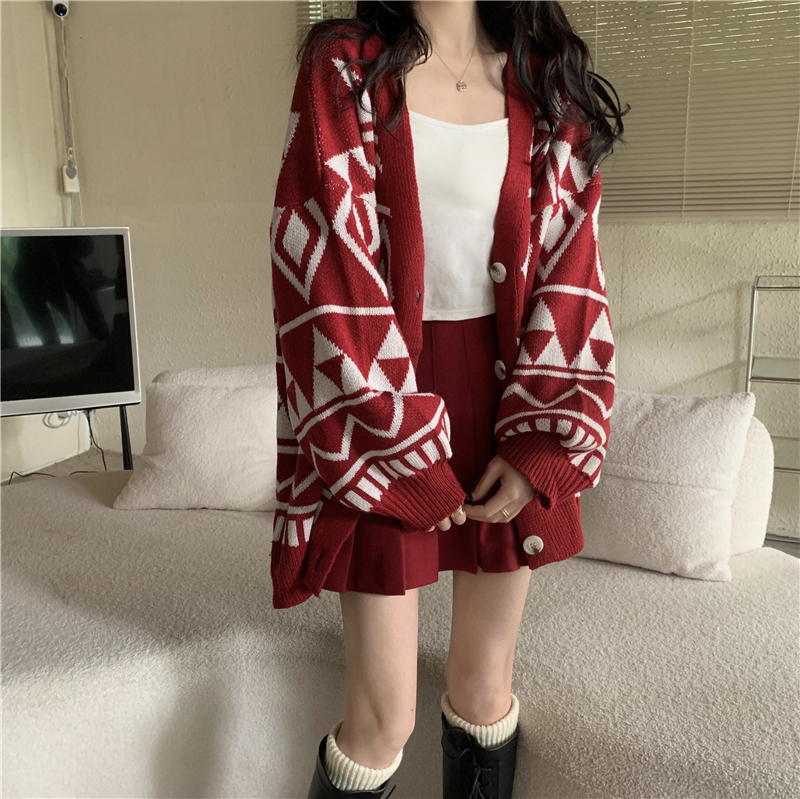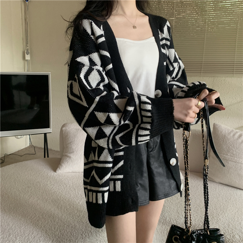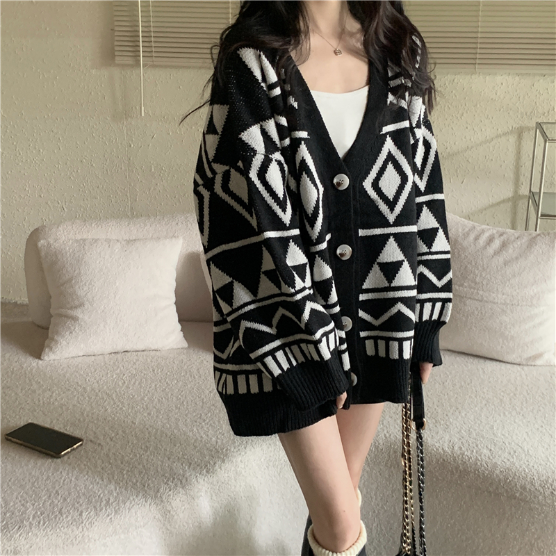 RM29726#新款菱形针织开衫慵懒宽松中长款毛衣外套