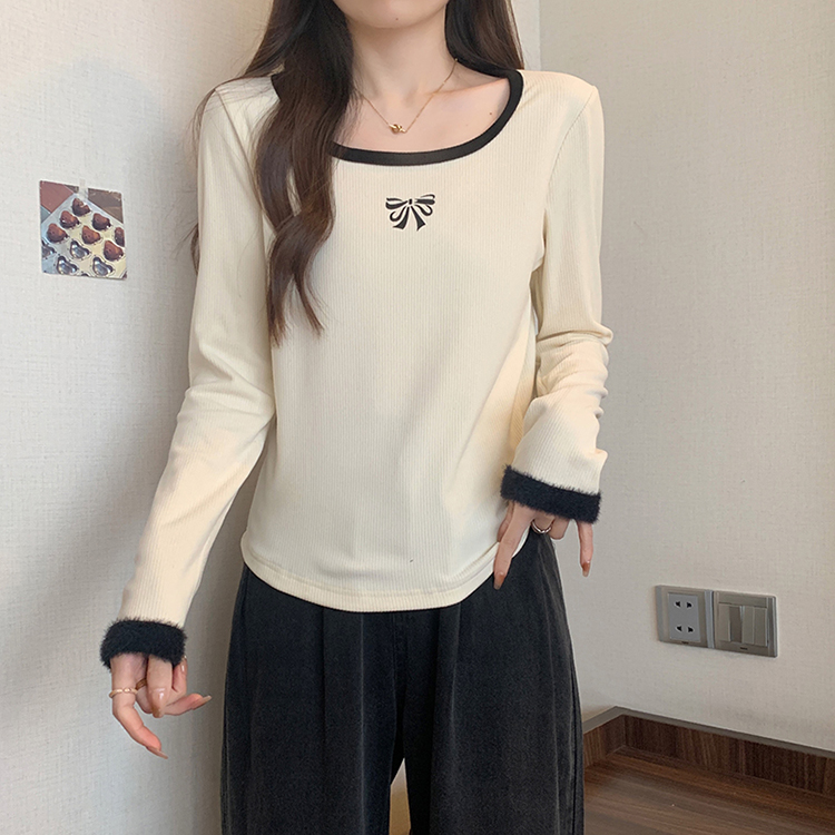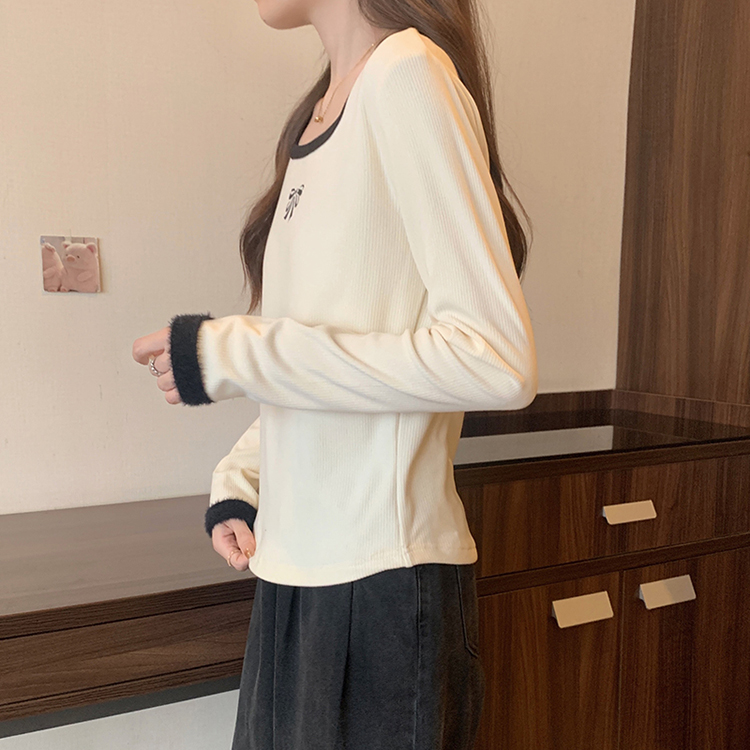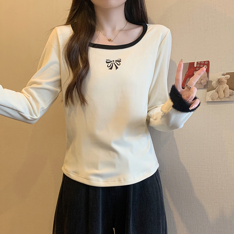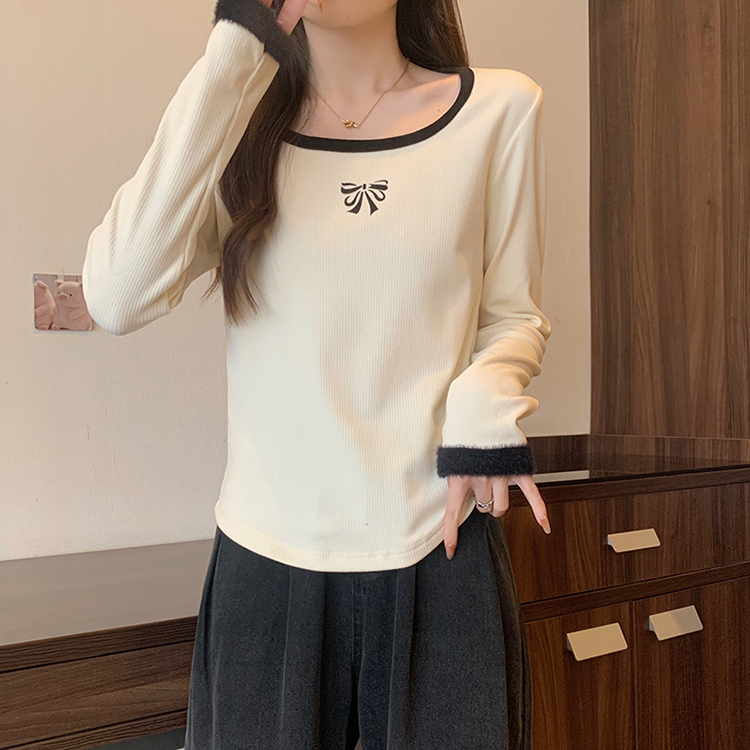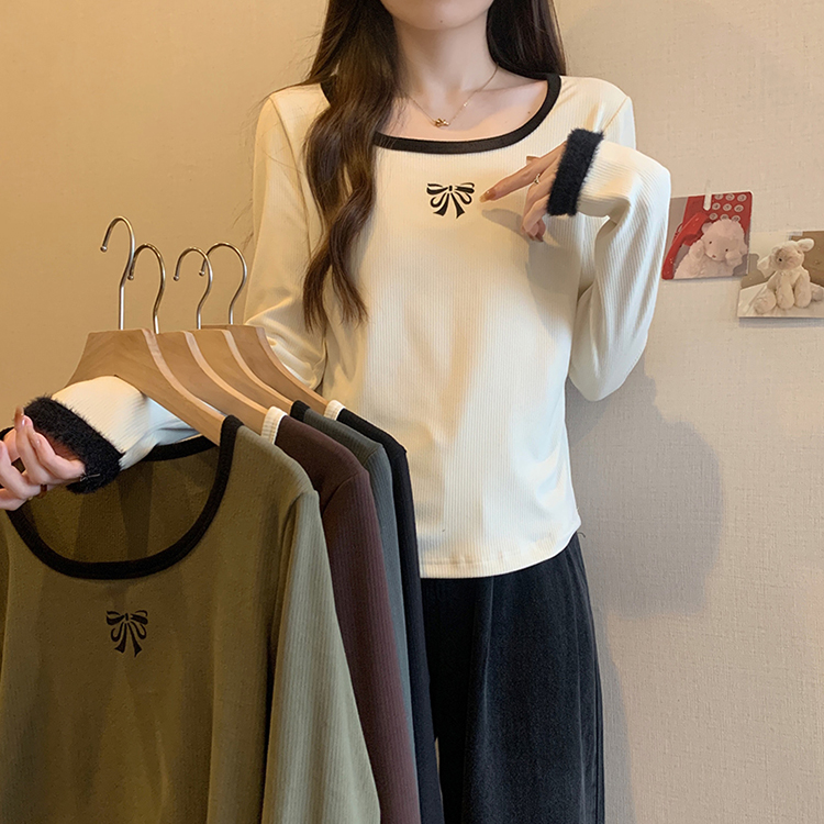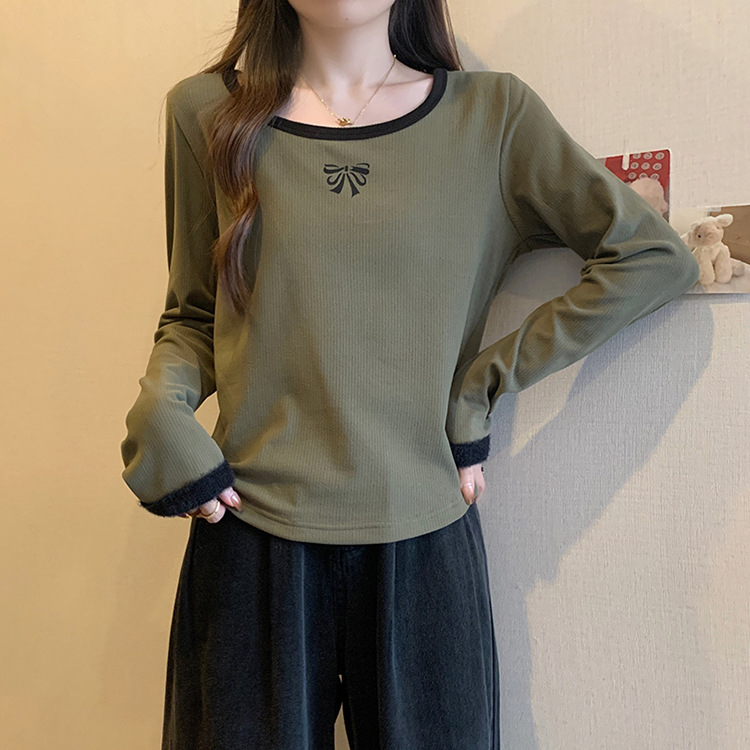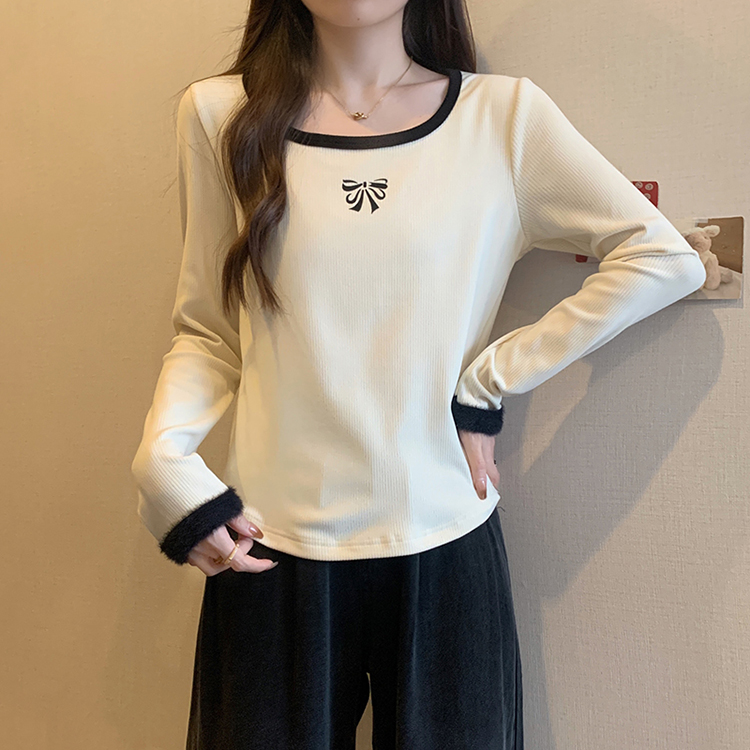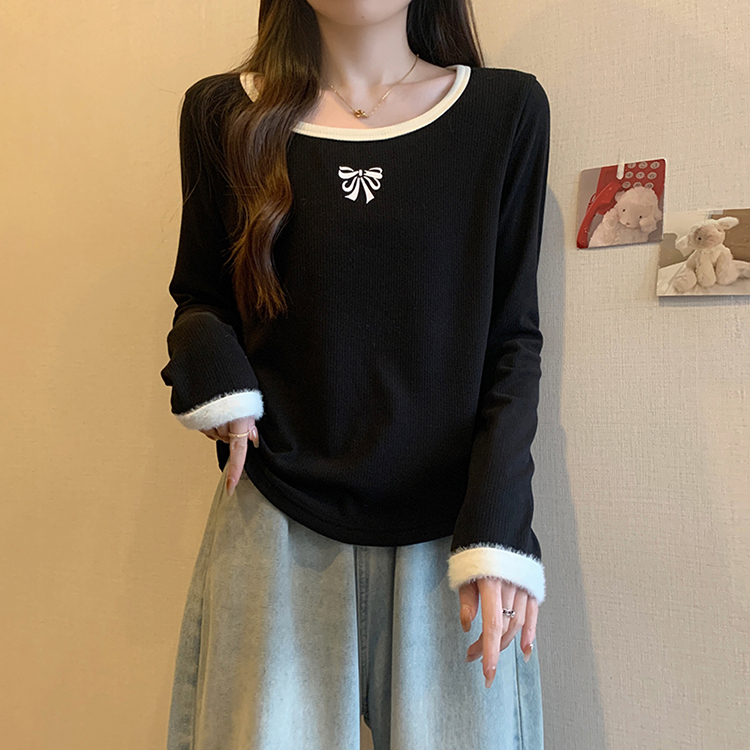 RM29730#新款胖mm百搭加厚保暖印花长袖毛毛袖边打底T恤上衣