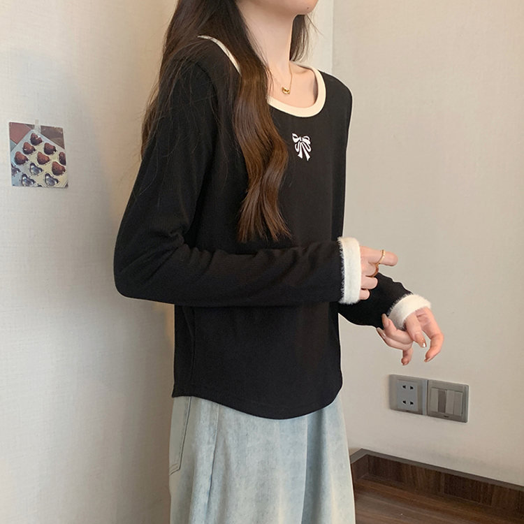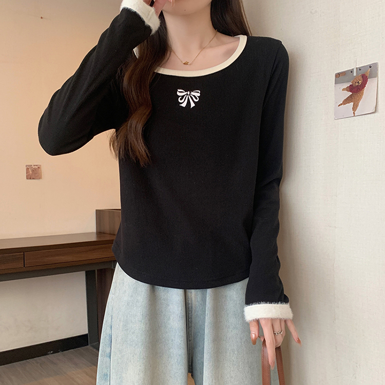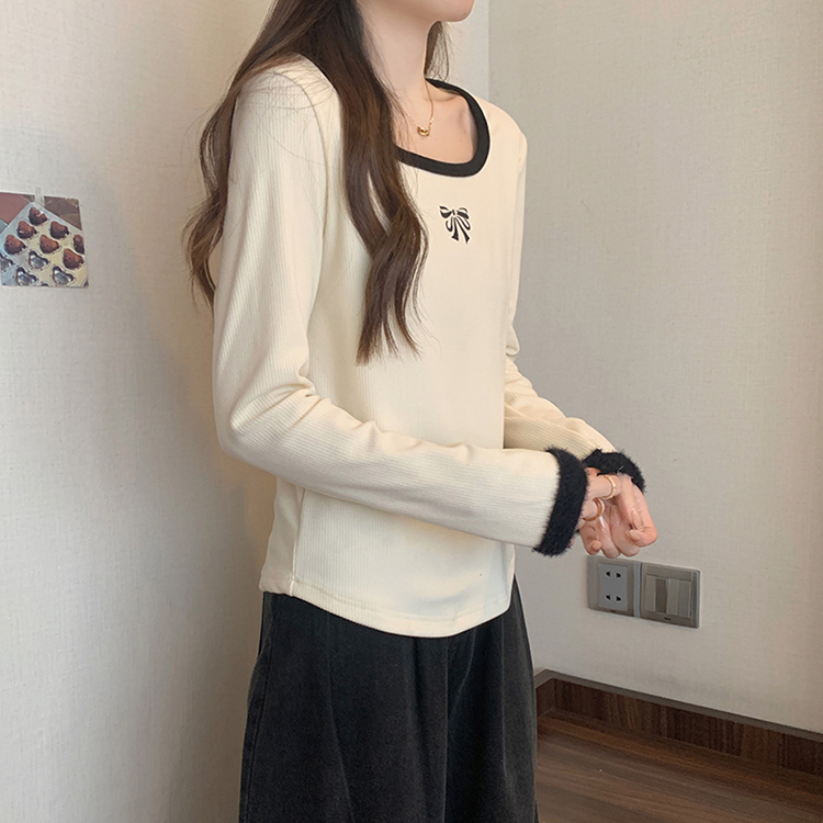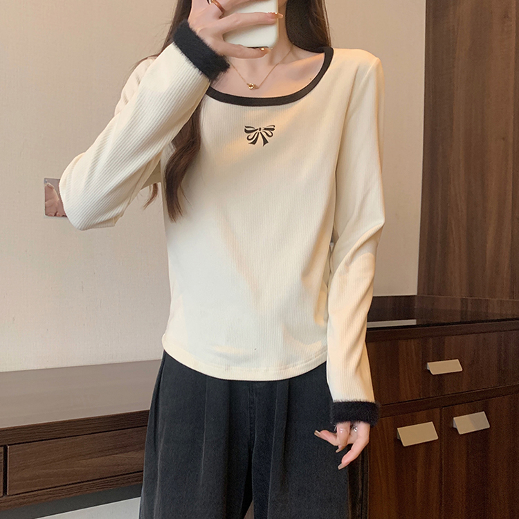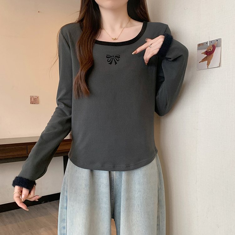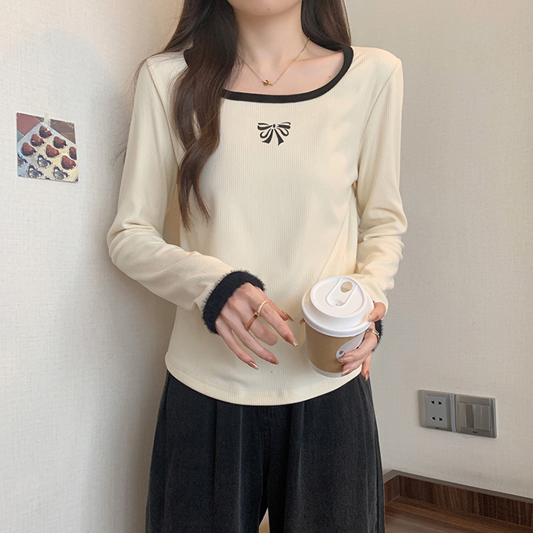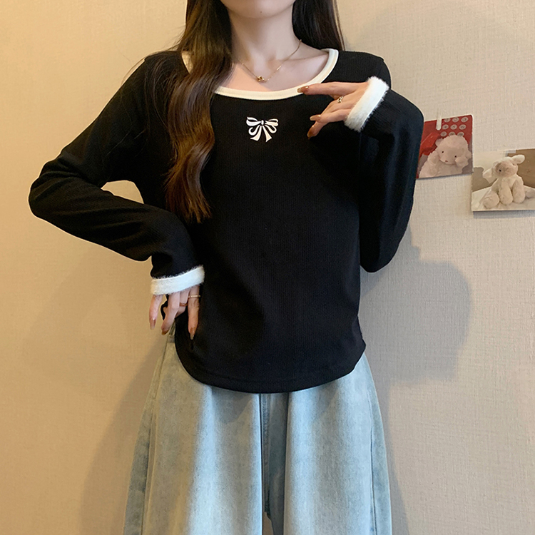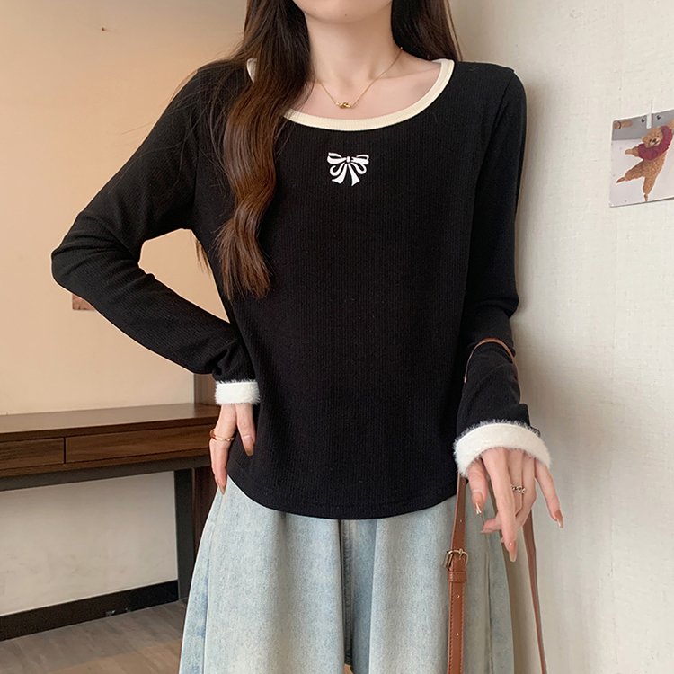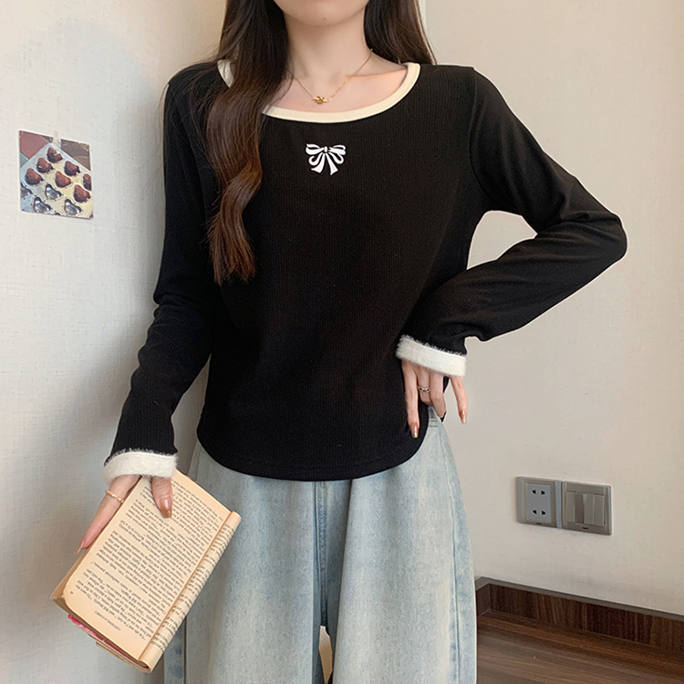 RM29730#新款胖mm百搭加厚保暖印花长袖毛毛袖边打底T恤上衣