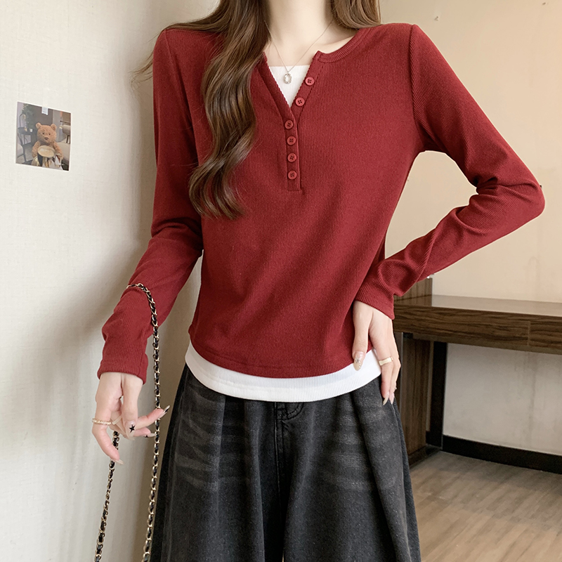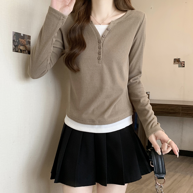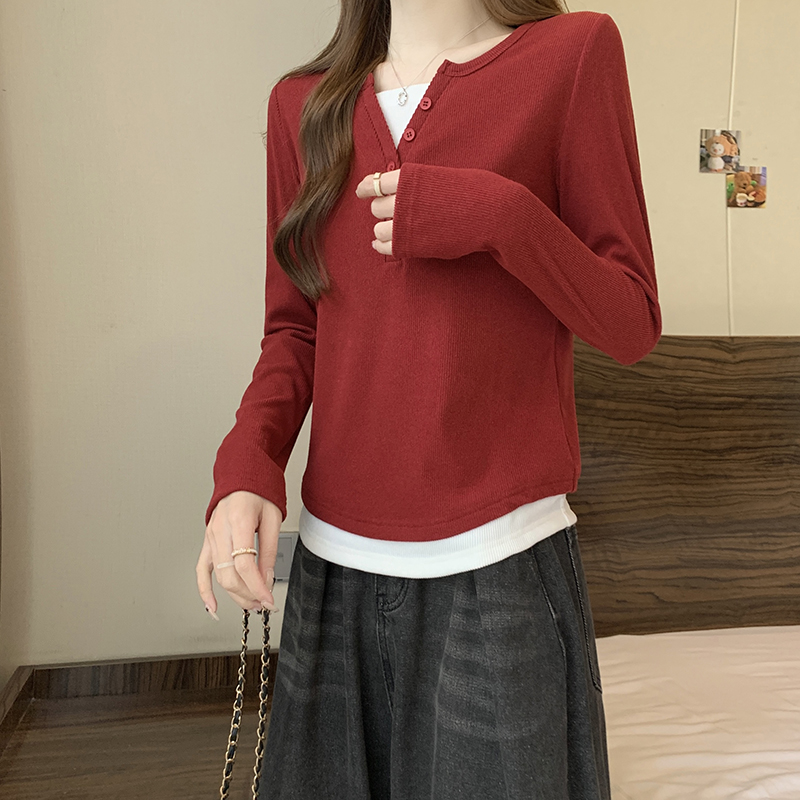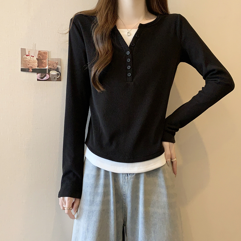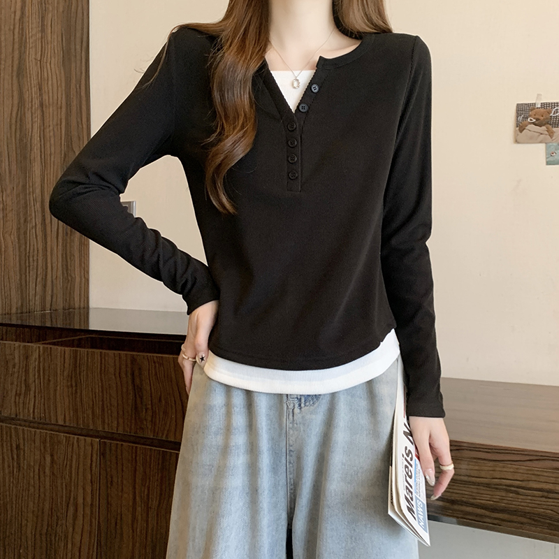 RM29731#新款胖mm辣妹百搭设计感假两件外穿正肩打底T恤上衣