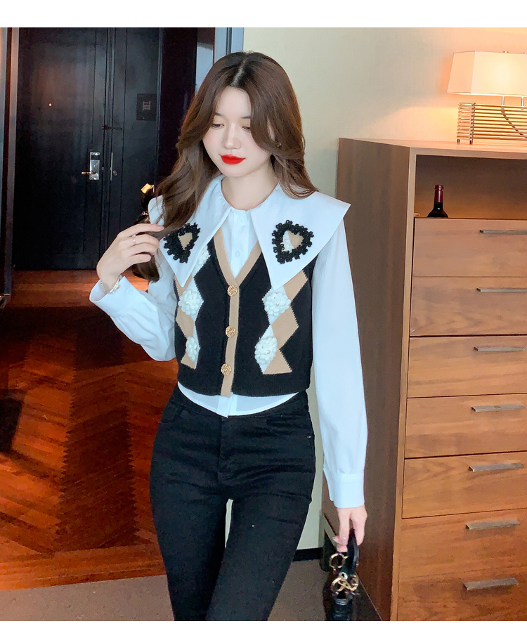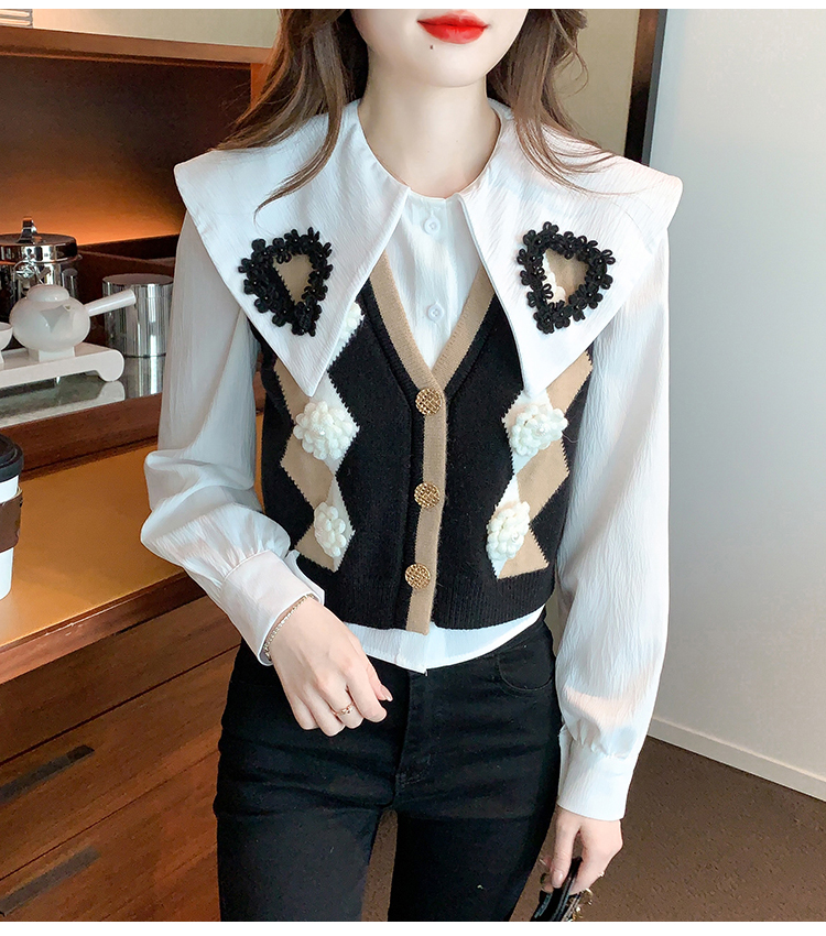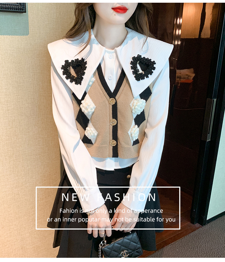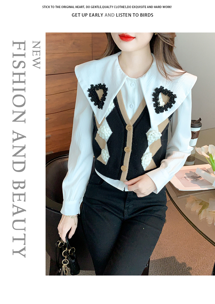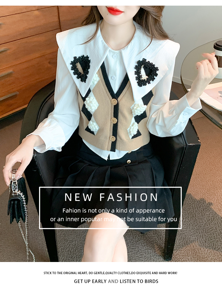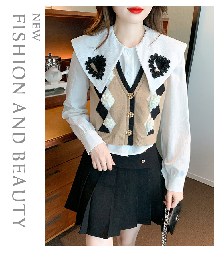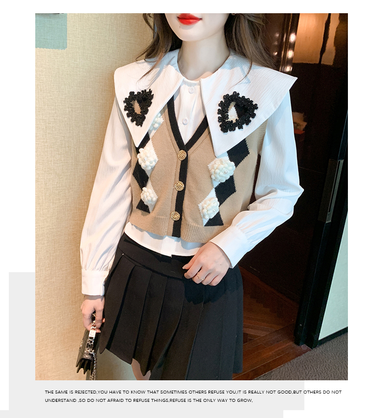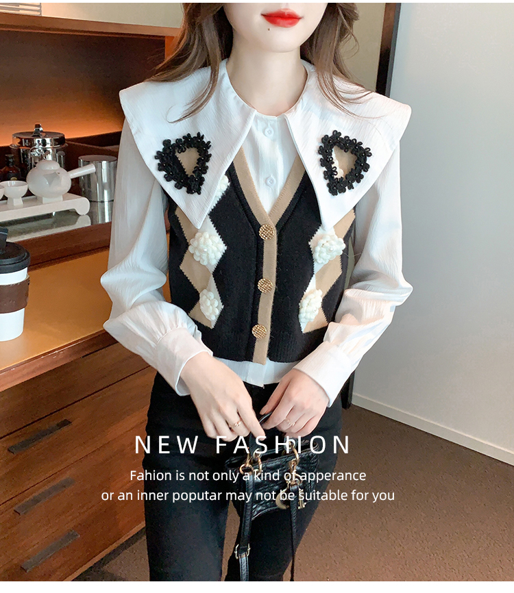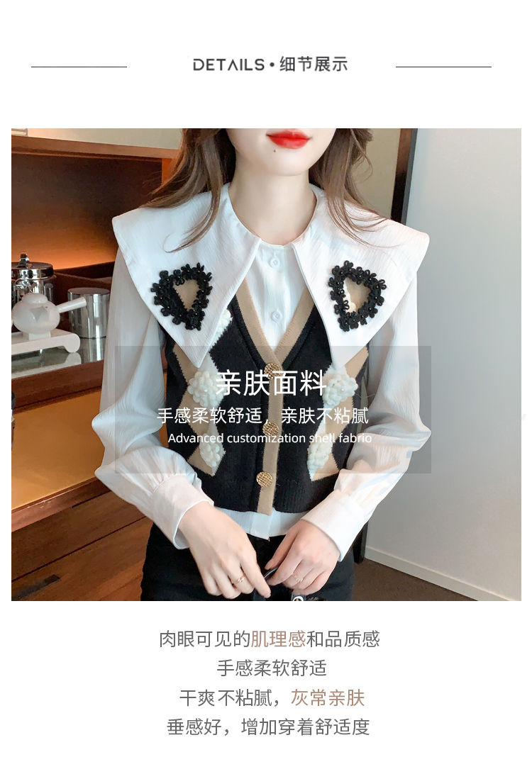 RM29747#娃娃领衬衫+超重工针织马甲两件套上衣女