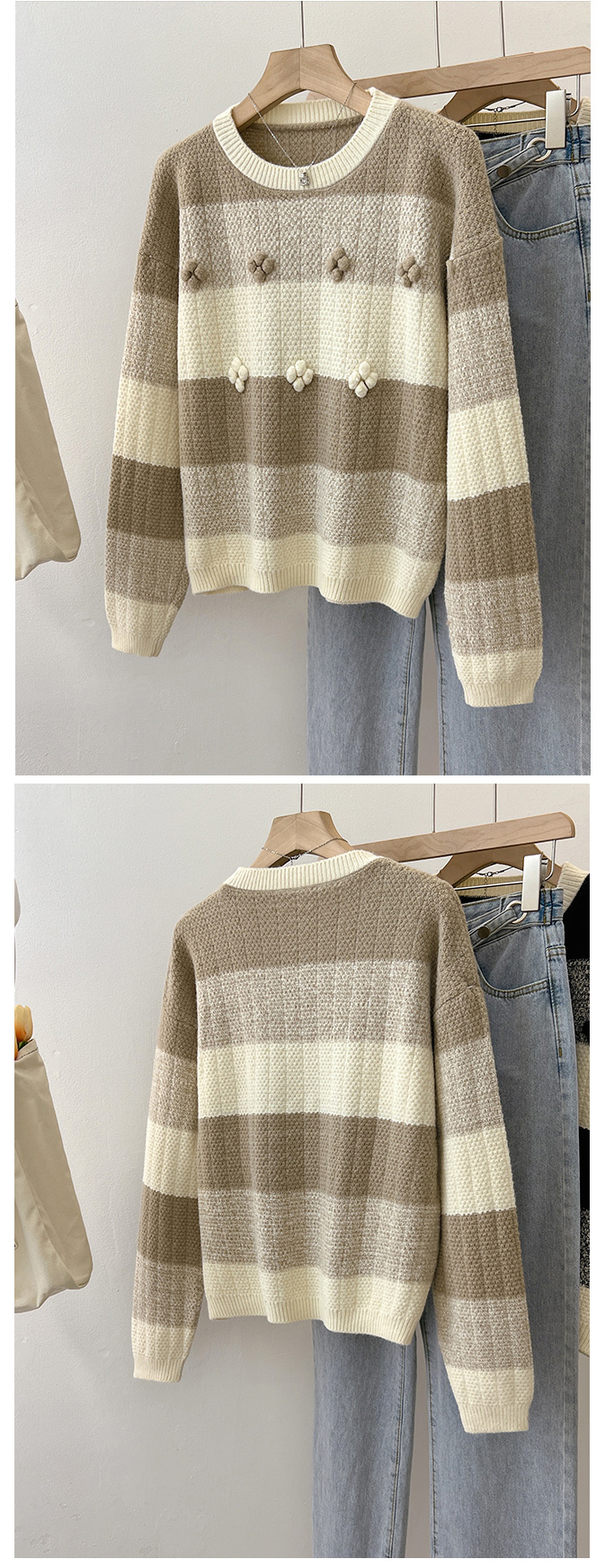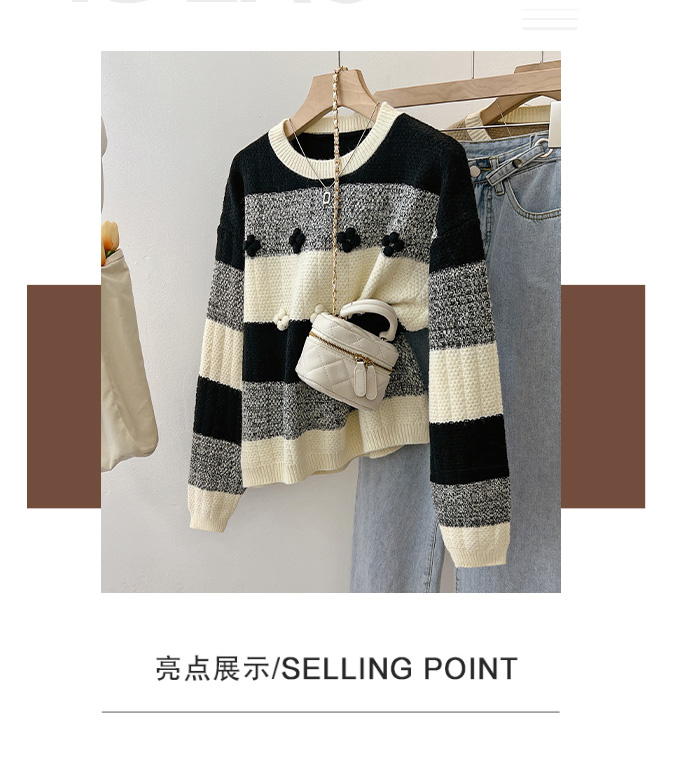 RM29758#慵懒风条纹套头毛衣女2023秋冬新款宽松软糥圆领花朵针织衫