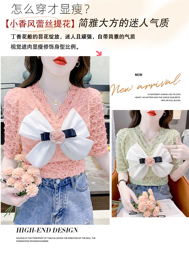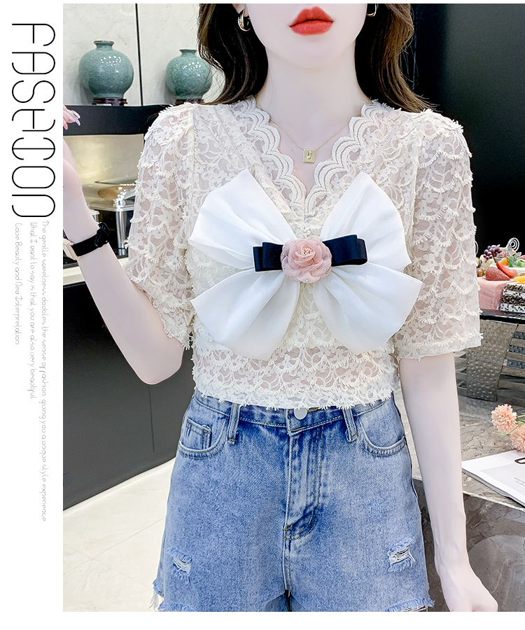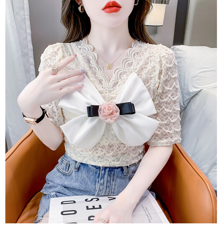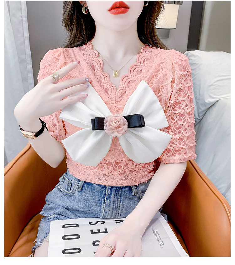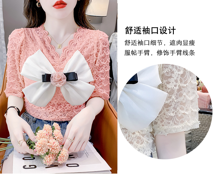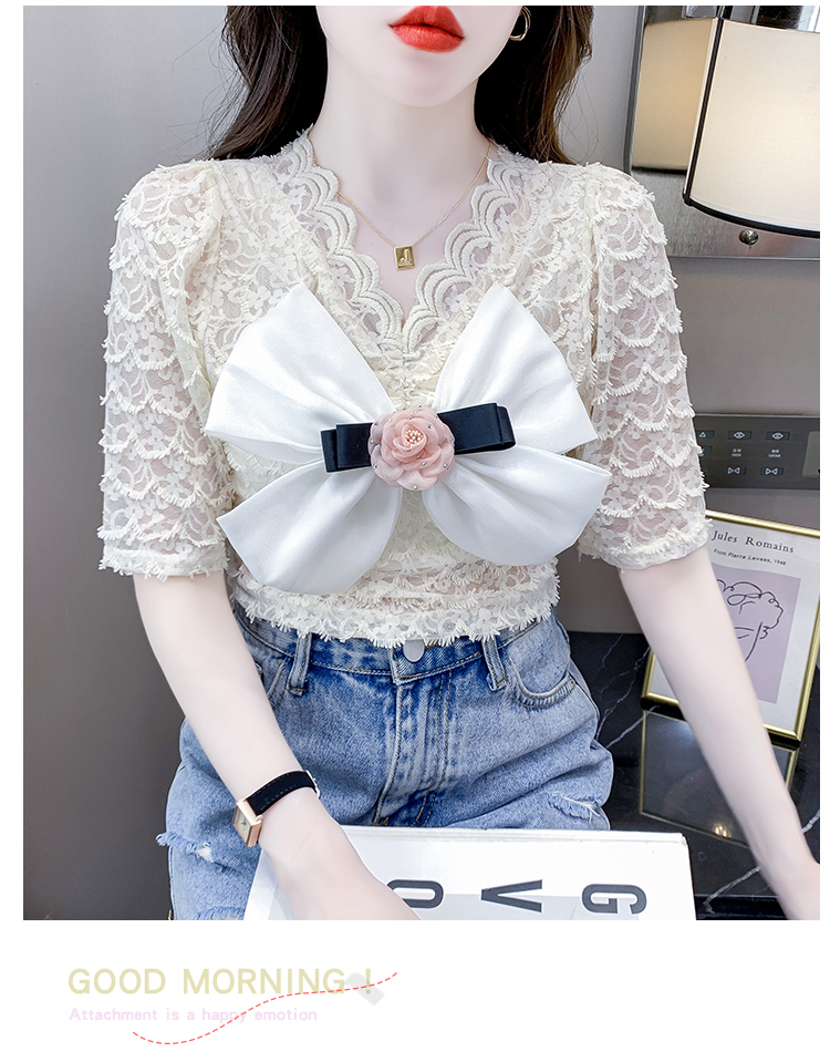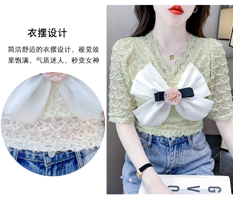 RM29848#短袖夏季蕾丝性感镂空女装蝴蝶结装饰洋气新款V领通勤