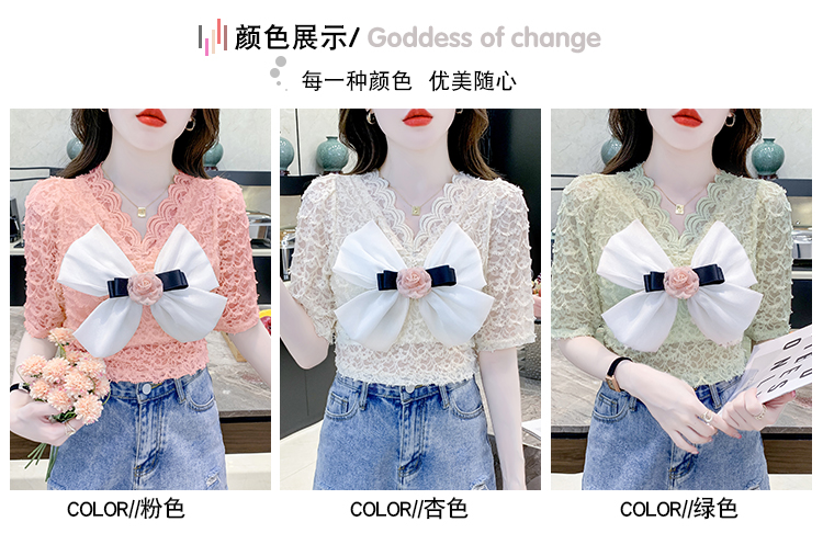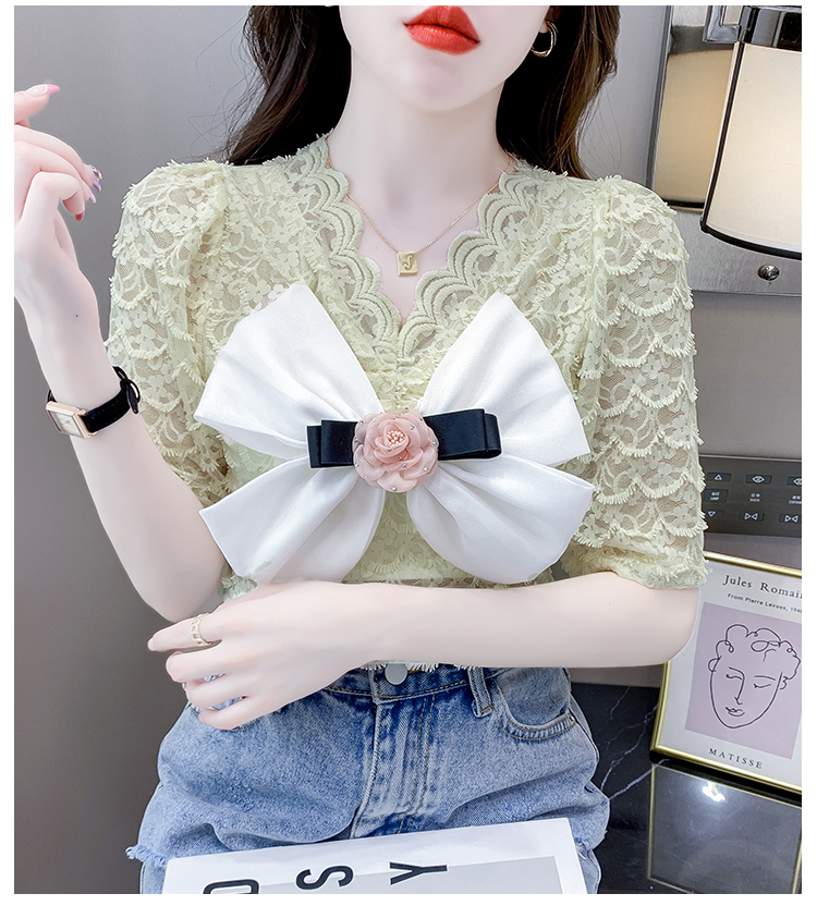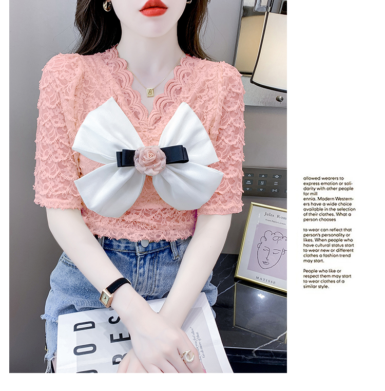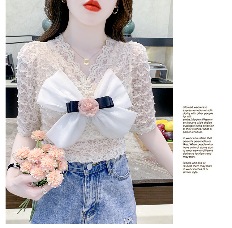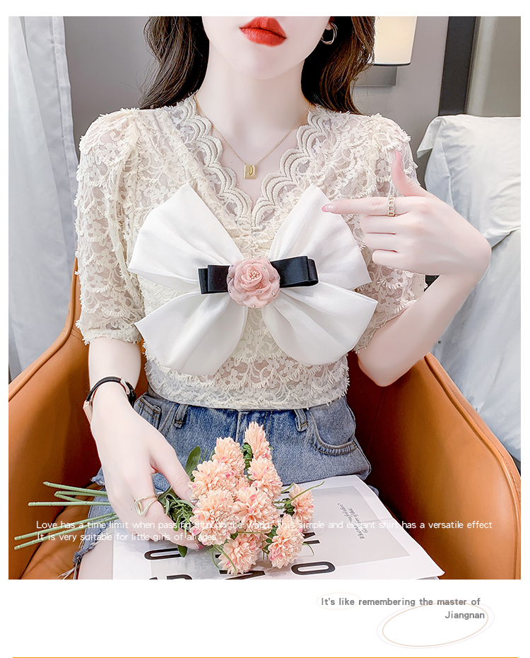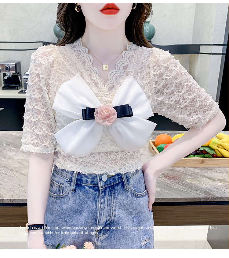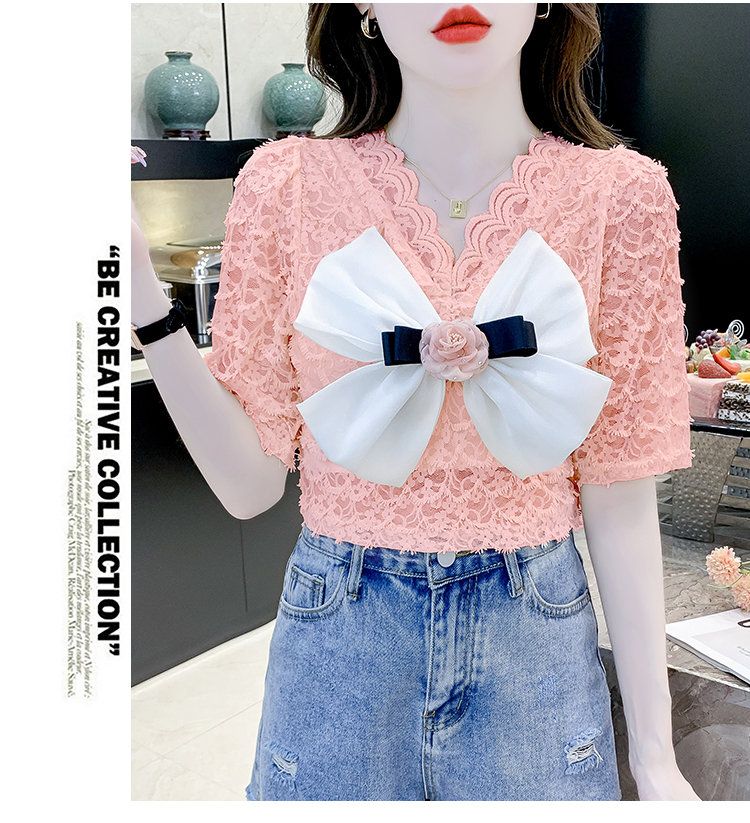 RM29848#短袖夏季蕾丝性感镂空女装蝴蝶结装饰洋气新款V领通勤