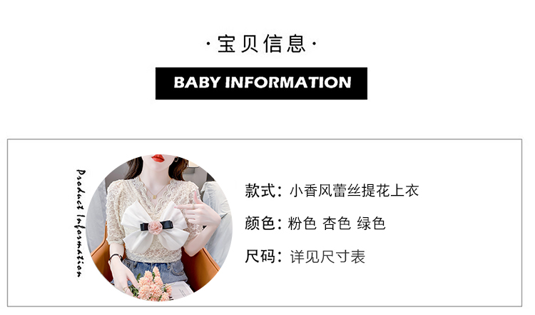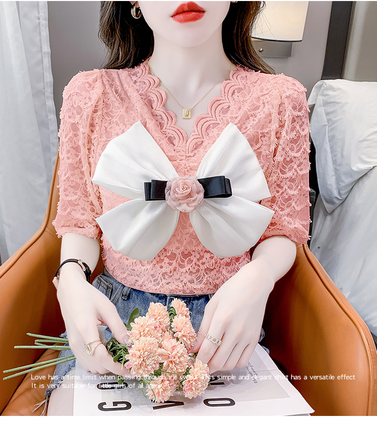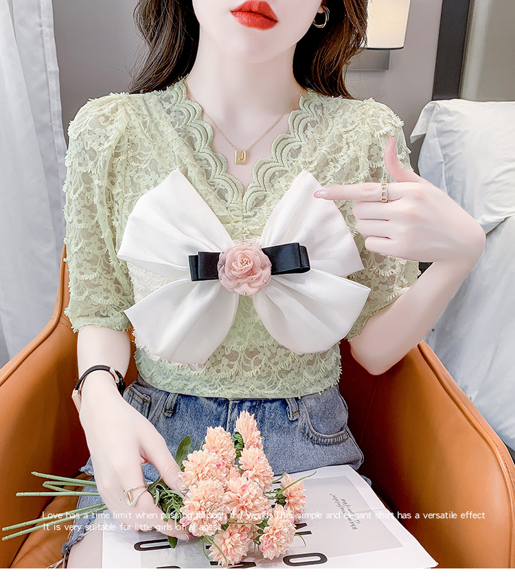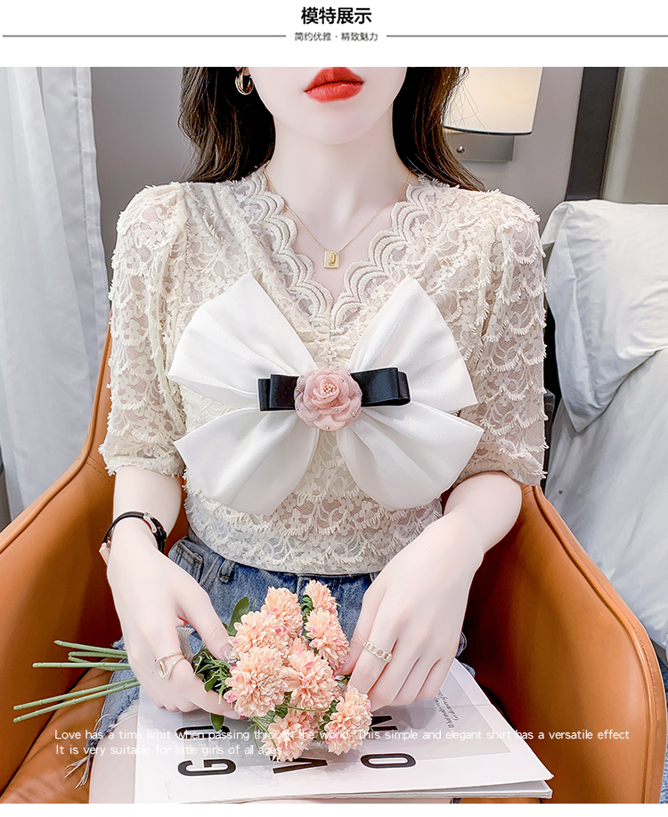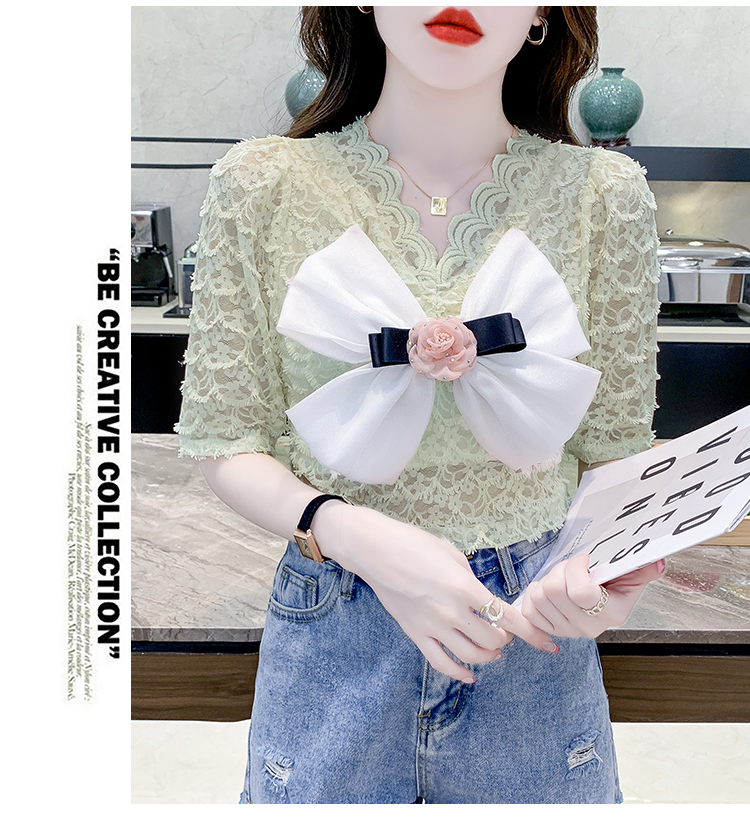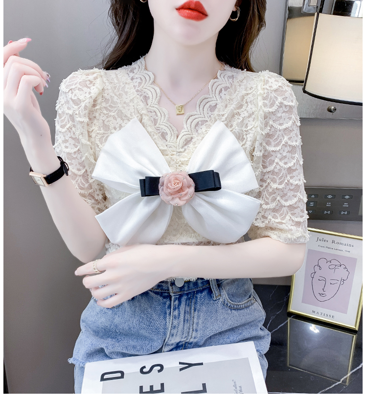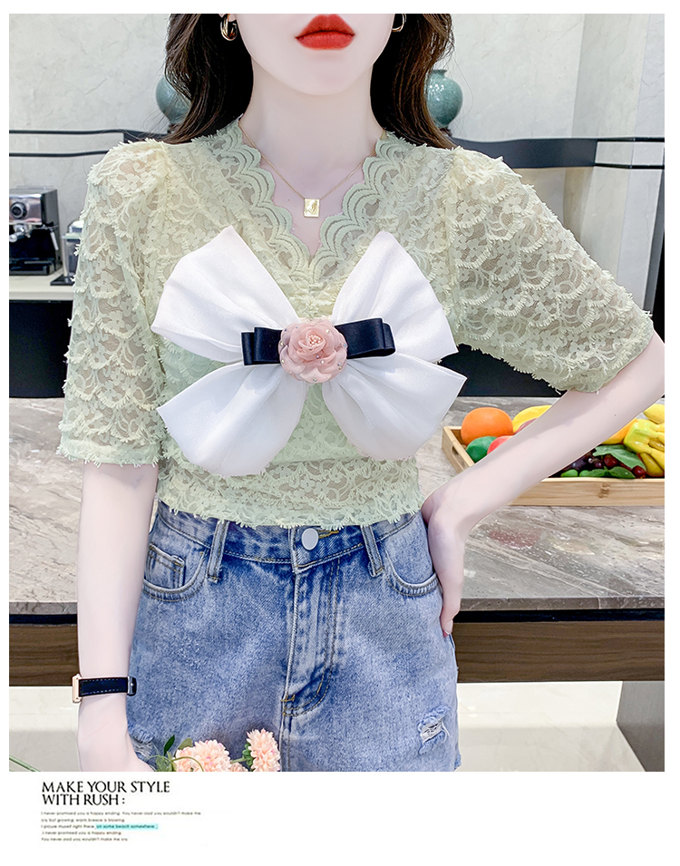 RM29848#短袖夏季蕾丝性感镂空女装蝴蝶结装饰洋气新款V领通勤