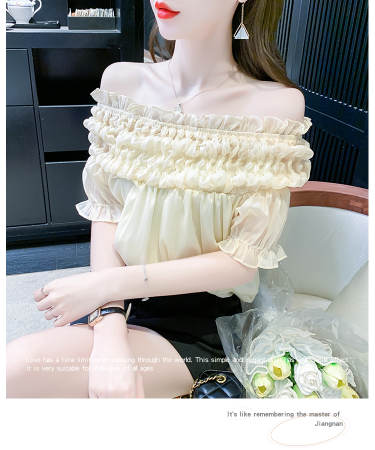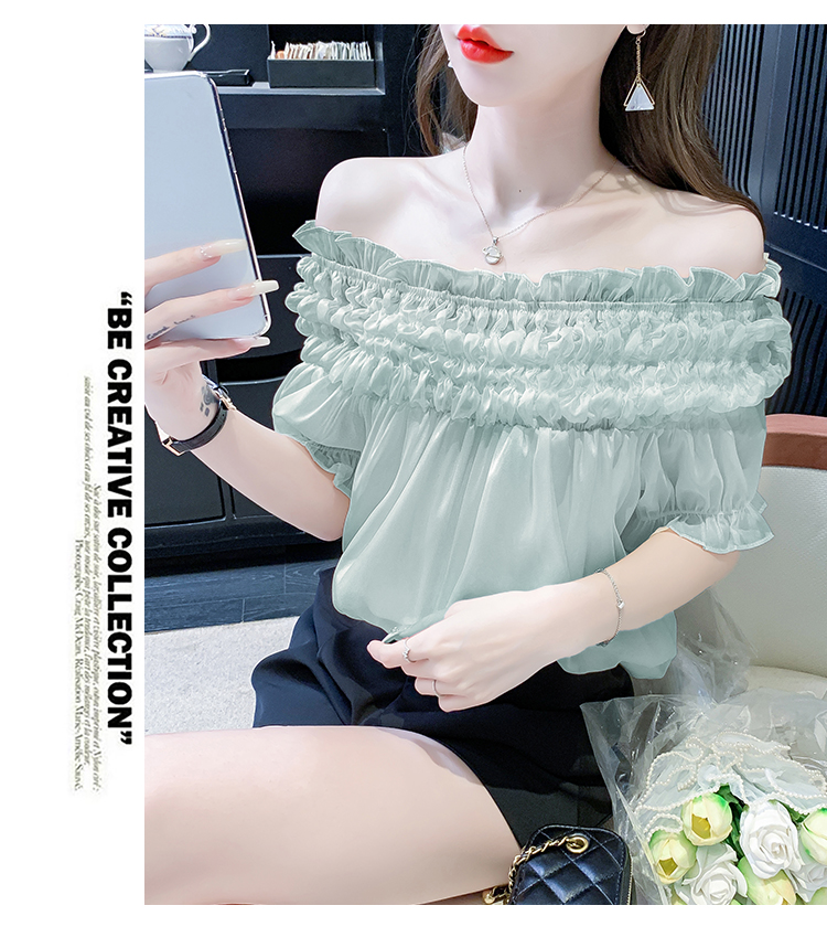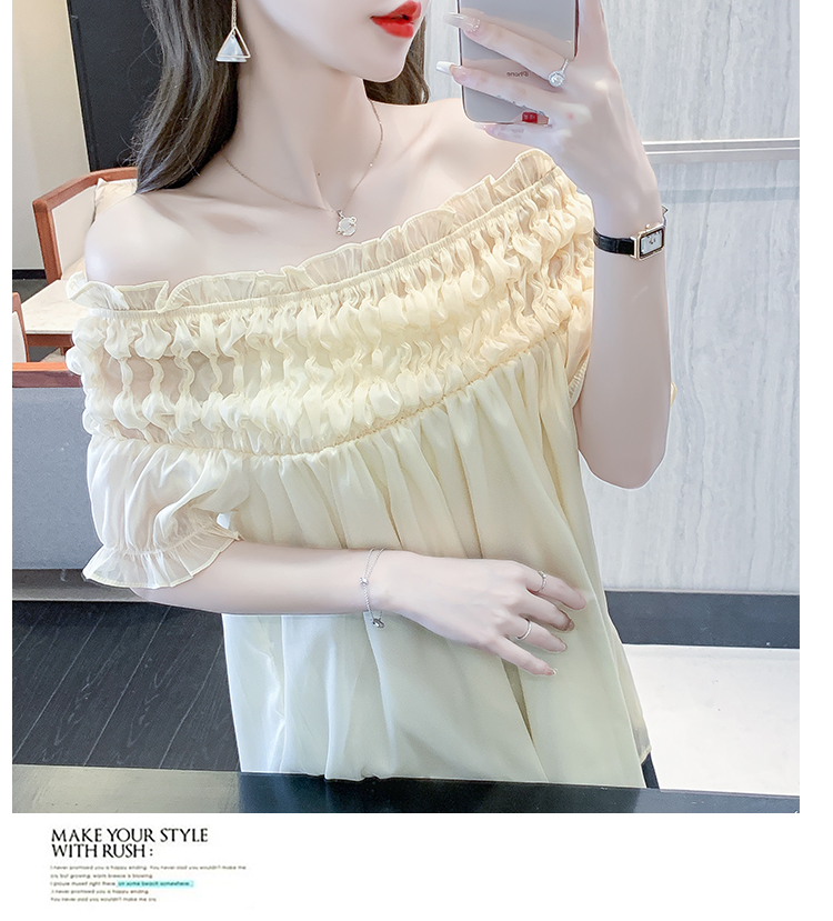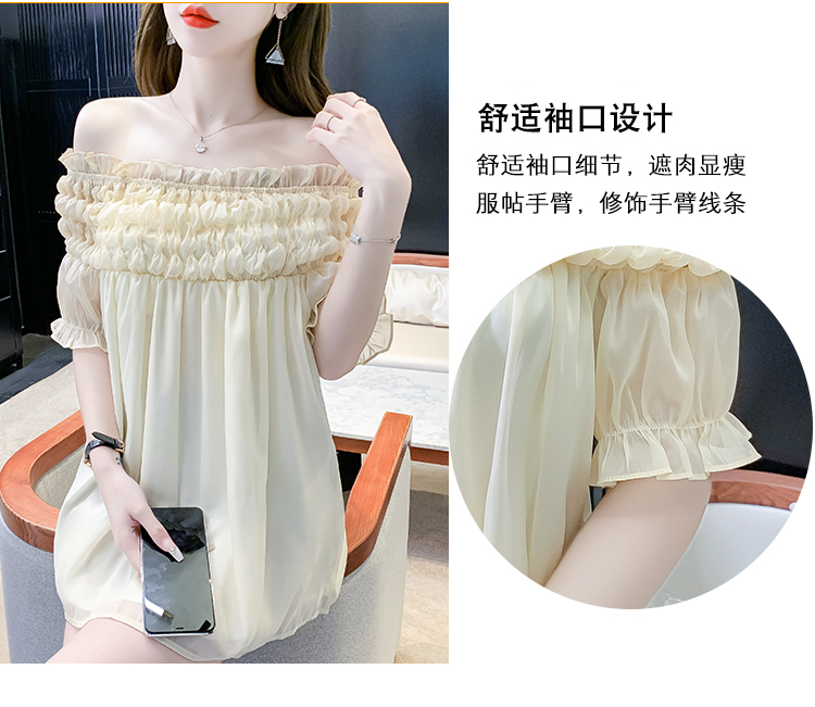 RM29849#短袖一字领上衣雪纺衫修身显瘦中长纯色褶皱修身 超仙女装