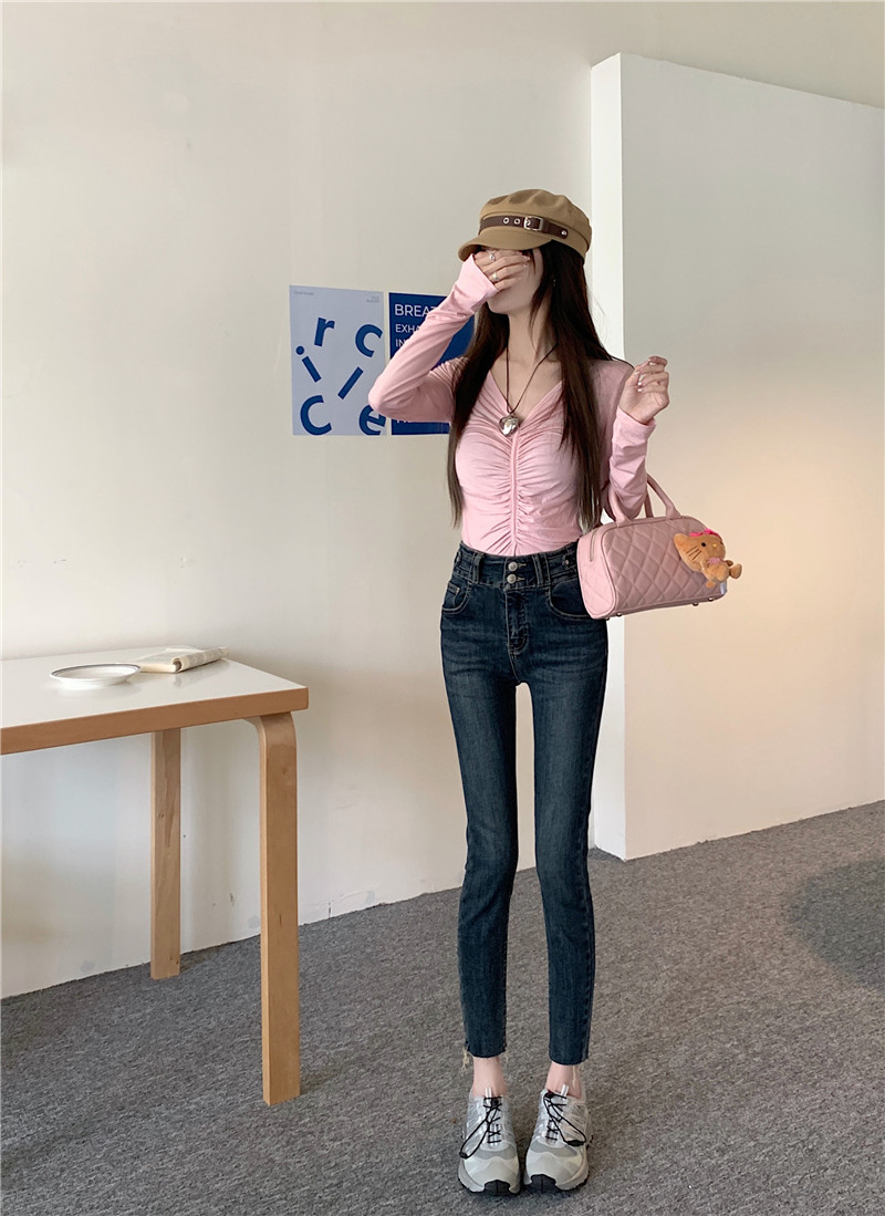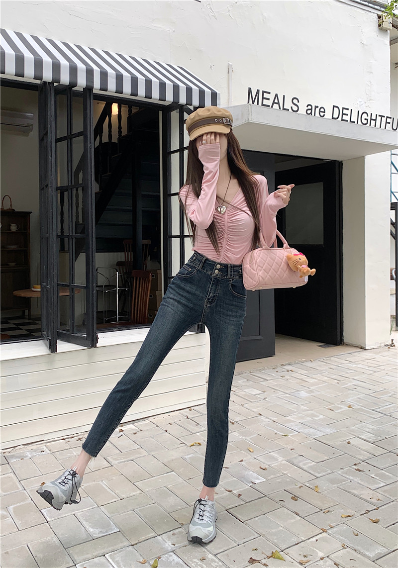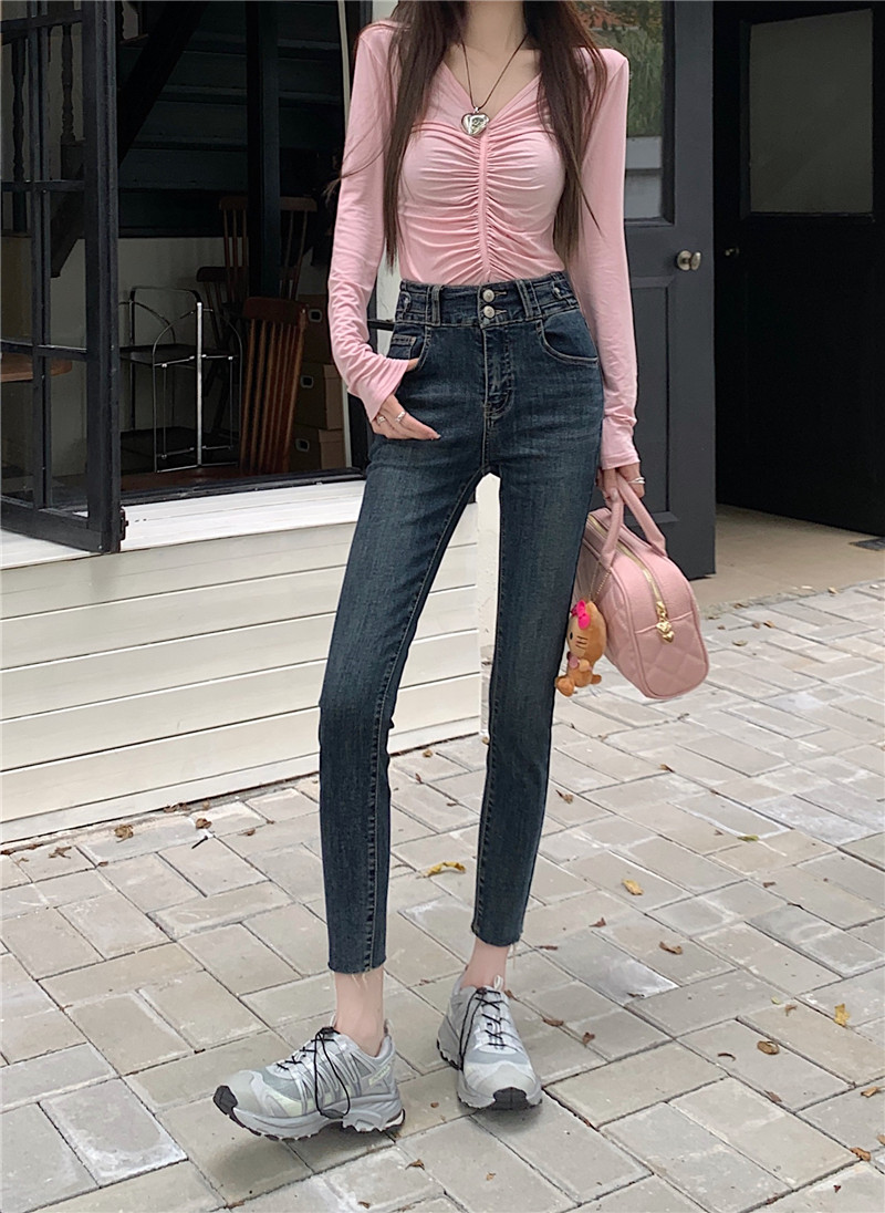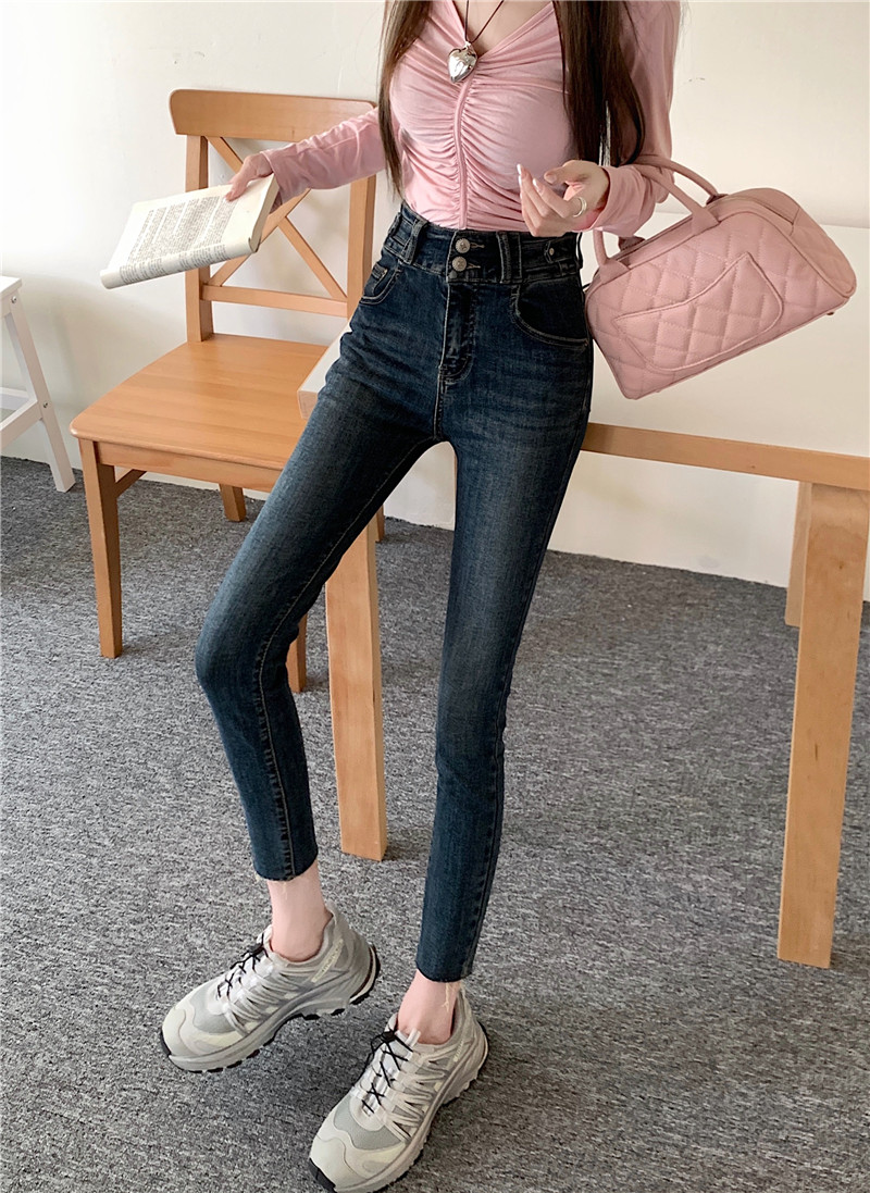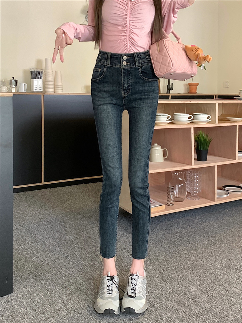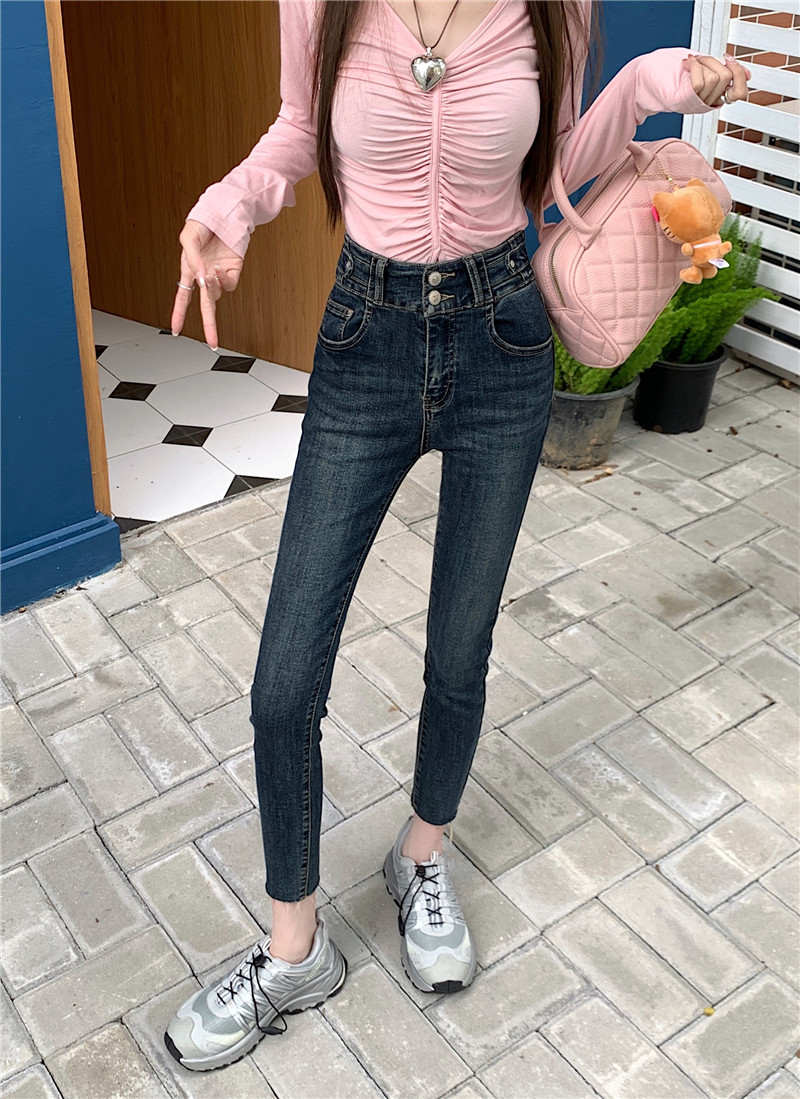 RM29932#深蓝色高腰牛仔裤女2023年秋季新款显瘦修身小脚铅笔裤