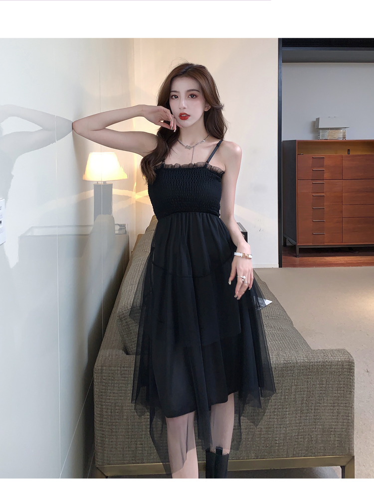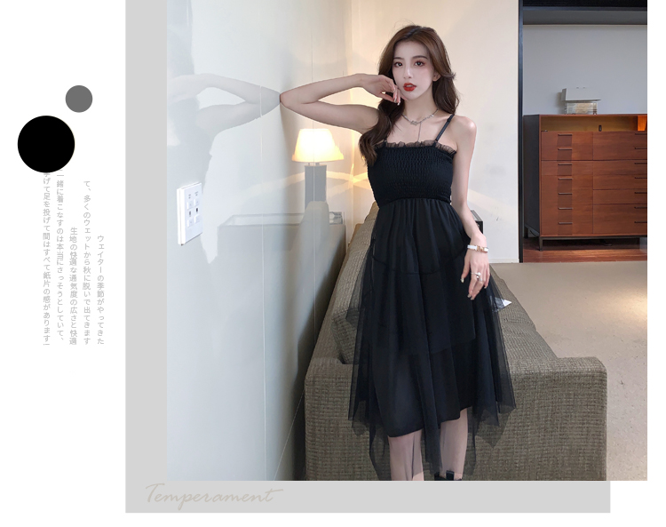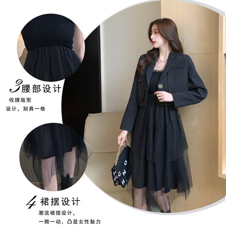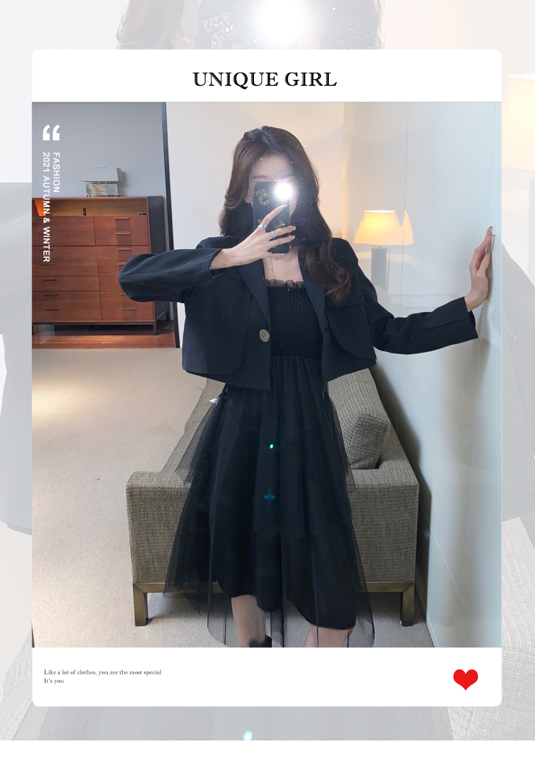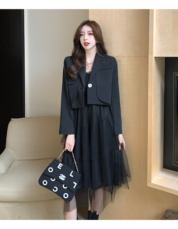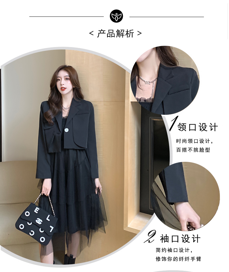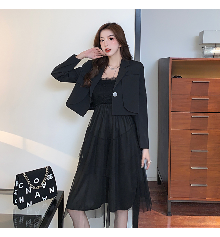 RM29979#网红甜酷气质不规则吊带网纱连衣裙短款西装外套两件套