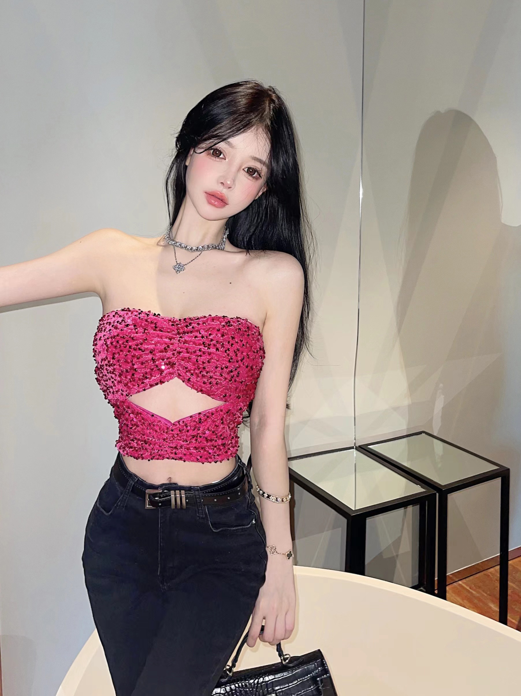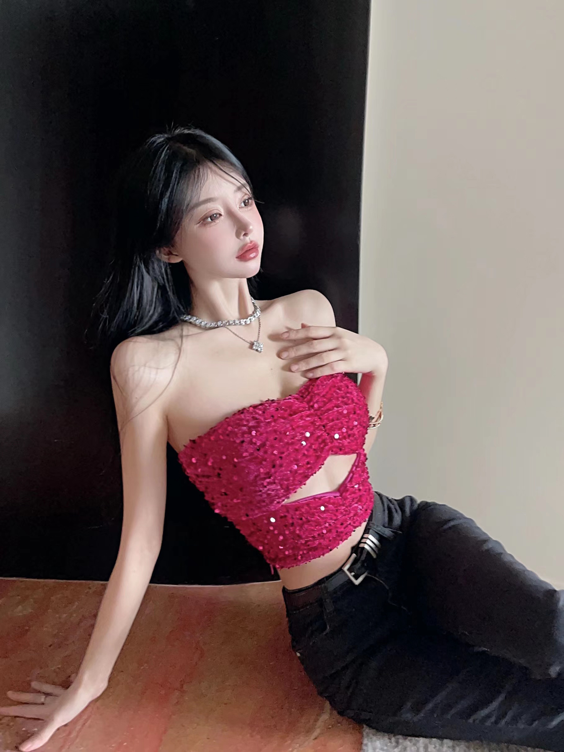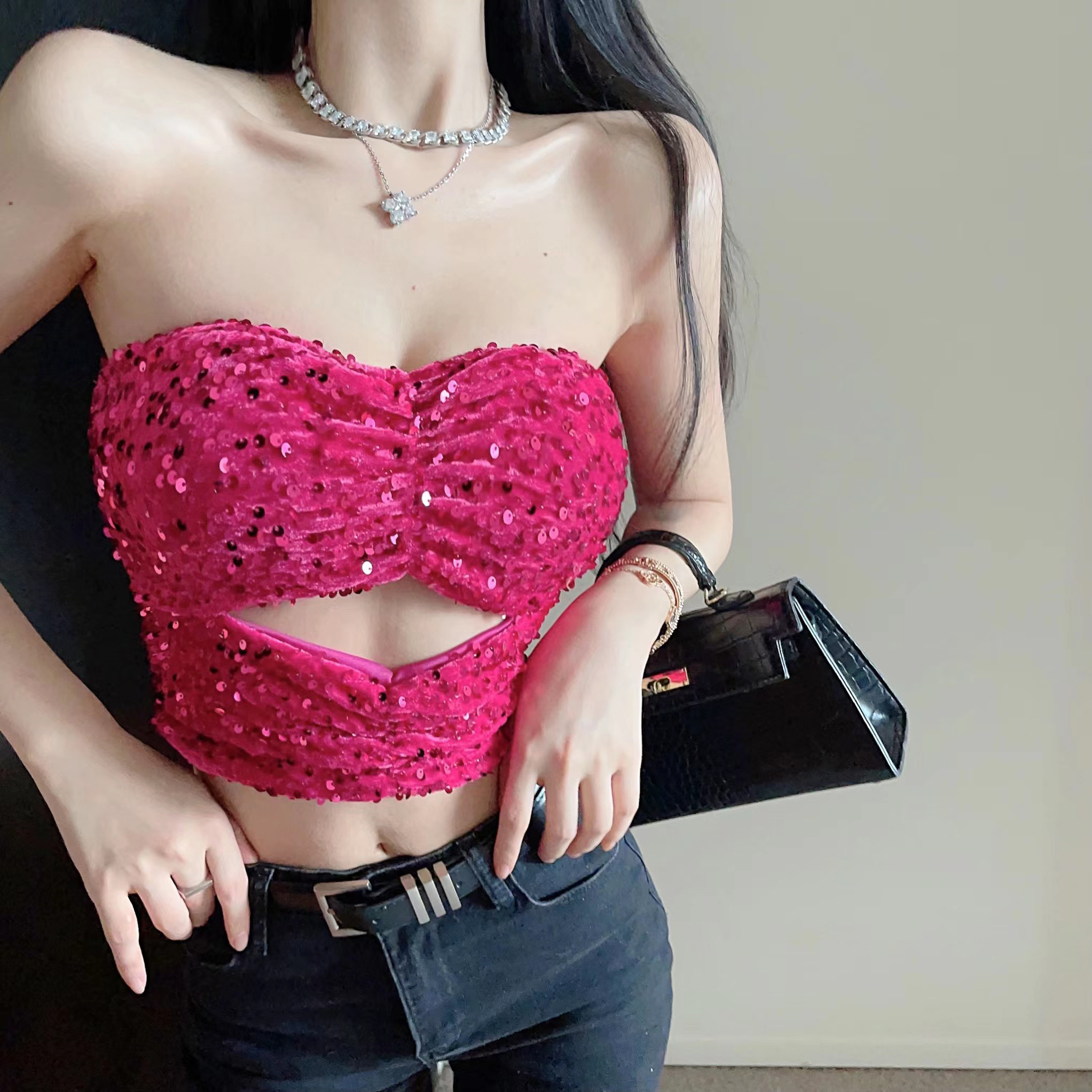 玫红色亮片抹胸