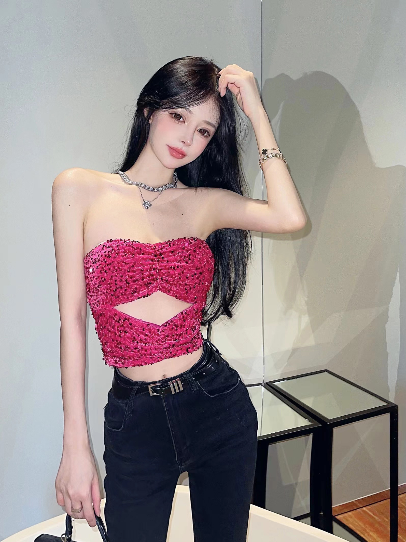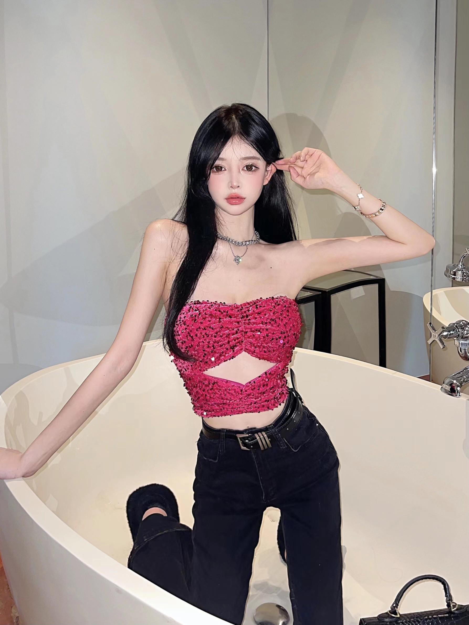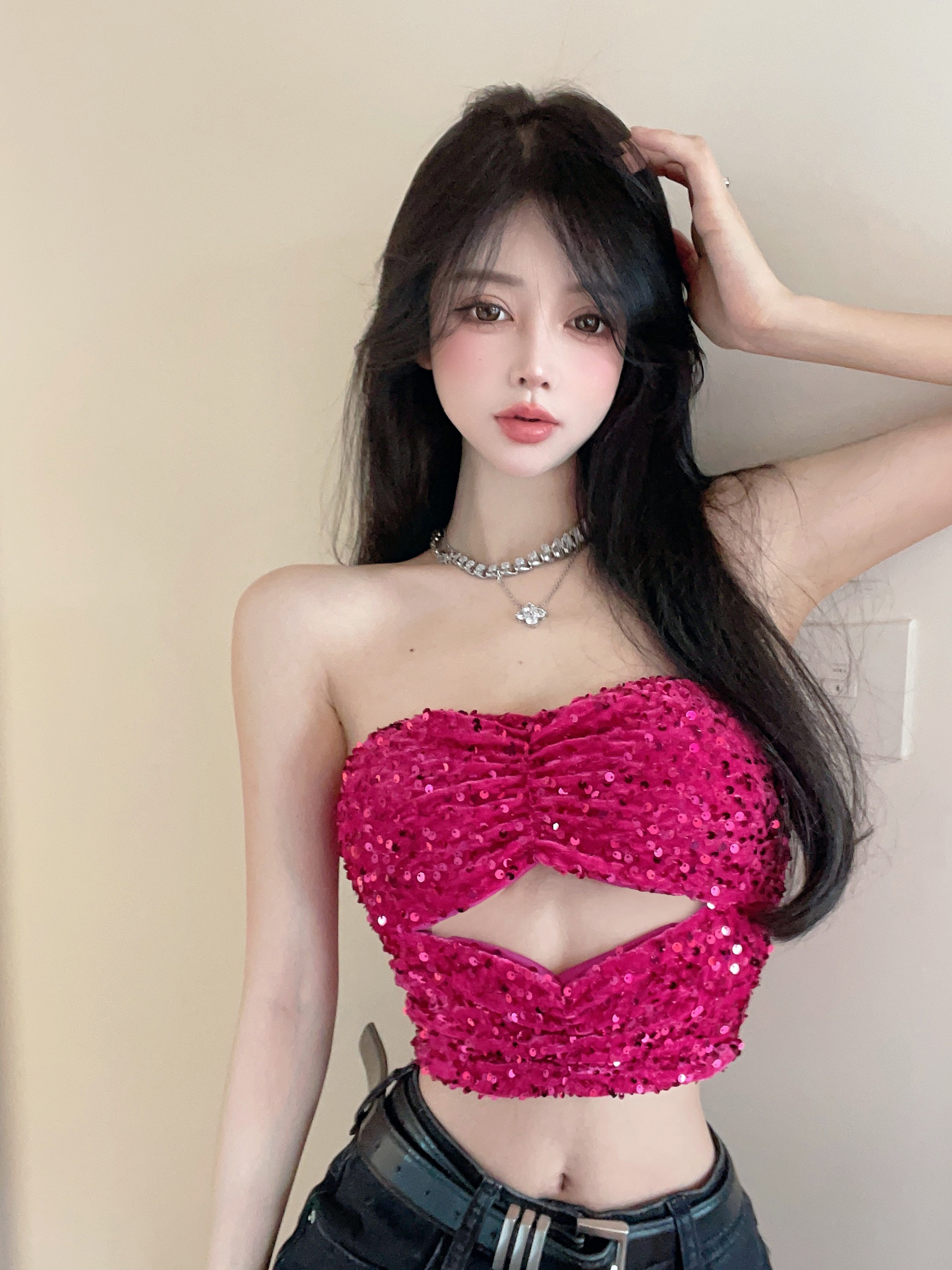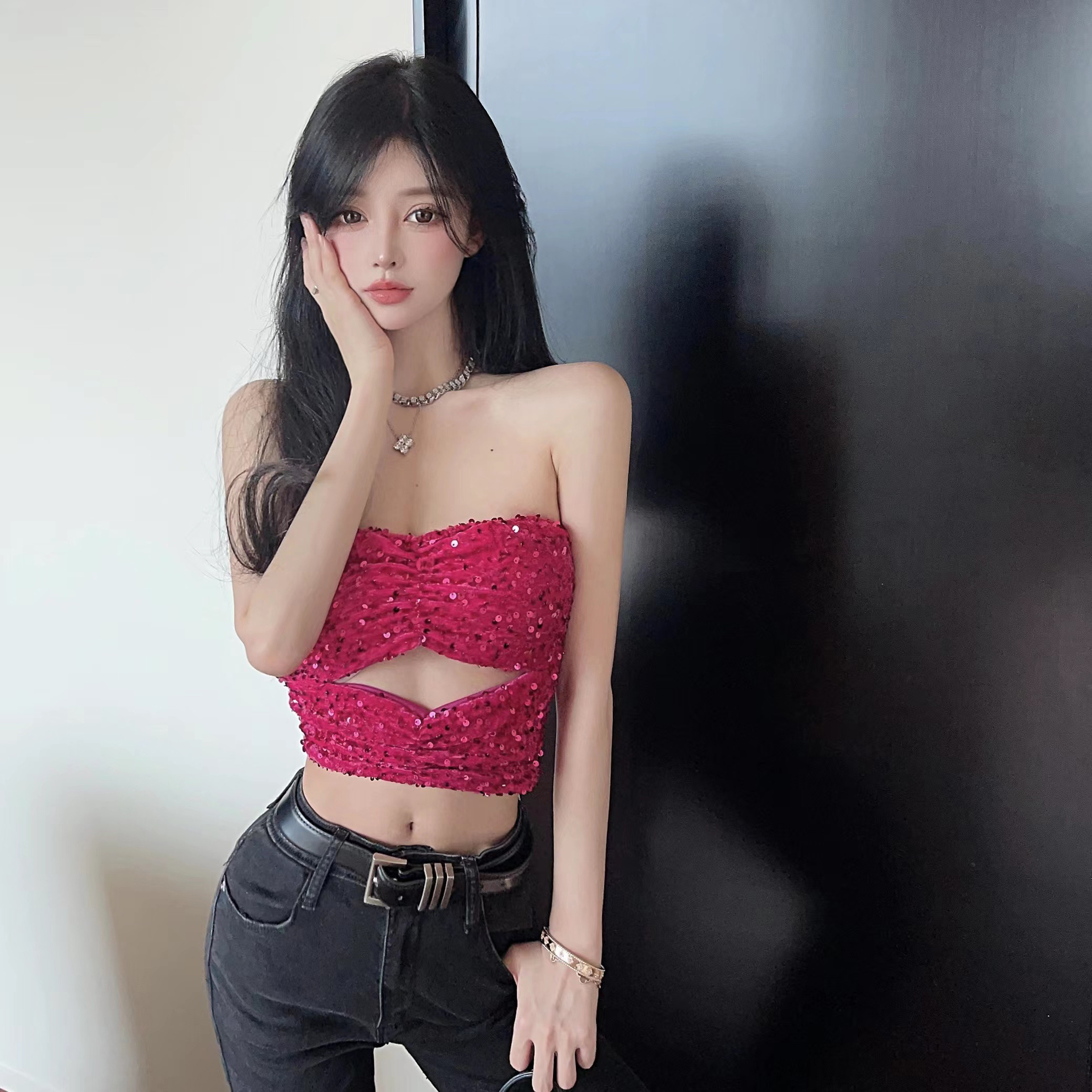 玫红色亮片抹胸