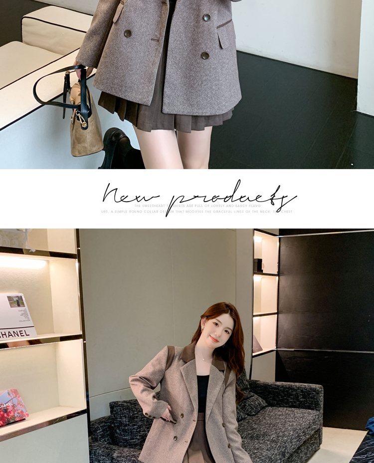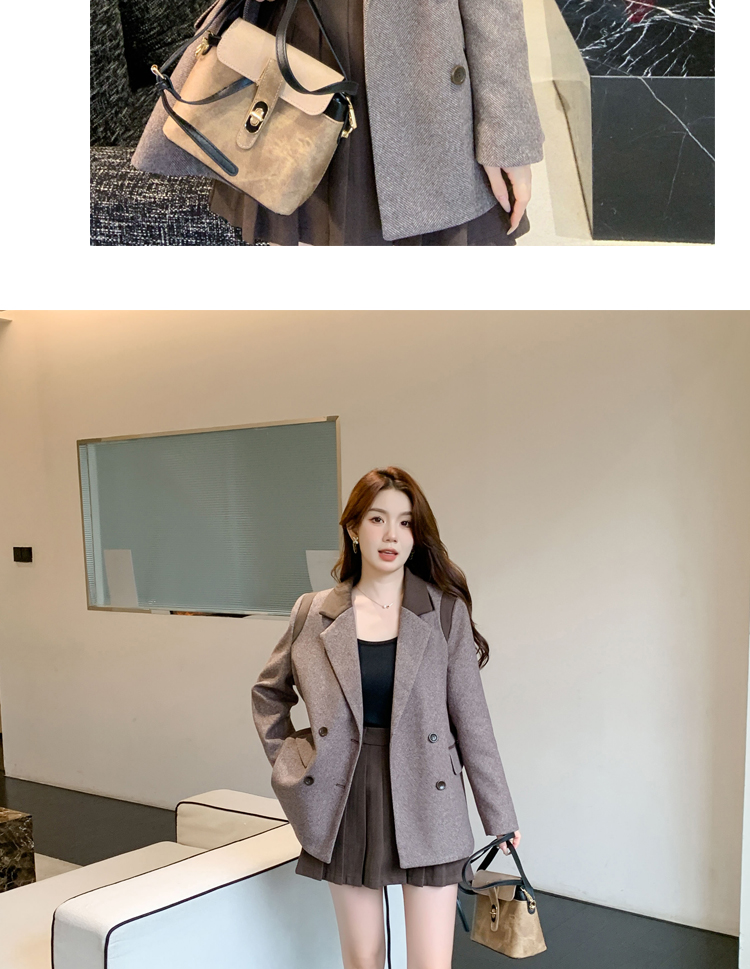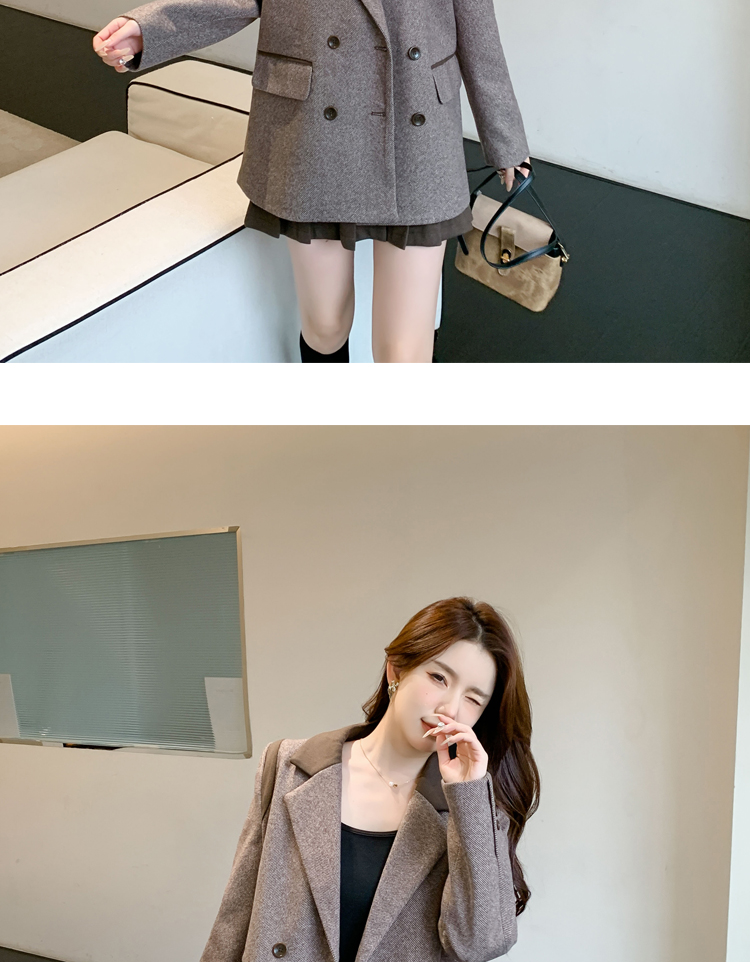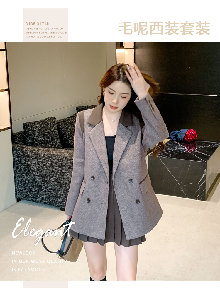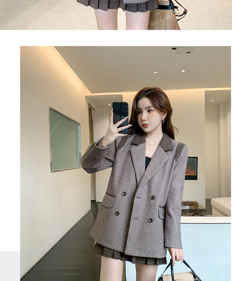 RM30144#新款夹棉人字纹毛呢西装外套百褶半身裙套装女