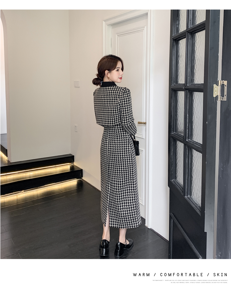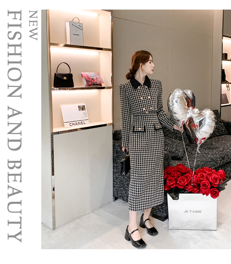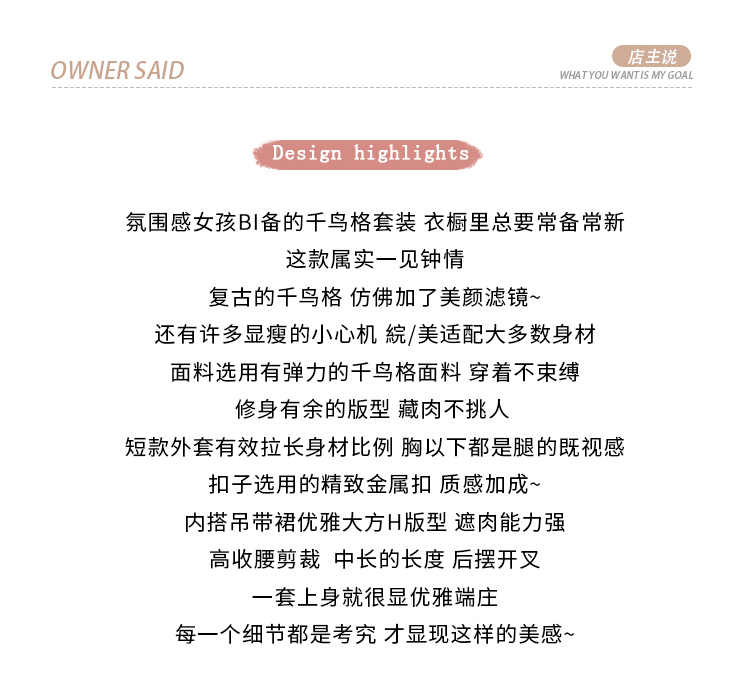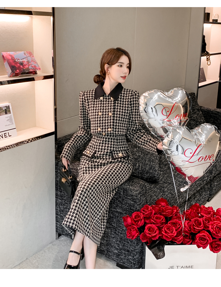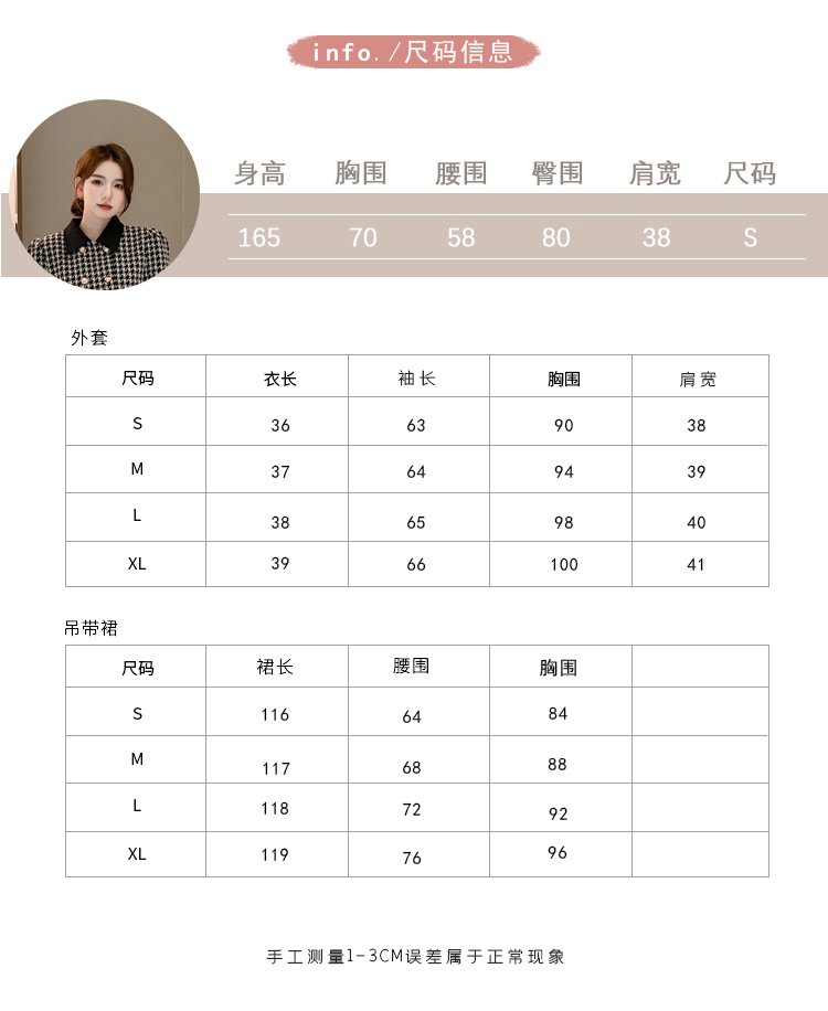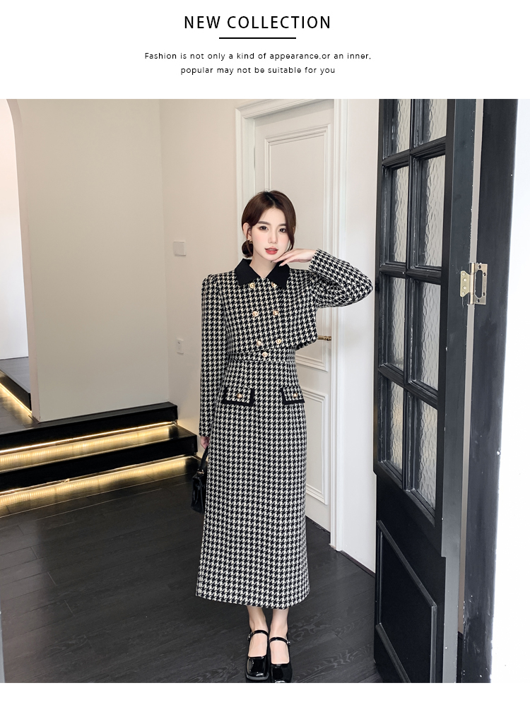 RM30148#气质小香风套装女秋冬季新款千鸟格外套吊带连衣裙两件套