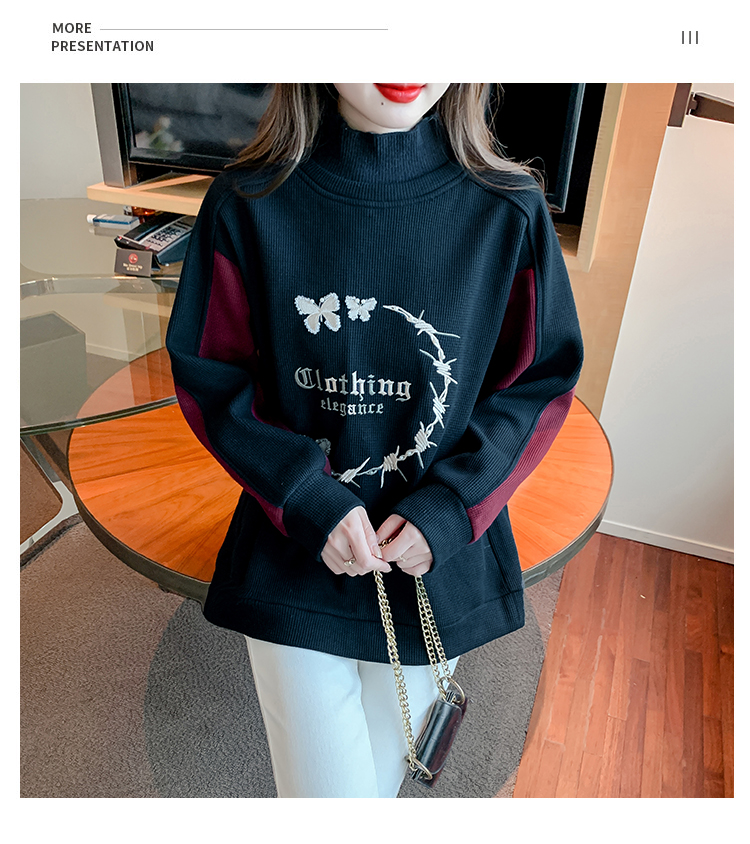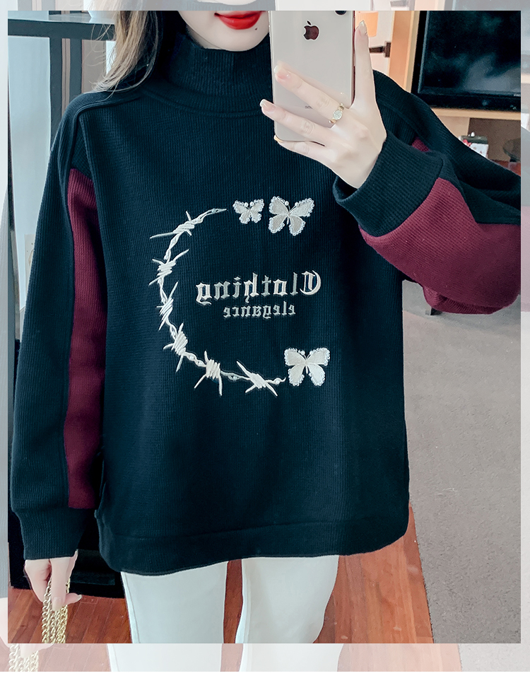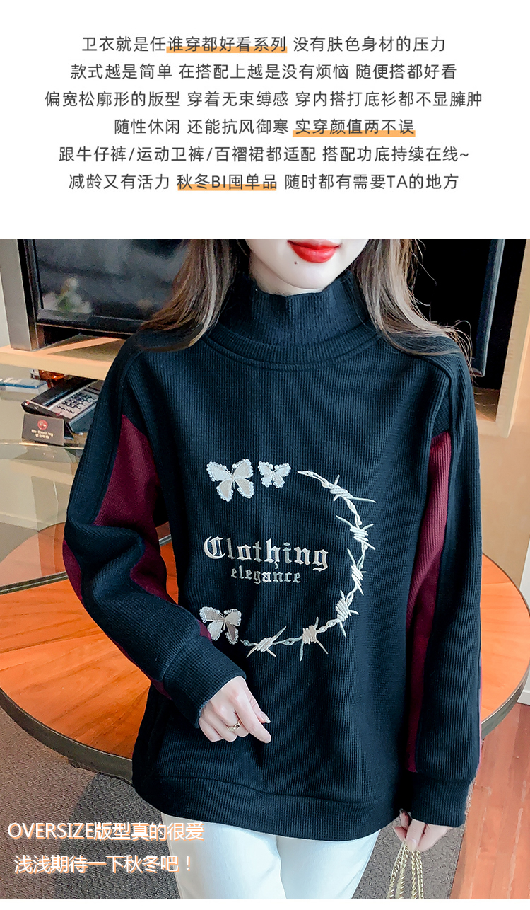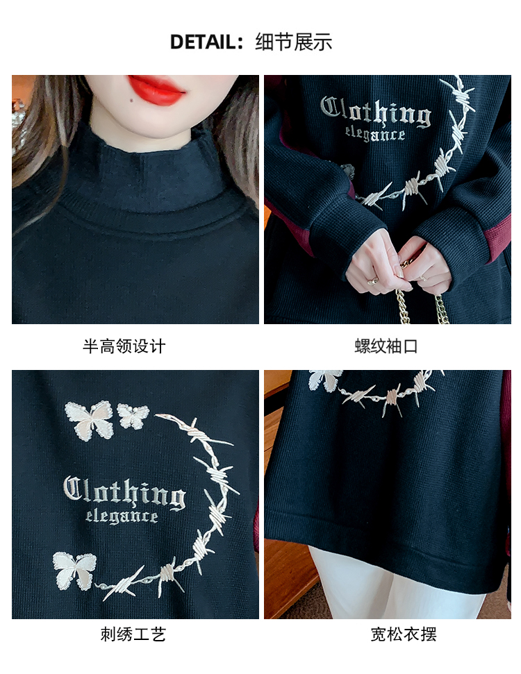 RM30511#刺绣半高领卫衣女秋冬季加绒加厚2023新款欧货宽松大码假两件上衣