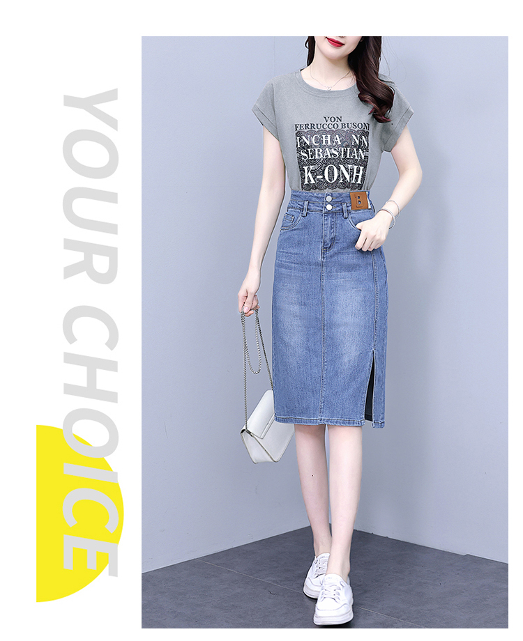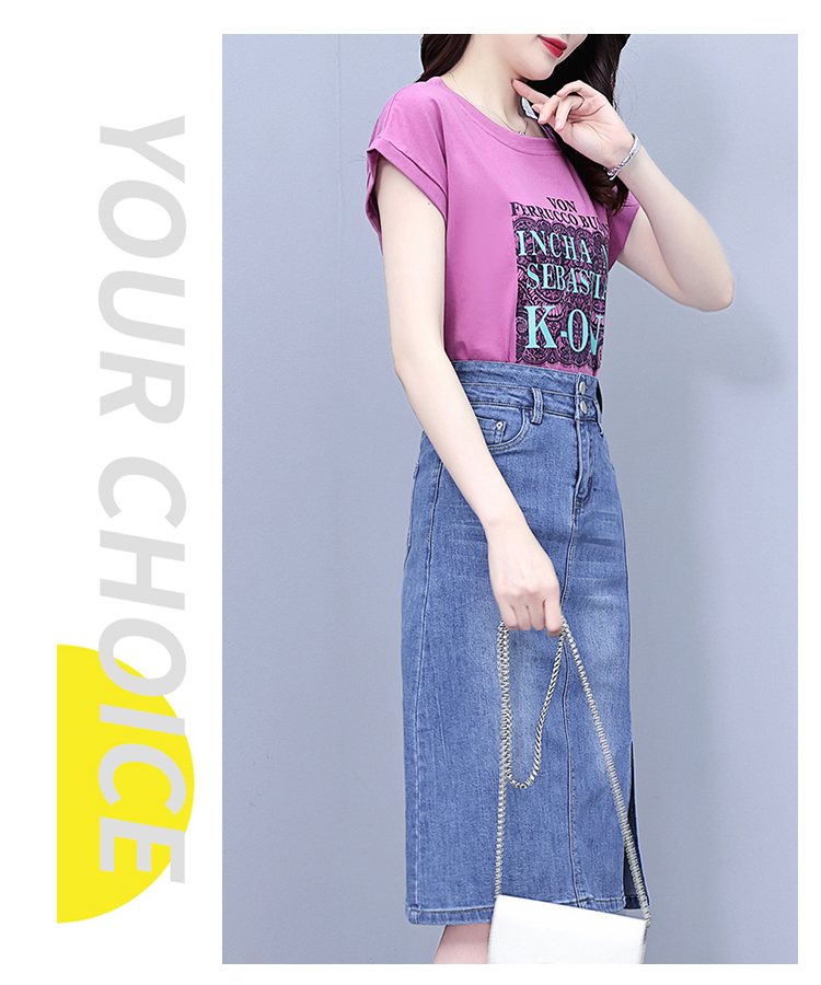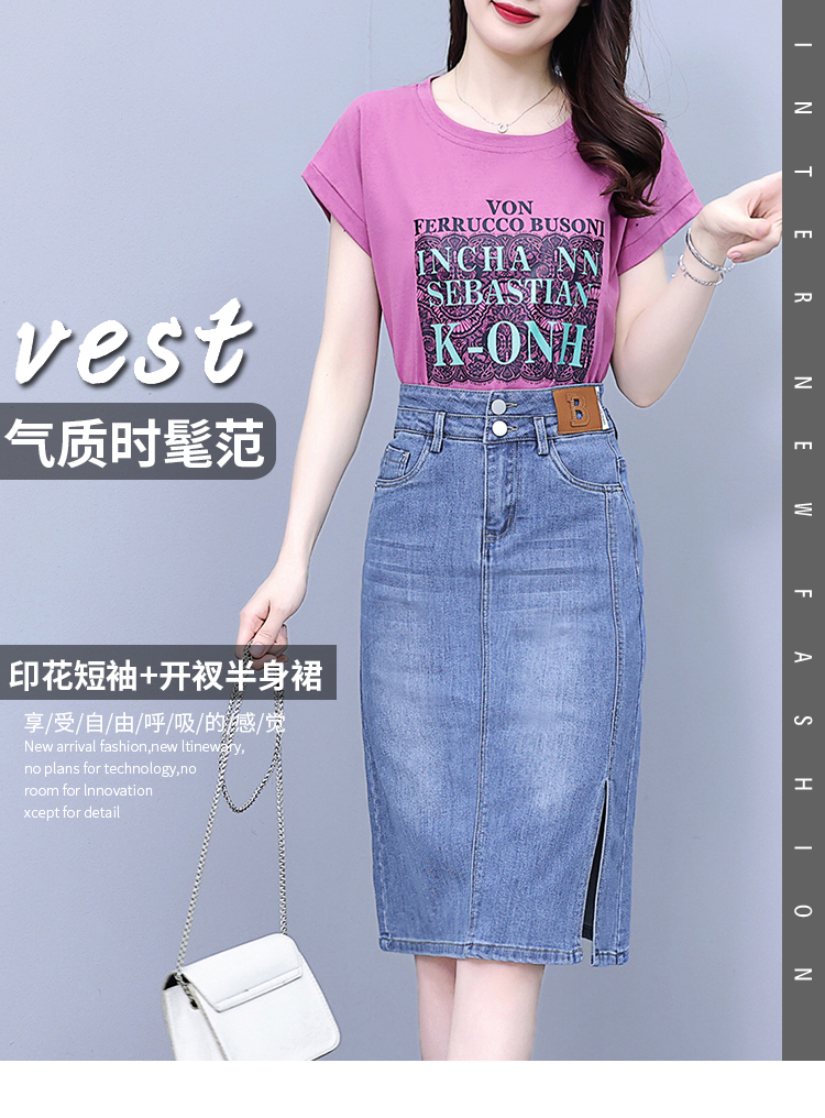 RY2628#夏季短袖t恤纯棉减龄上衣搭配新款高腰开叉牛仔半身裙女时尚套装