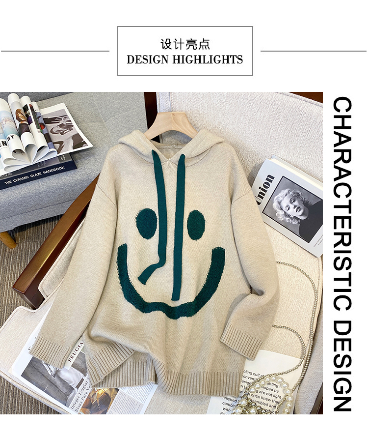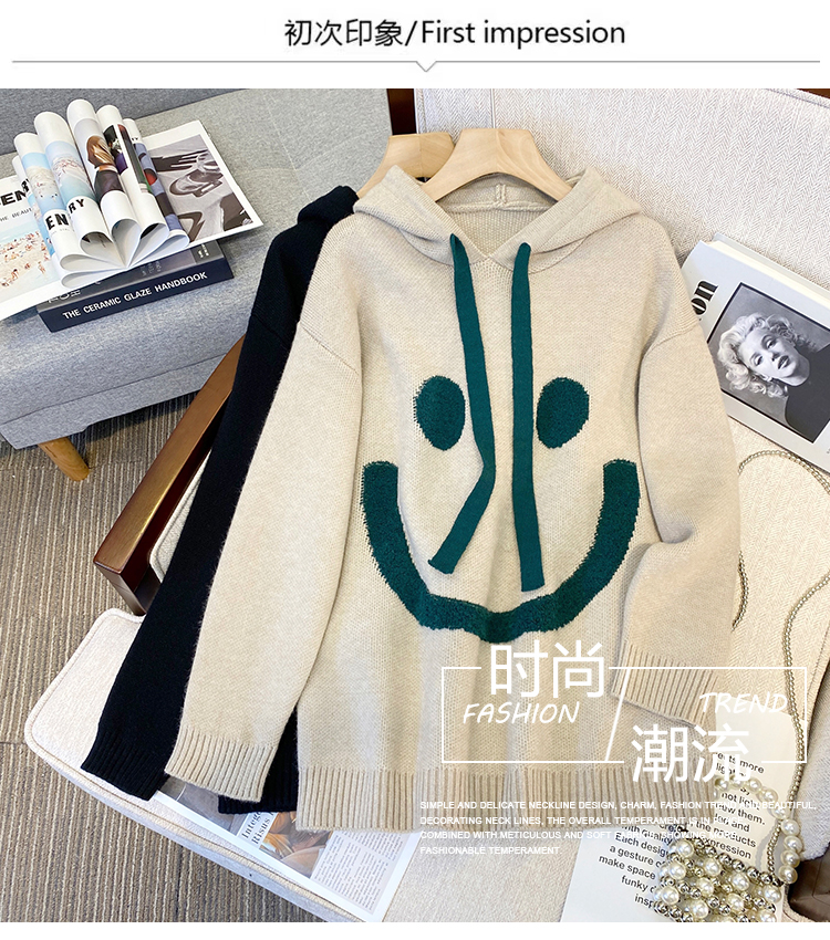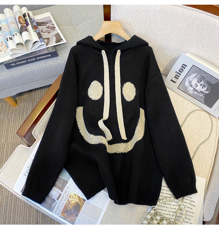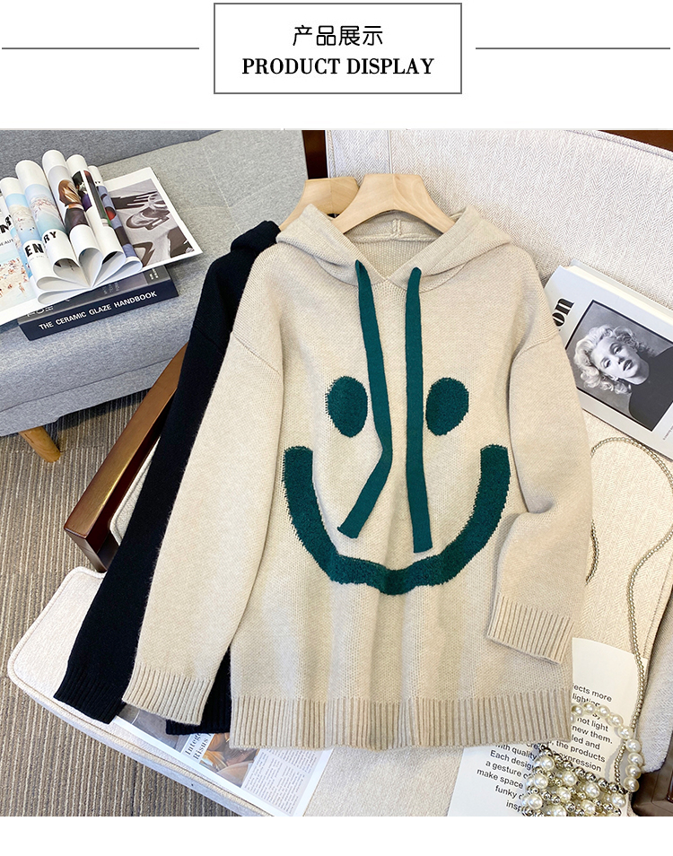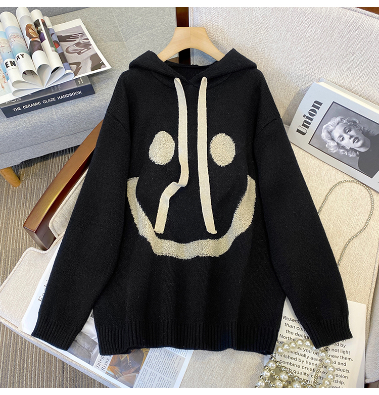 RM30559#大码女装秋冬复古笑脸连帽毛衣胖MM慵懒小众百搭针织衫上衣