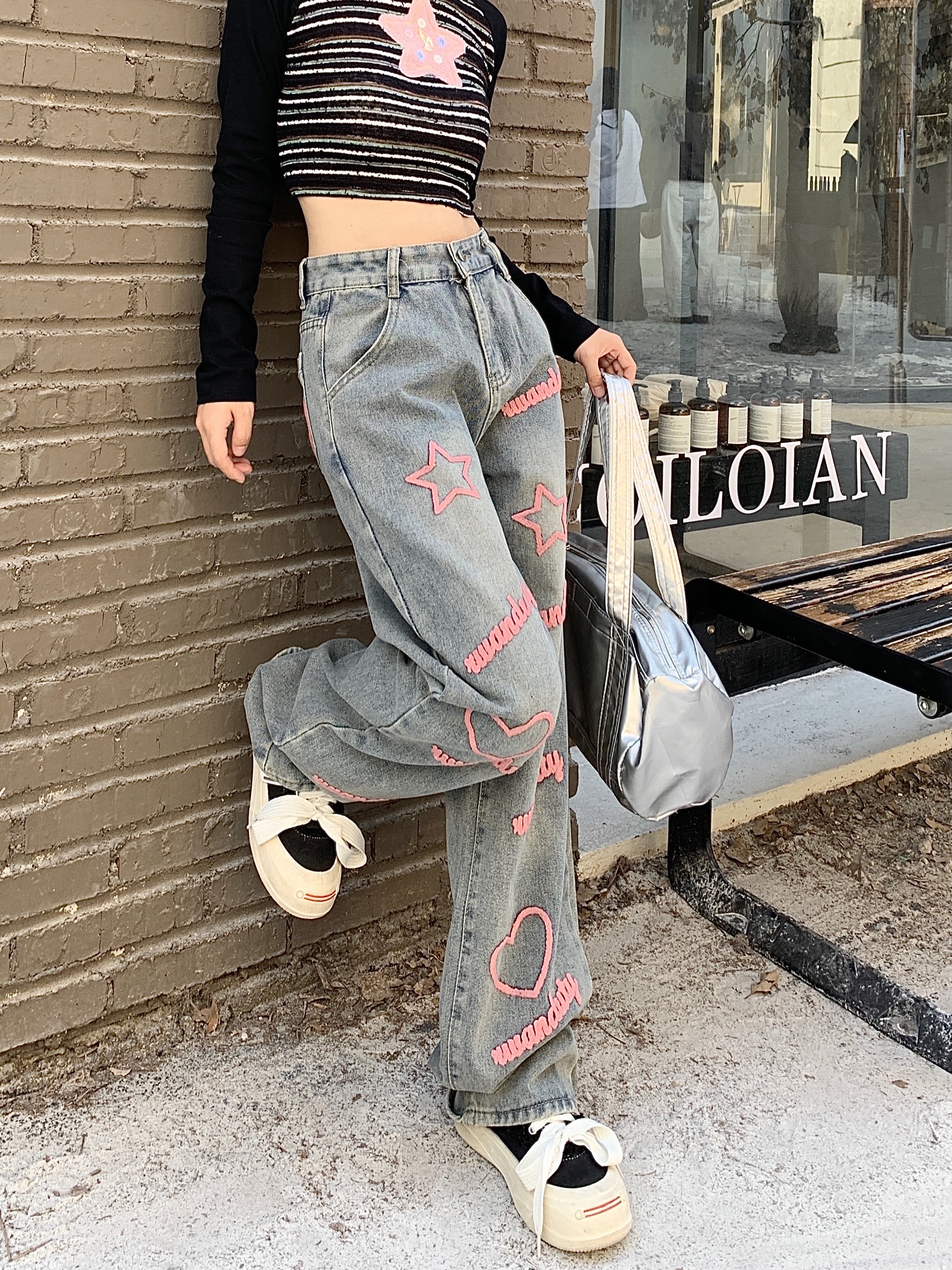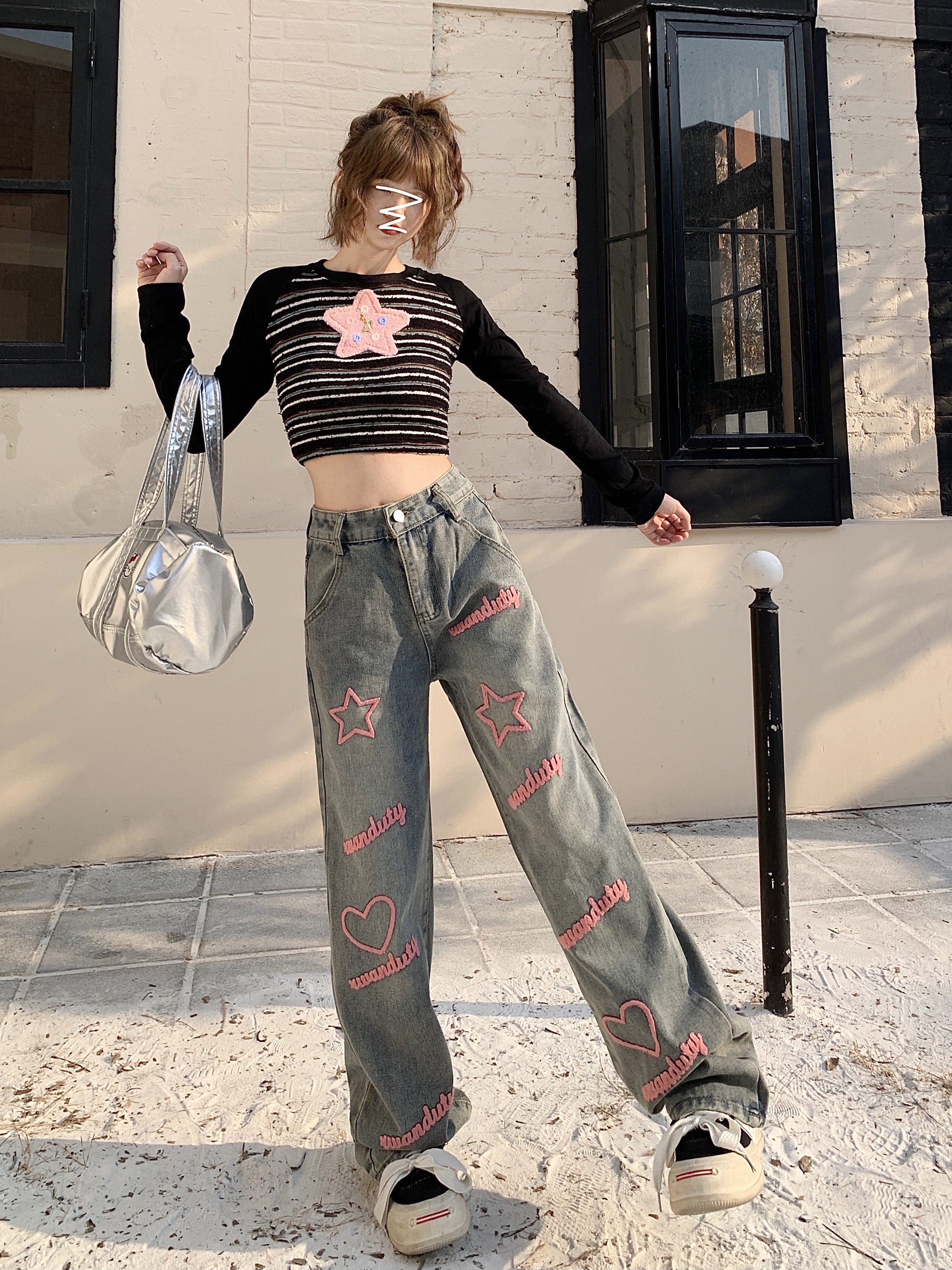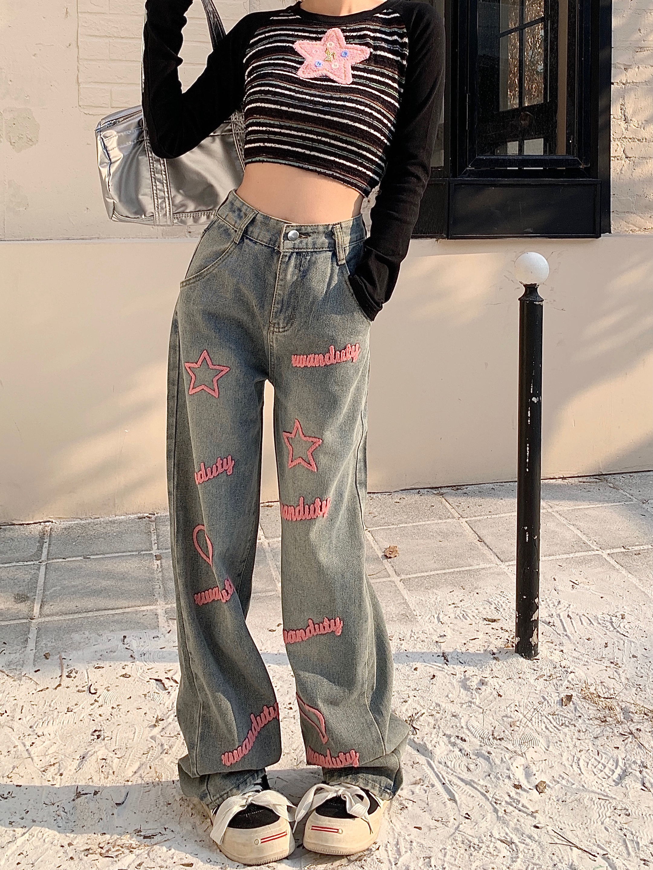 RM30644#高街辣妹字母刺绣阔腿牛仔裤高腰宽松直筒拖地裤子