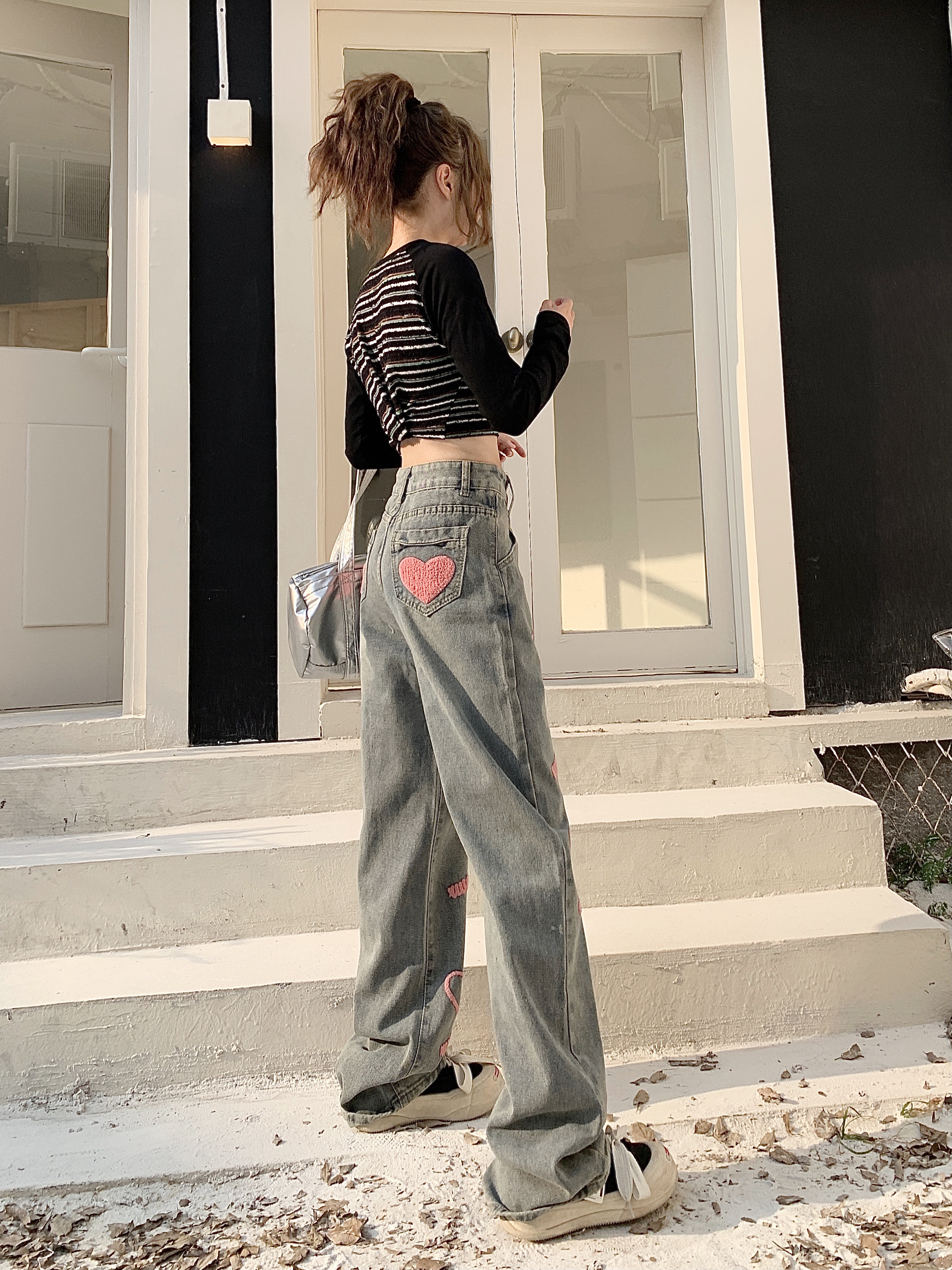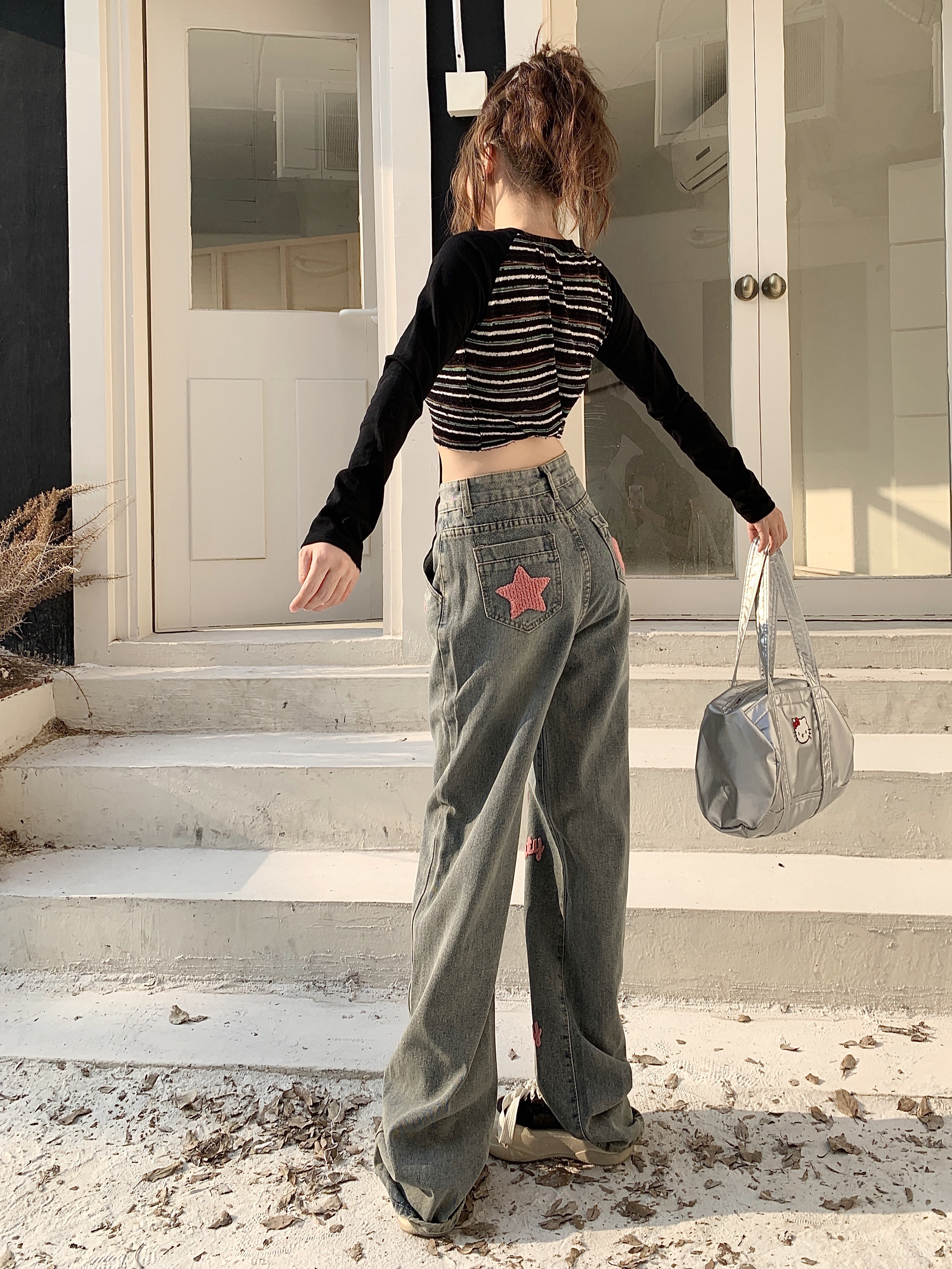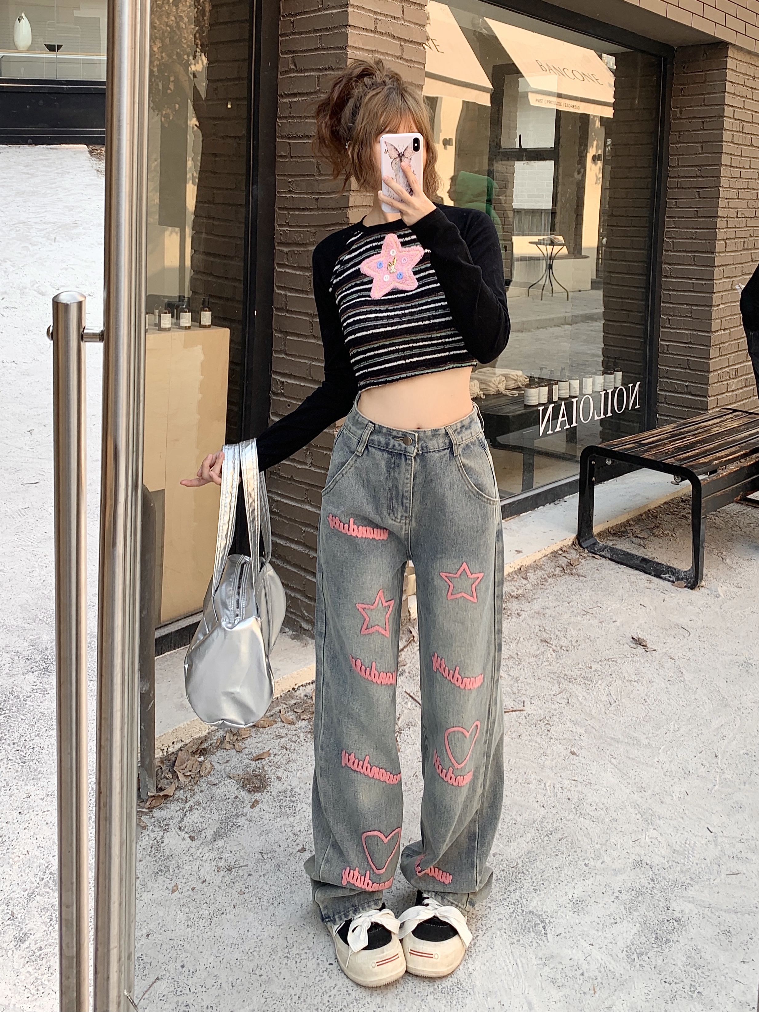 RM30644#高街辣妹字母刺绣阔腿牛仔裤高腰宽松直筒拖地裤子