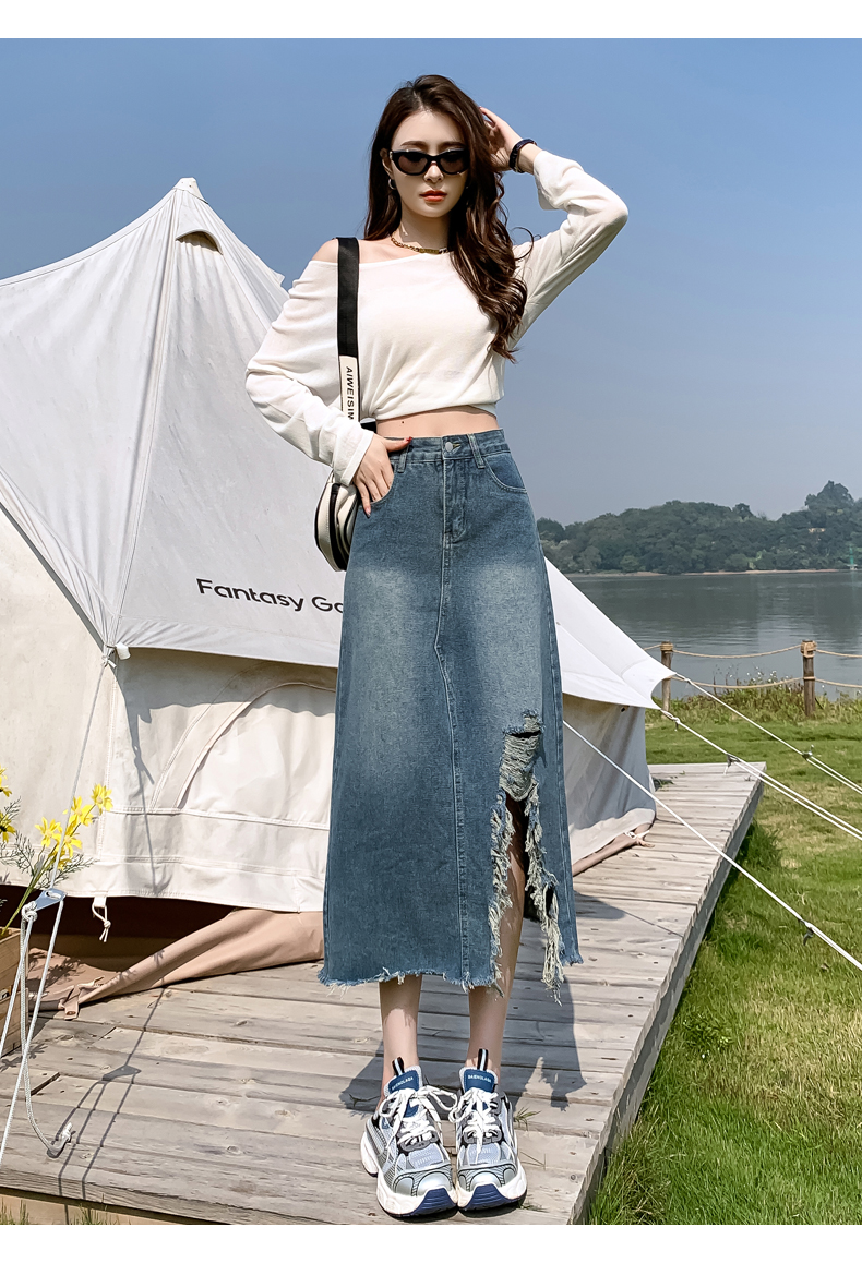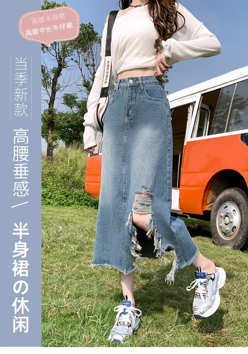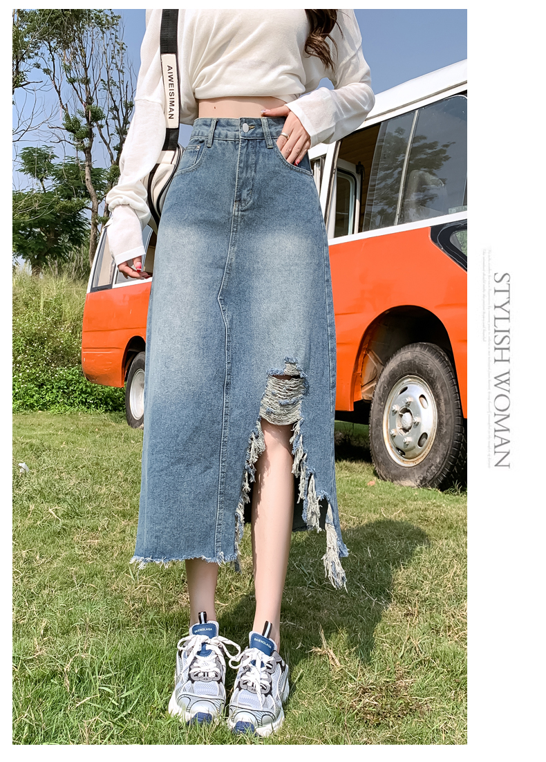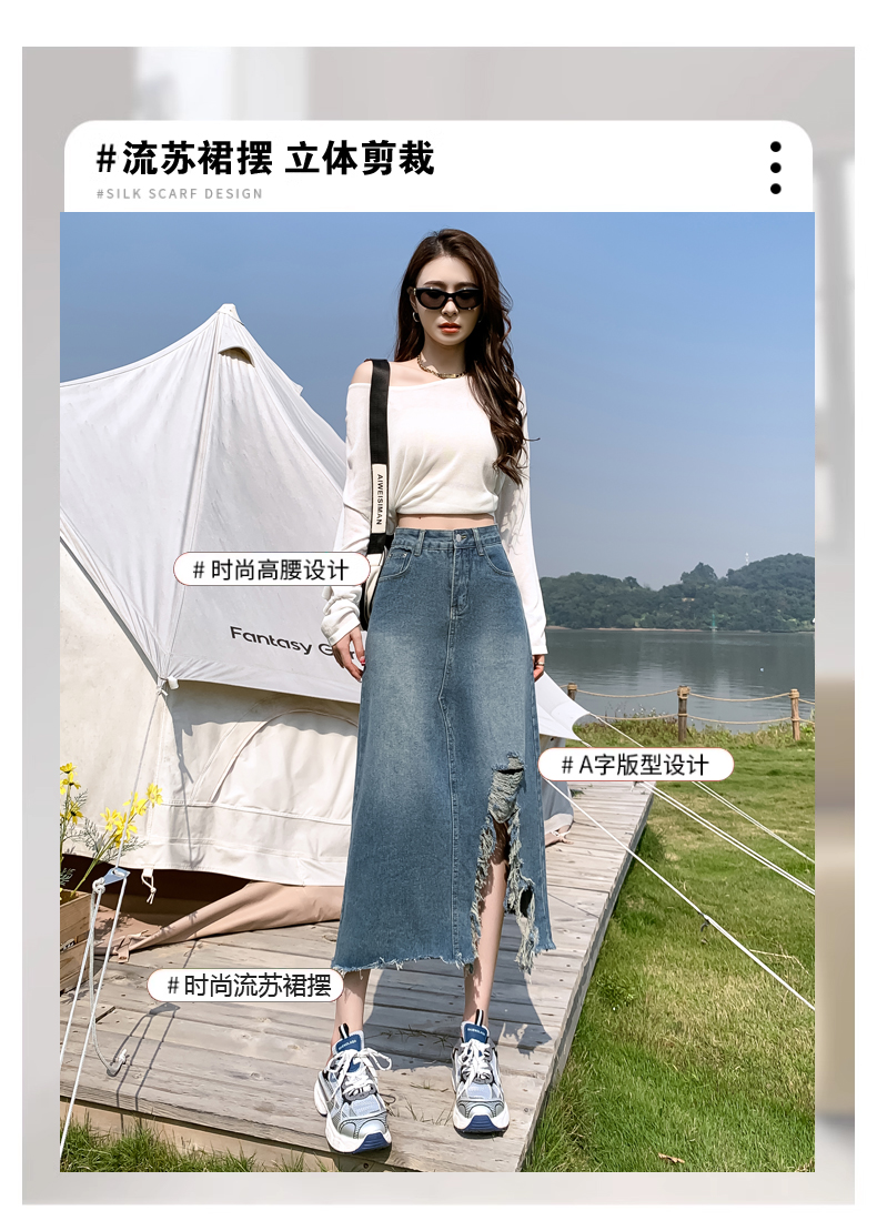 RM30667#不规则毛边牛仔裙秋季大码胖妹妹mm高腰遮肚显瘦中长款a字半身裙