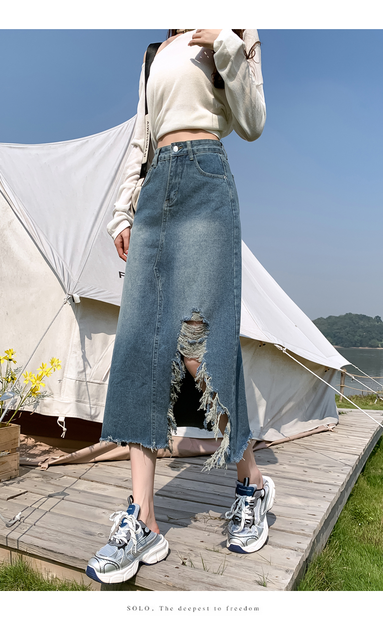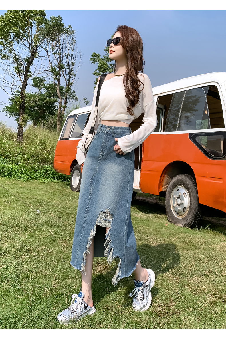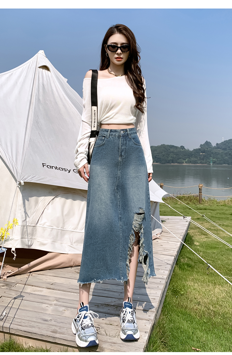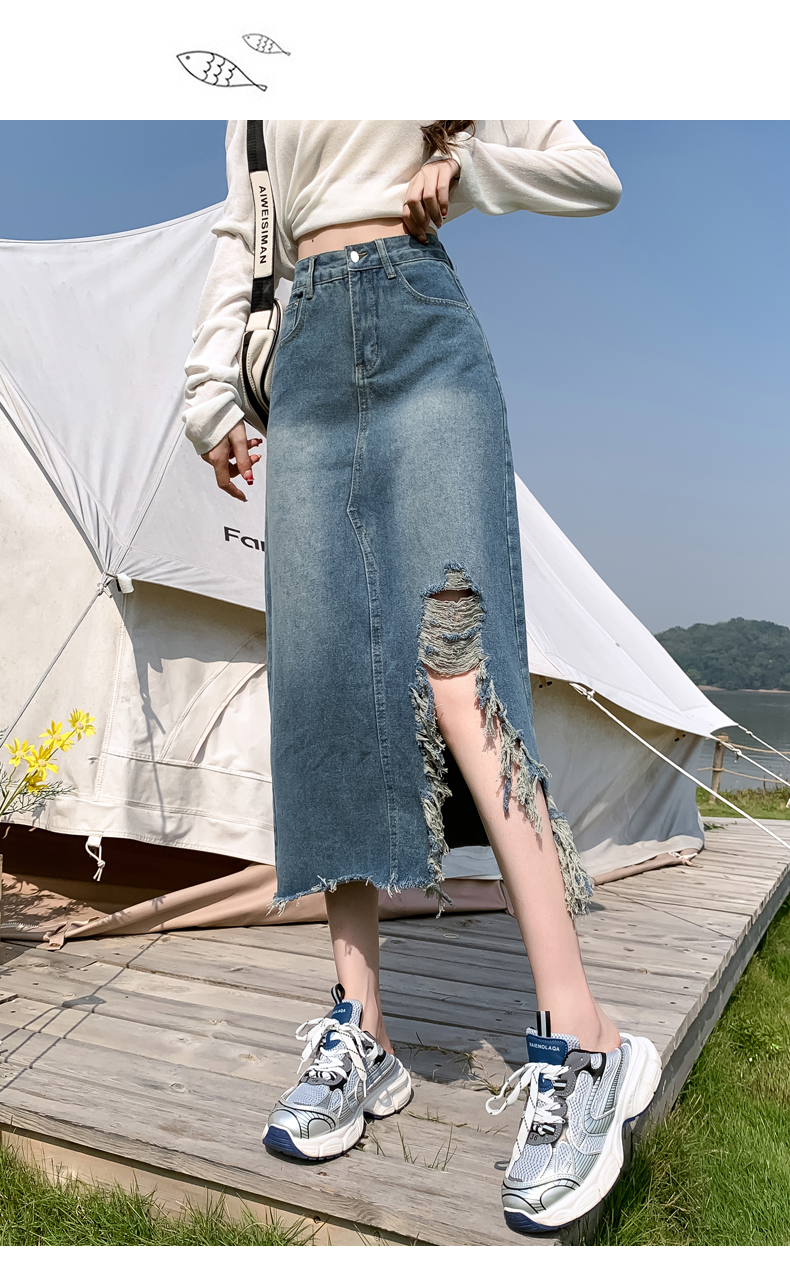 RM30667#不规则毛边牛仔裙秋季大码胖妹妹mm高腰遮肚显瘦中长款a字半身裙