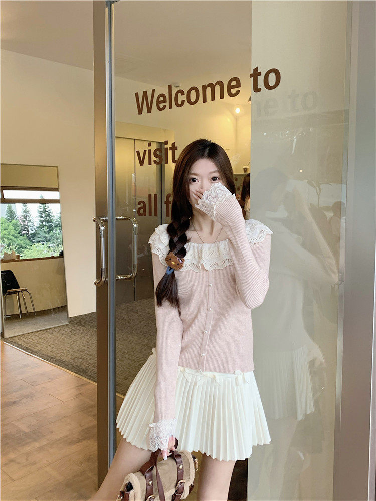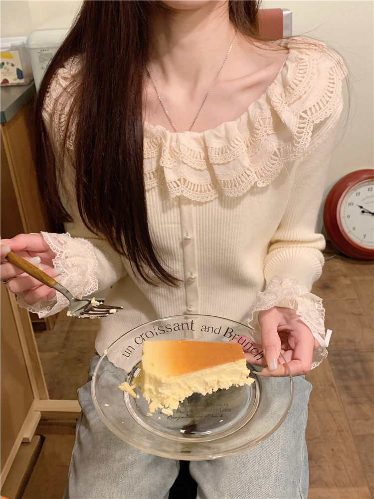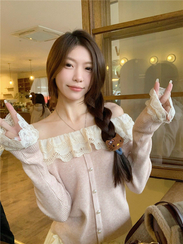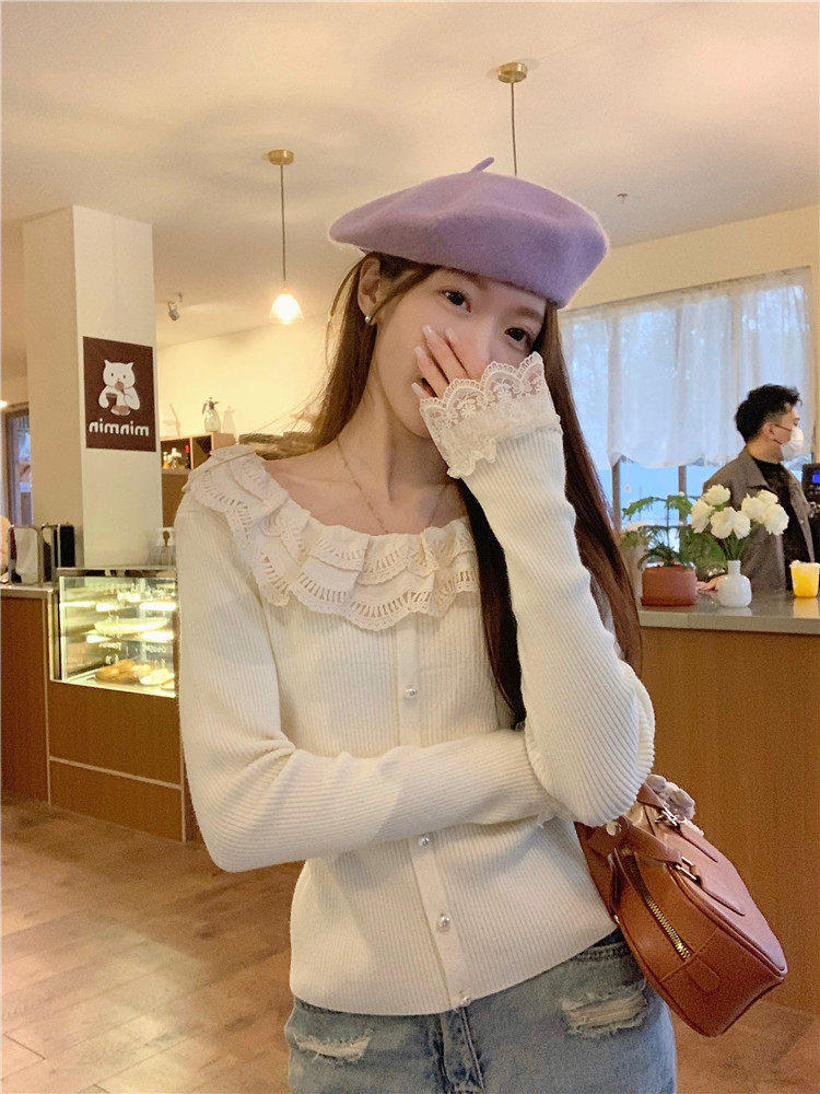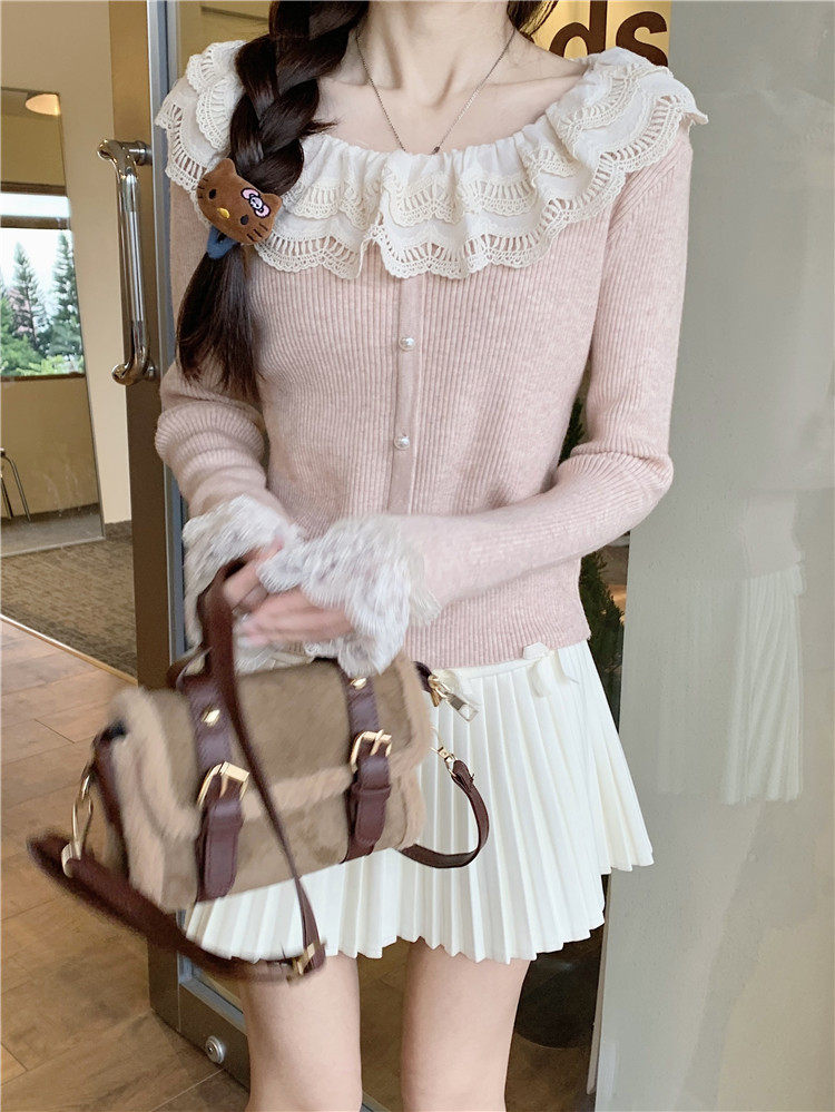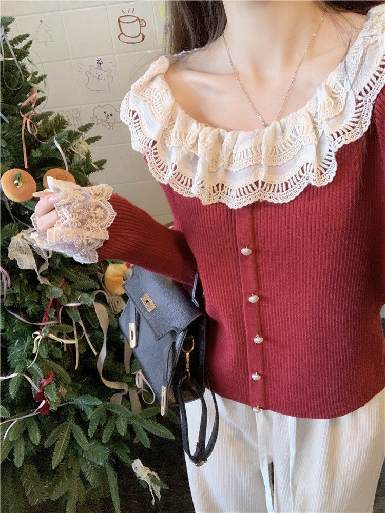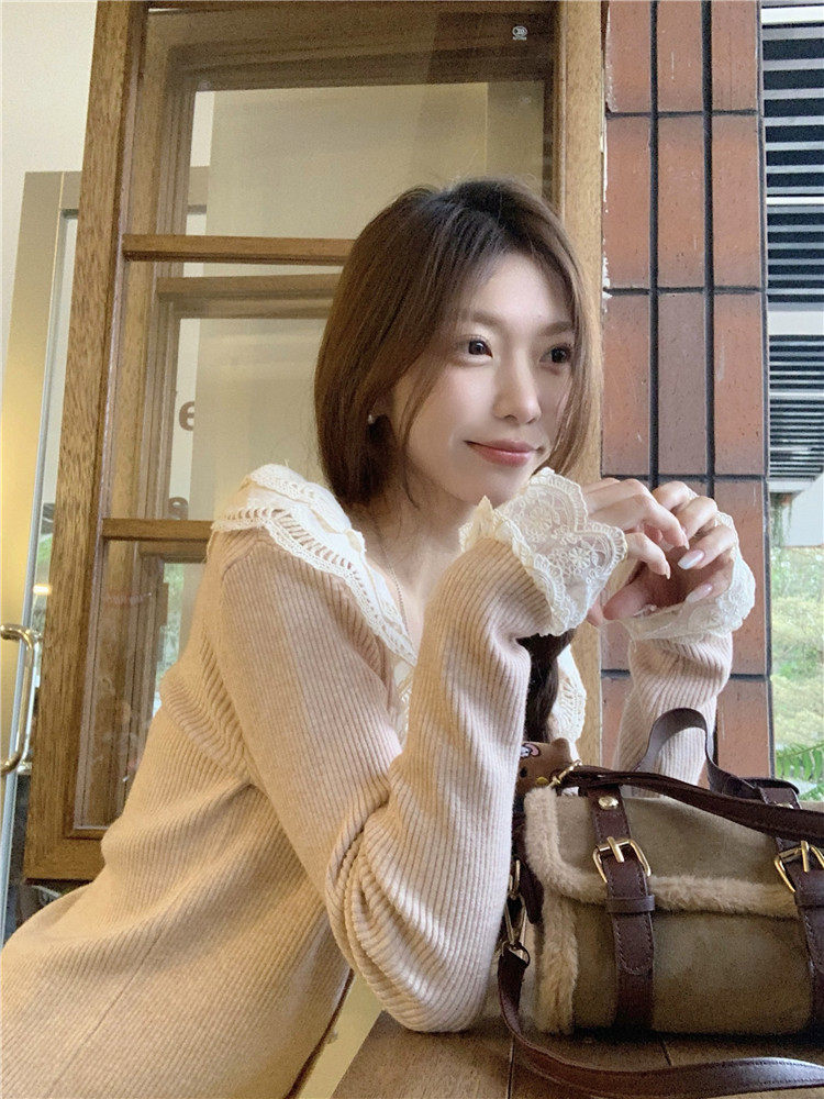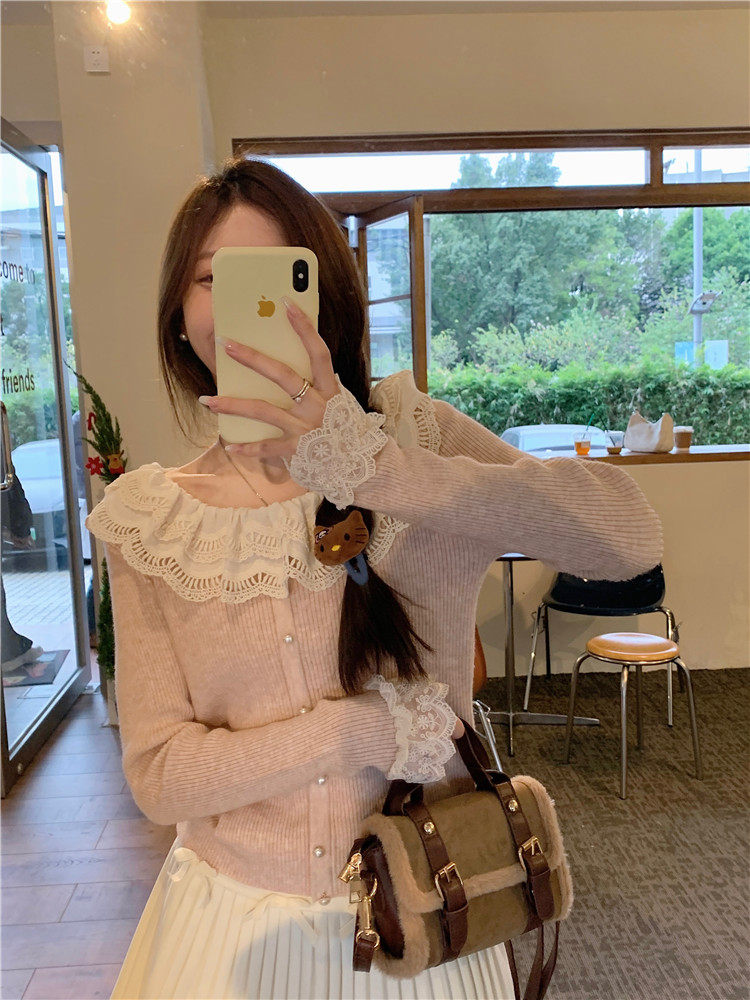 RM30737#甜美蕾丝边宽松针织毛衣女秋冬新款减龄珍珠扣打底衫
