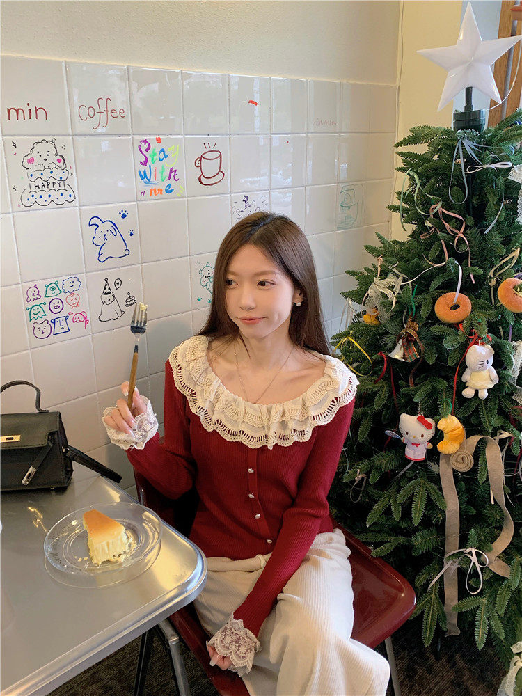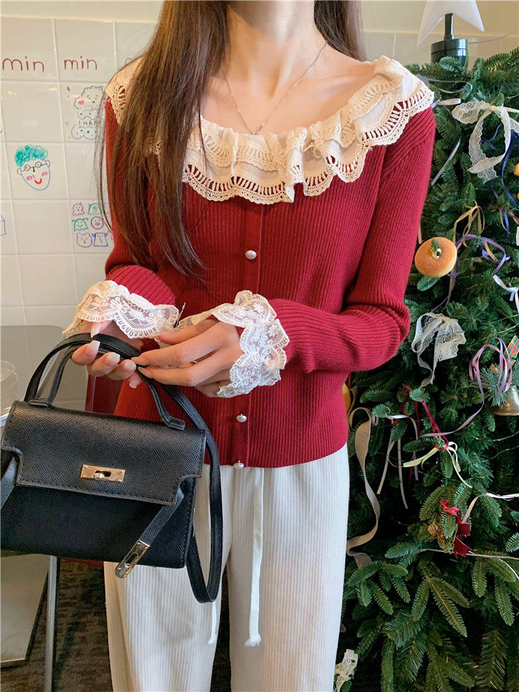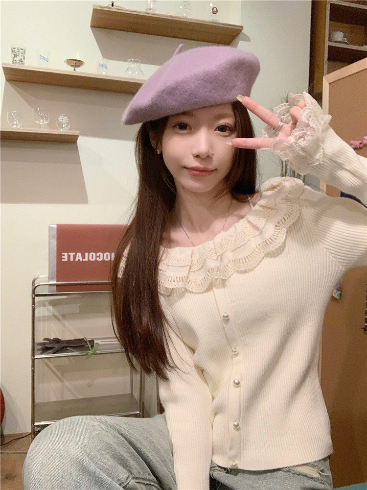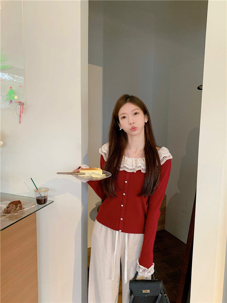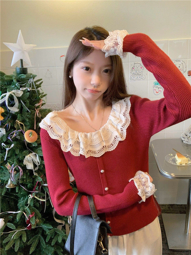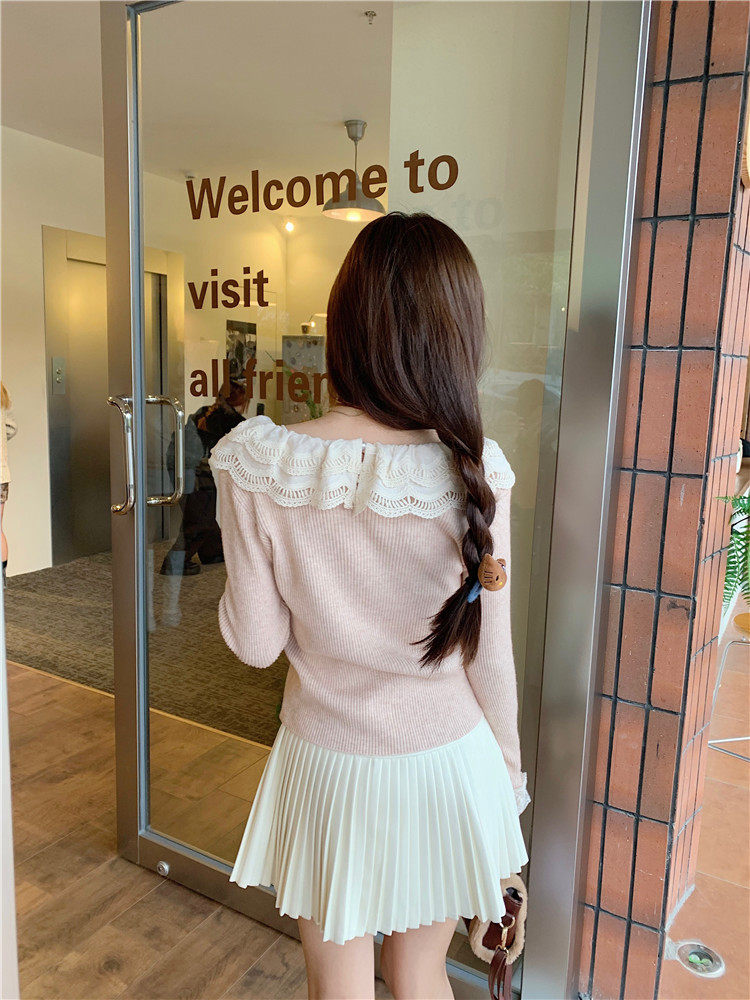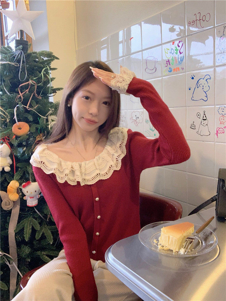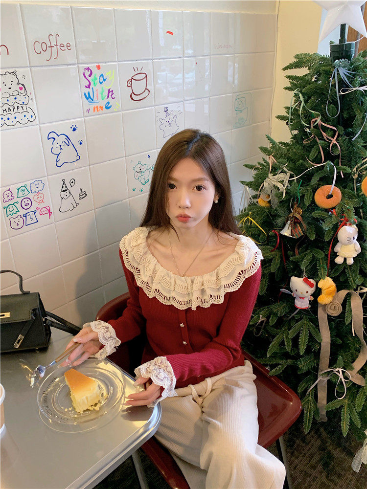 RM30737#甜美蕾丝边宽松针织毛衣女秋冬新款减龄珍珠扣打底衫