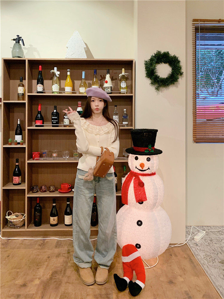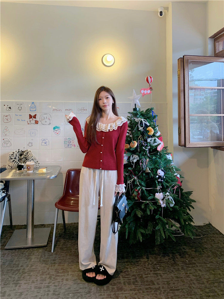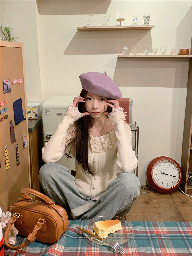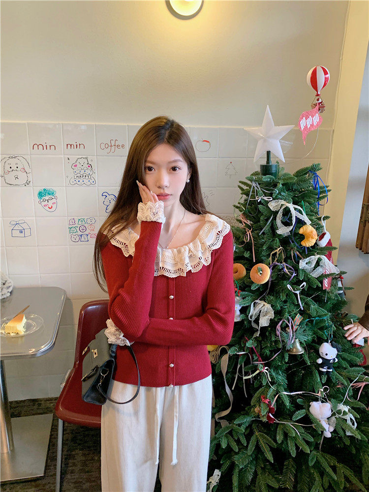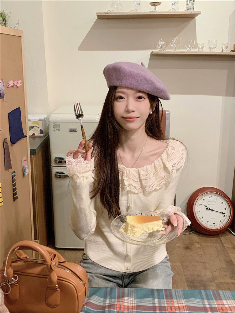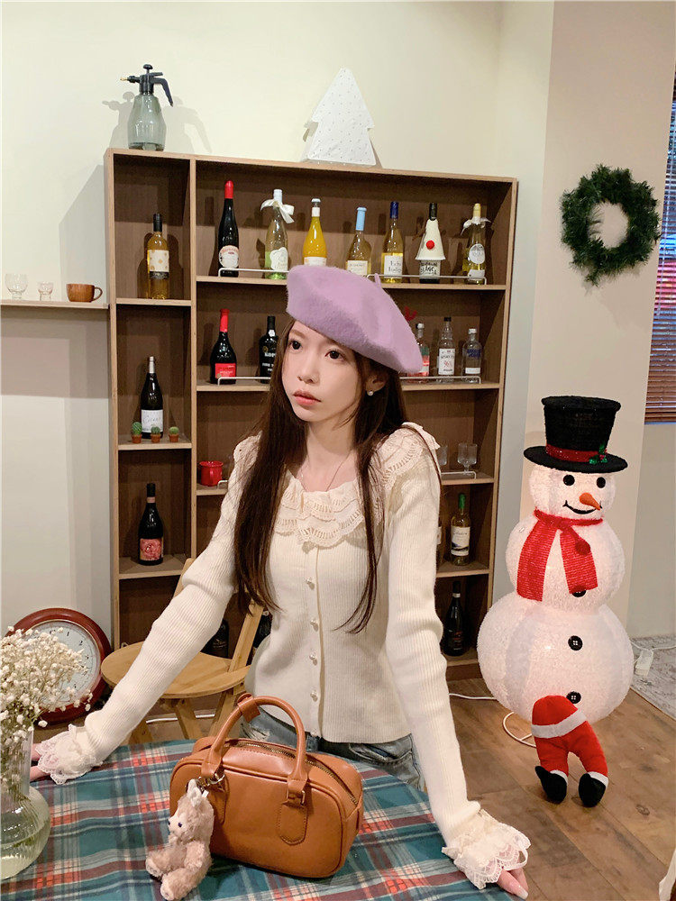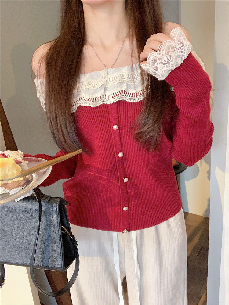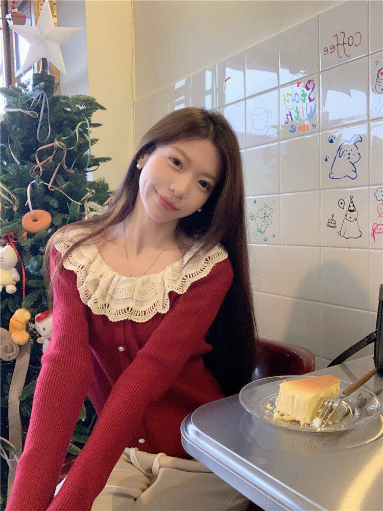 RM30737#甜美蕾丝边宽松针织毛衣女秋冬新款减龄珍珠扣打底衫