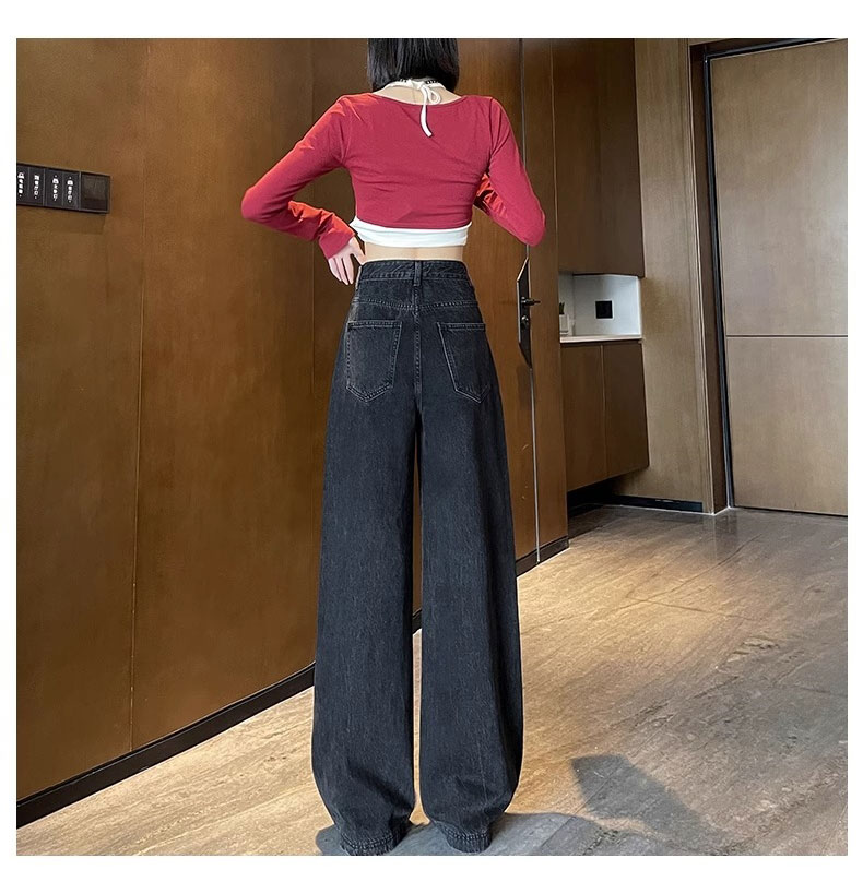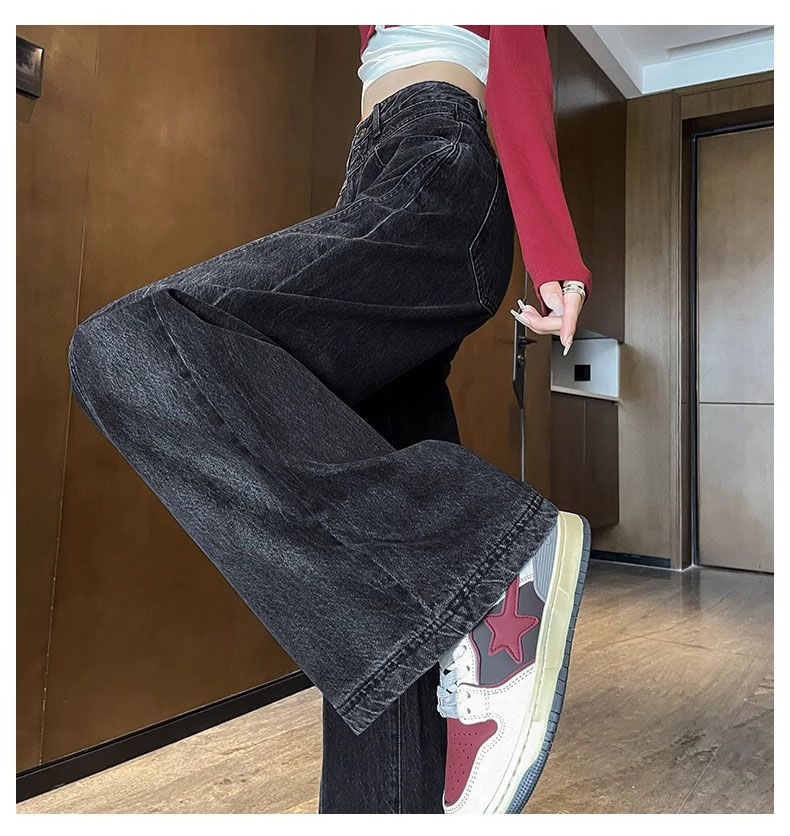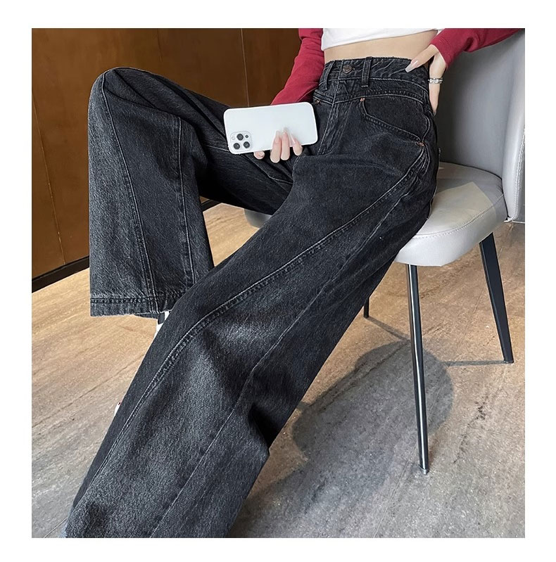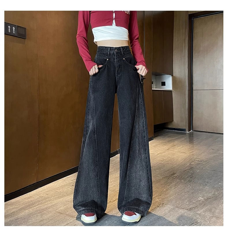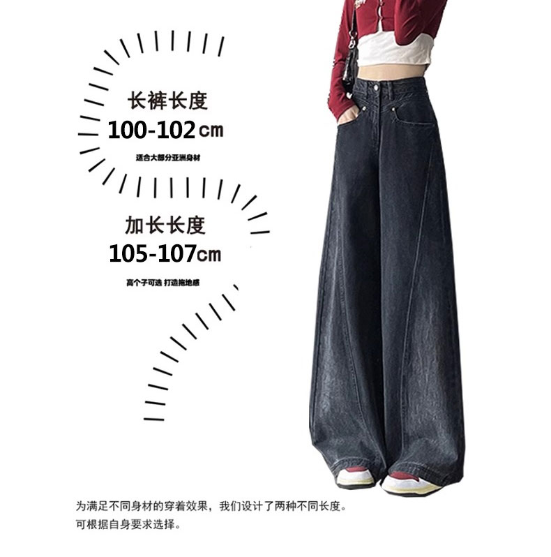 RM30741#辣妹高街阔腿牛仔裤女秋冬款设计拼接美式拖地长裤垂感显瘦拖地裤