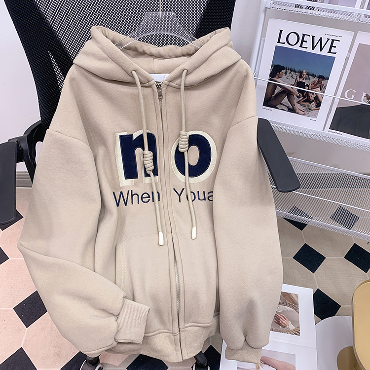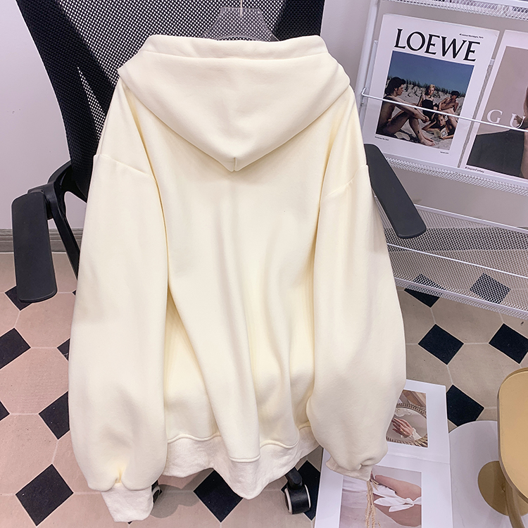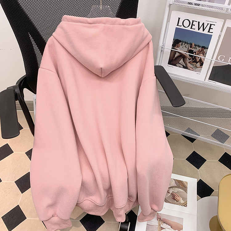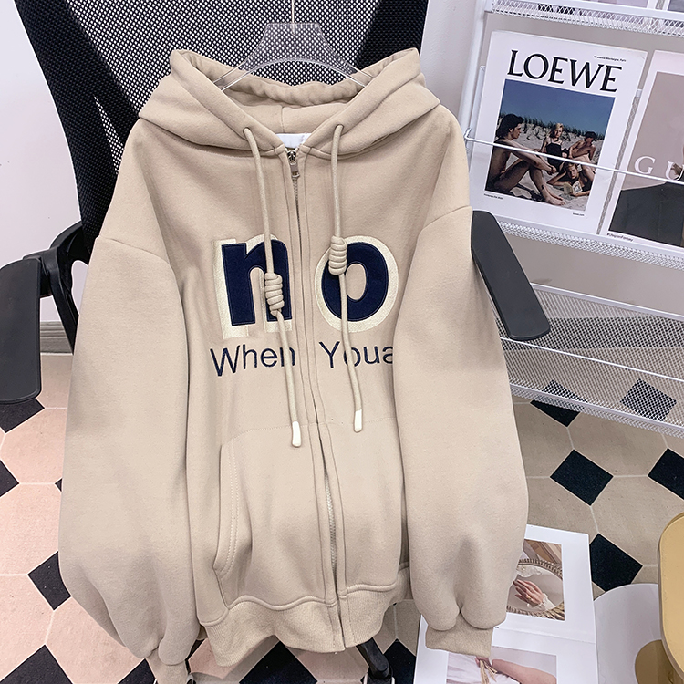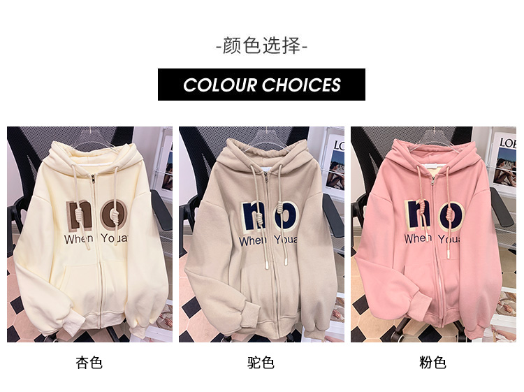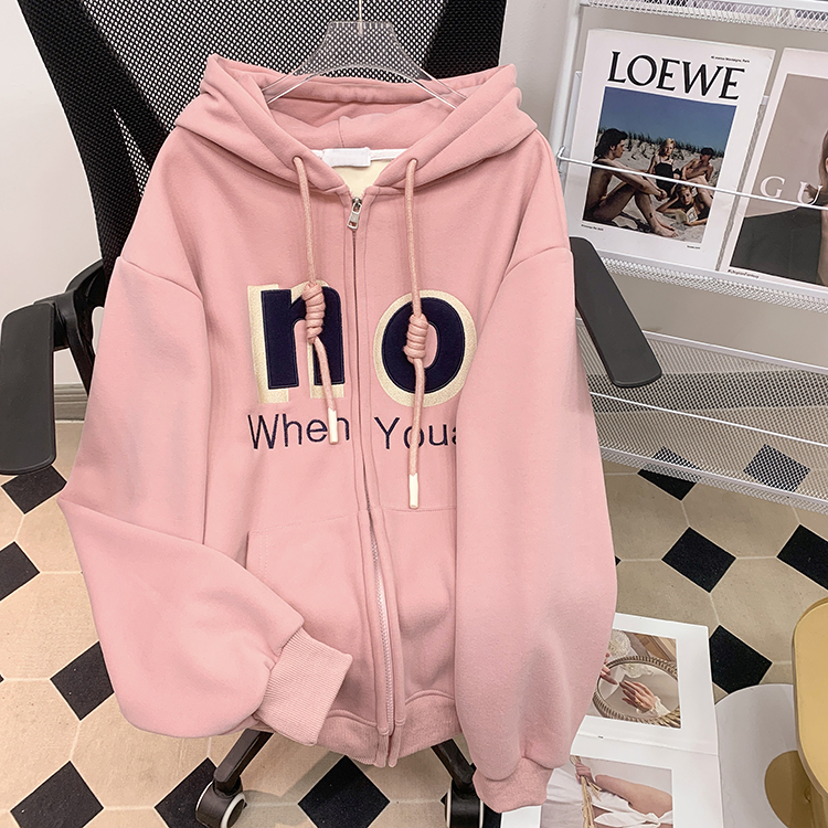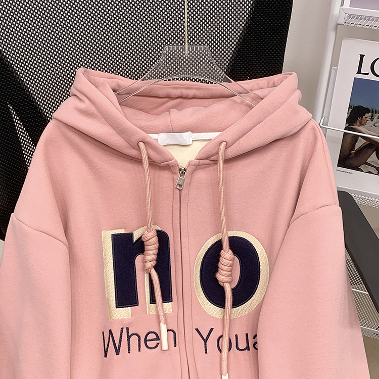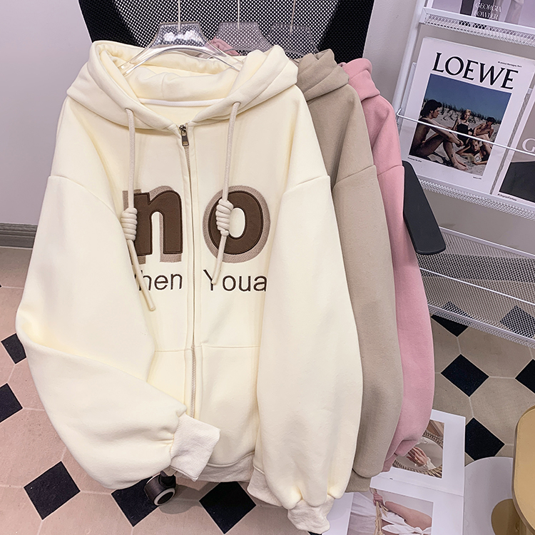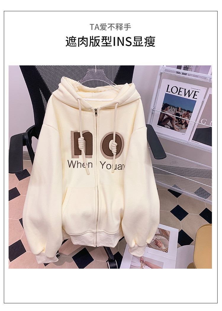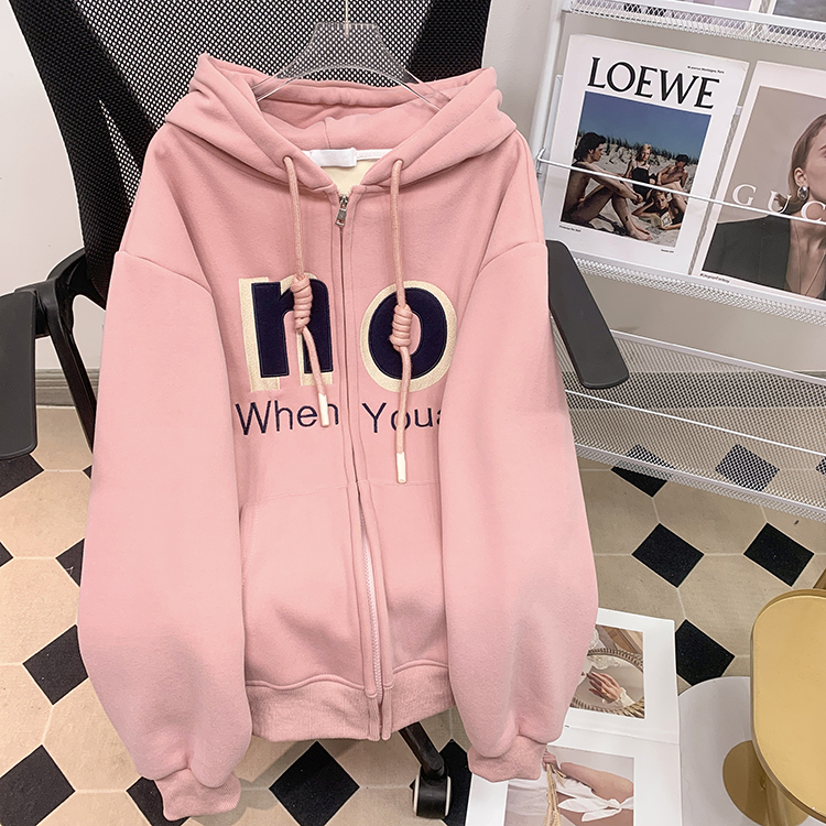 RM30763#加绒加厚中长款连帽卫衣女 大码潮牌刺绣外套宽松外搭上衣