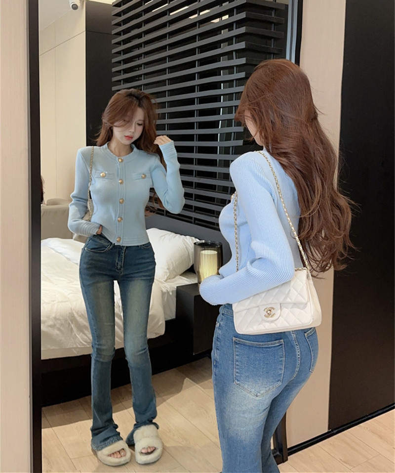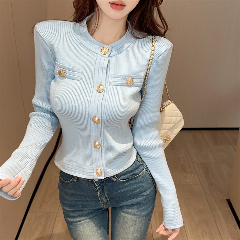 RM30771#高级感气质小香风V领金属扣修身显瘦针织衫短款开衫上衣