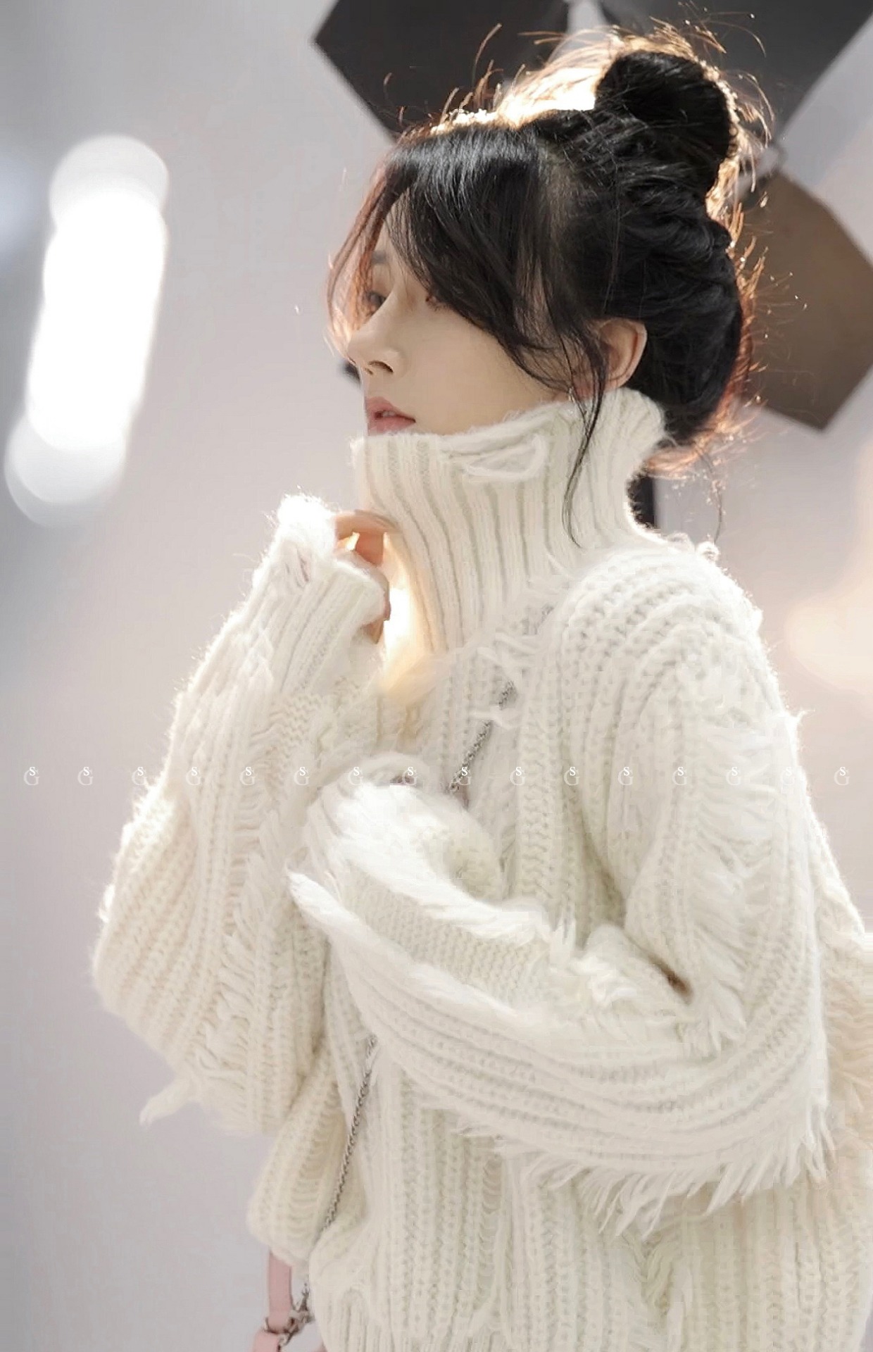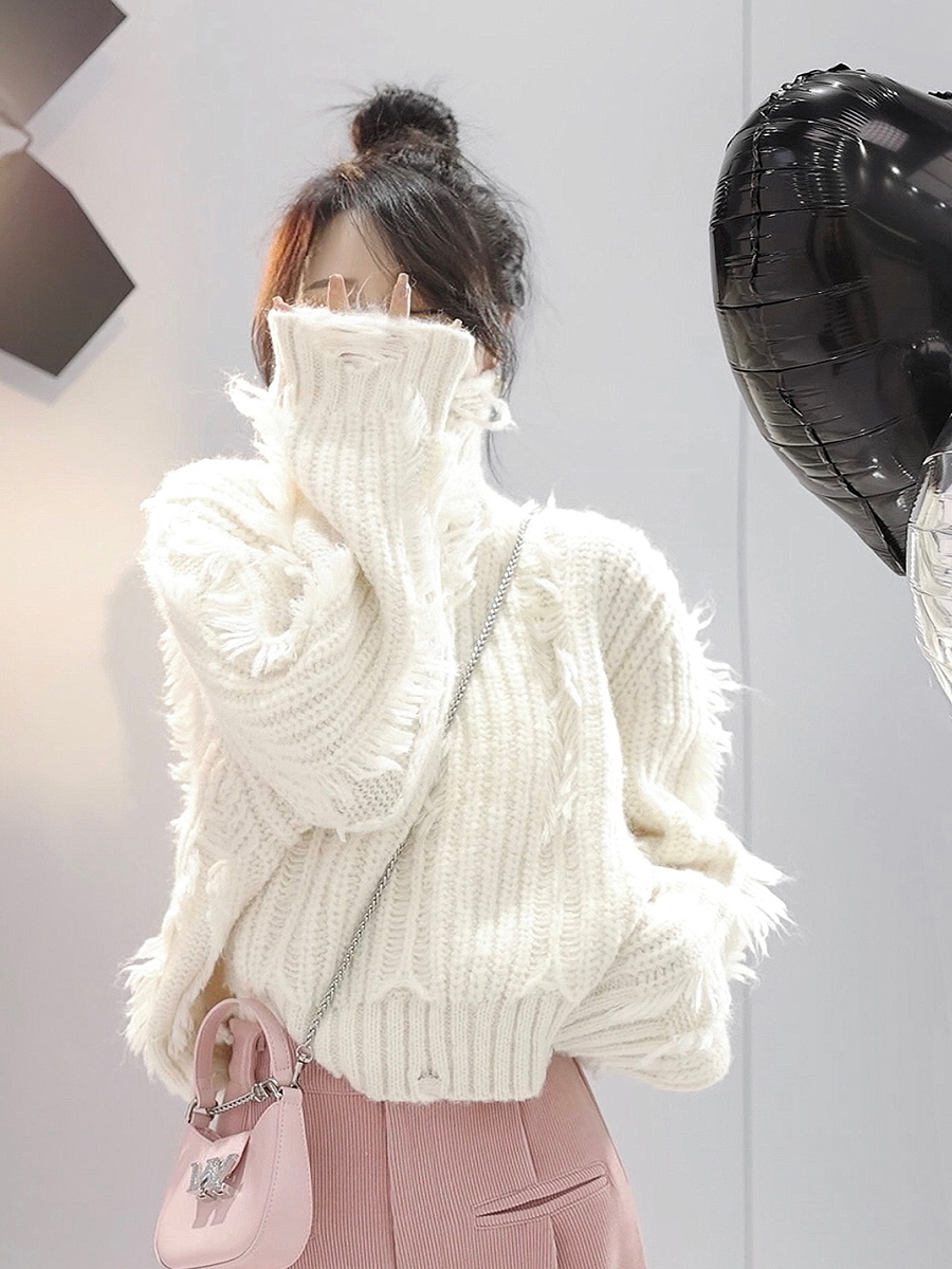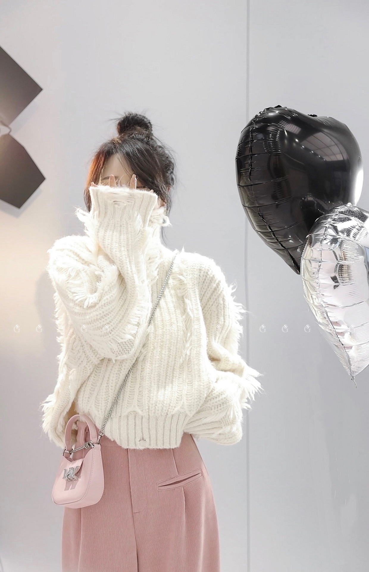 RM30819#有视频!设计感破洞流苏高领套头毛衣韩版百搭甜美春秋毛针织衫纯色宽松型