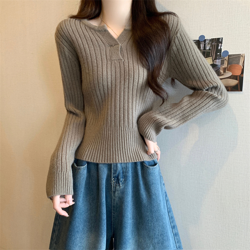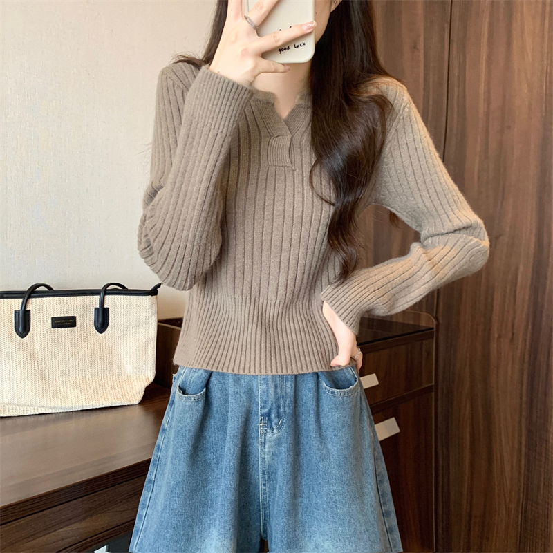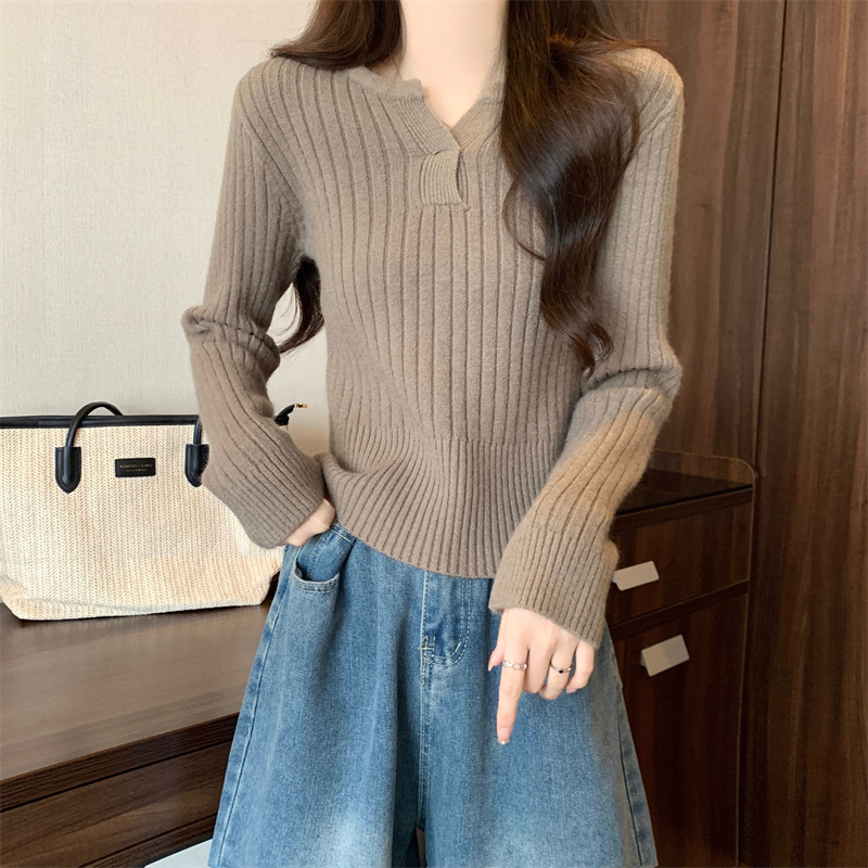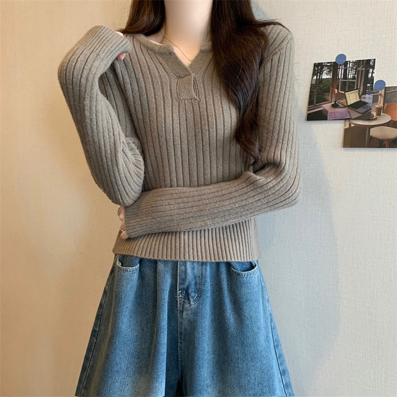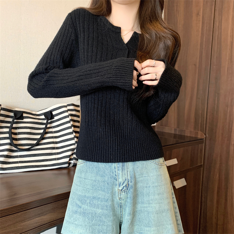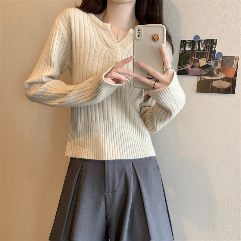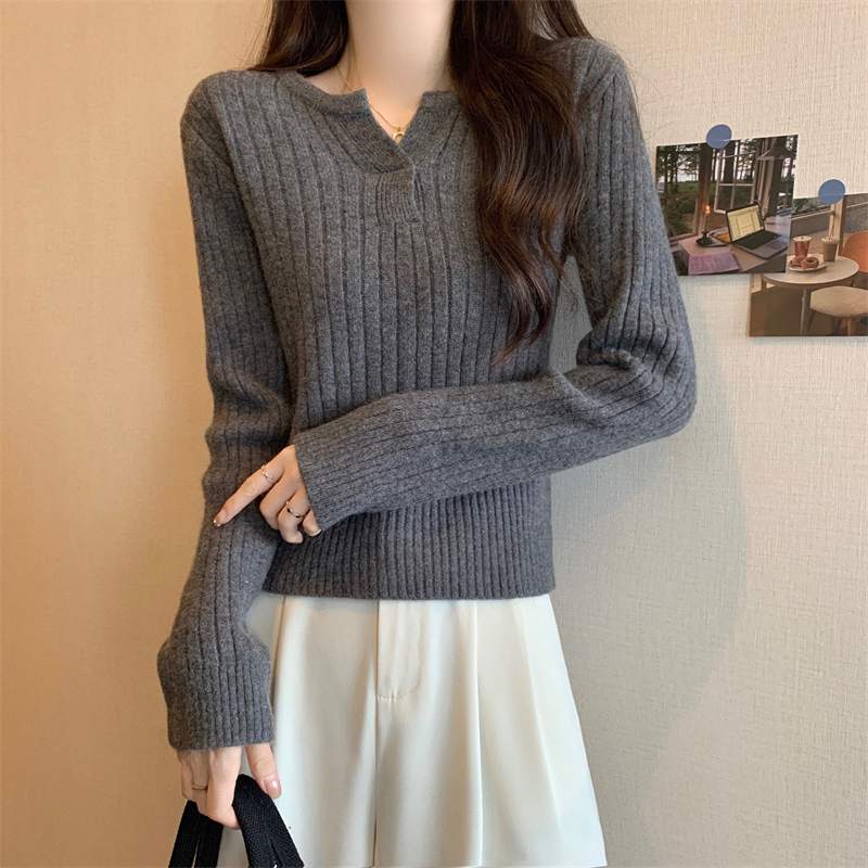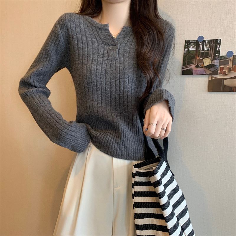RM30887#新版韩风设计感半开领长袖套头坑条针织衫