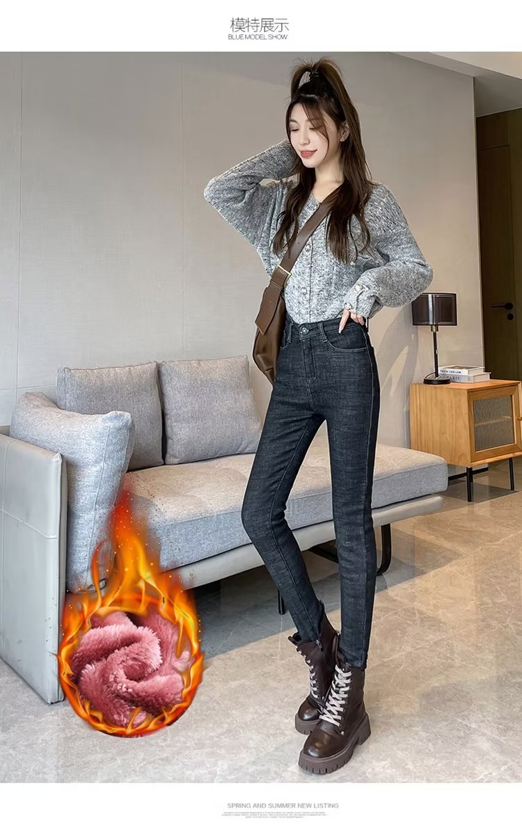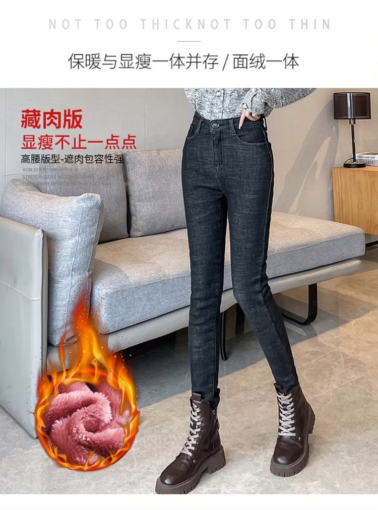 RM31003#粉绒牛仔裤女新款高腰秋冬季显瘦加厚保暖外穿小脚铅笔长裤子