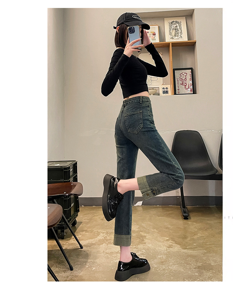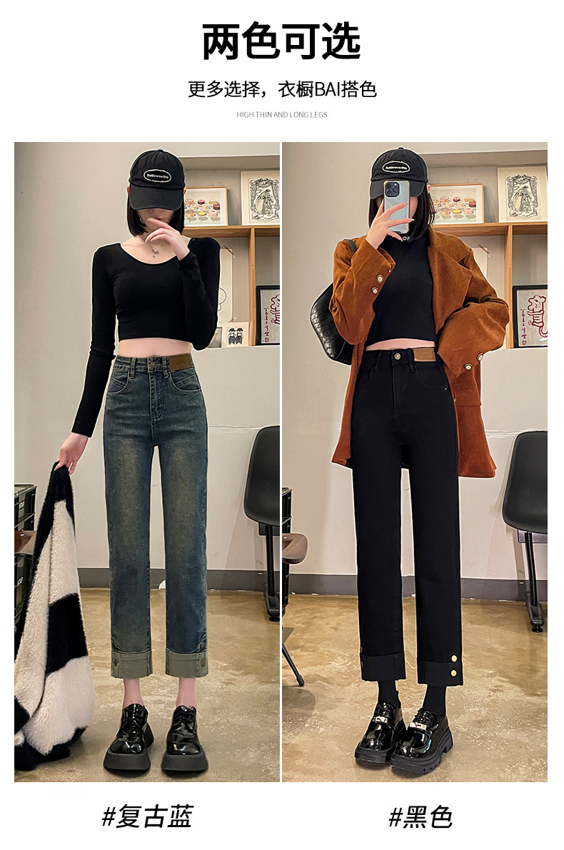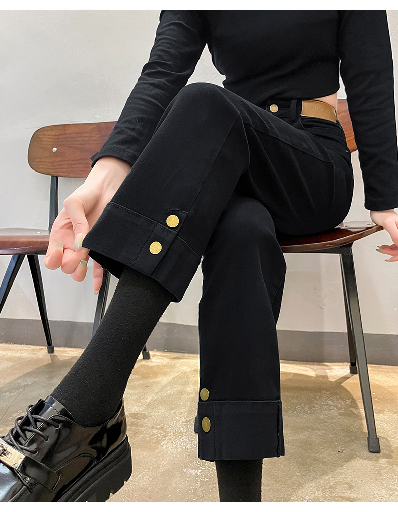 RM31108#黑色加绒翻边牛仔裤女秋冬新款2023爆款烟管裤小个子宽松直筒裤子
