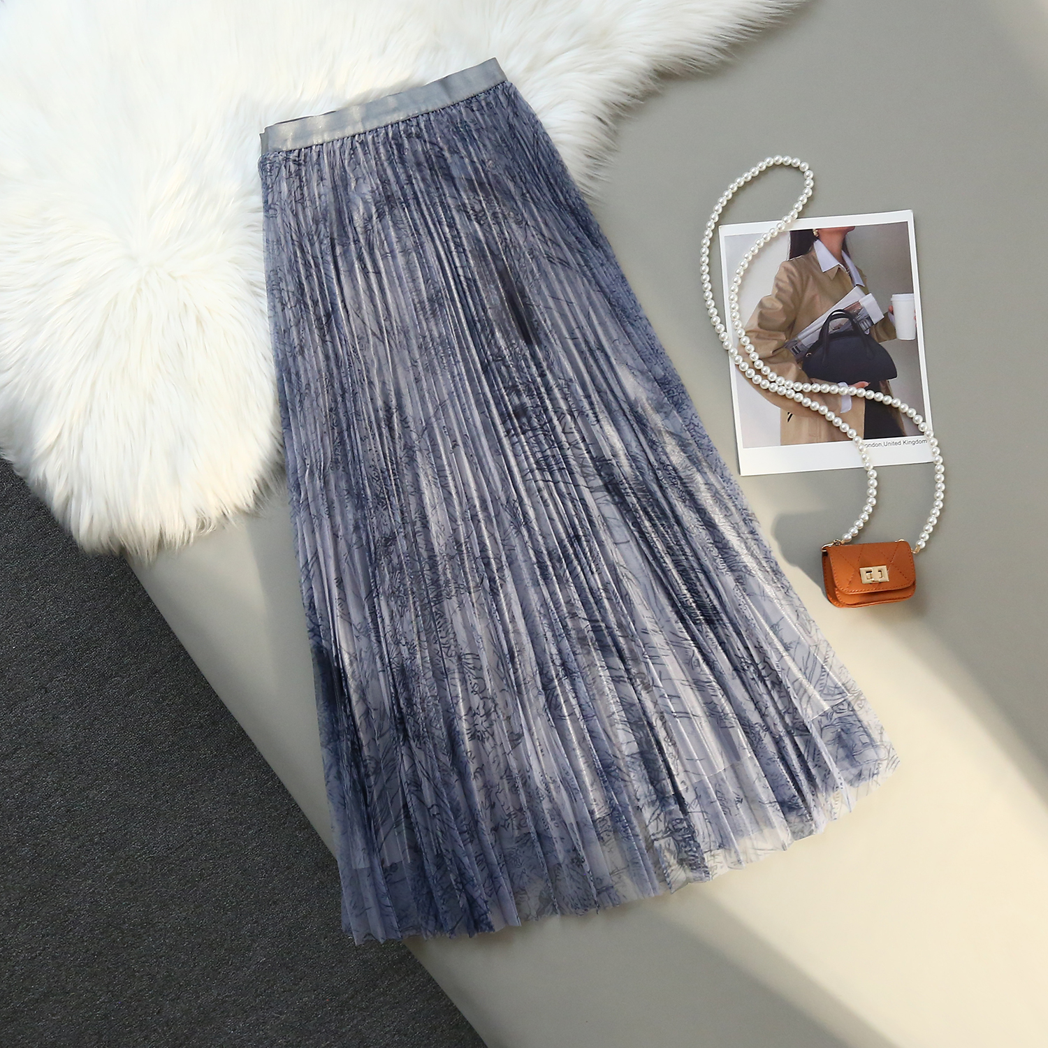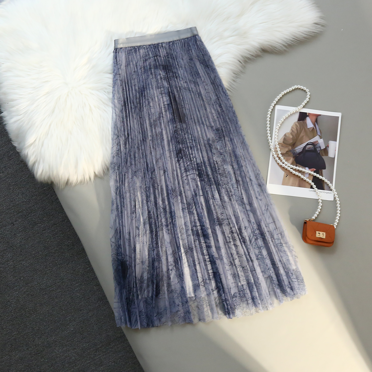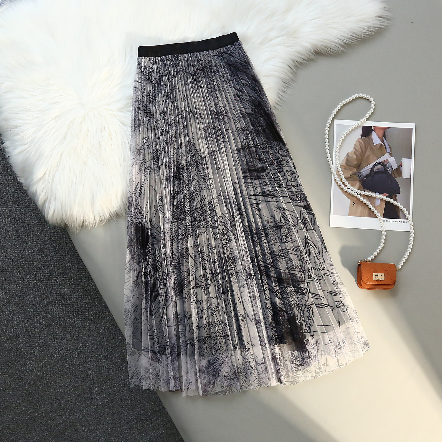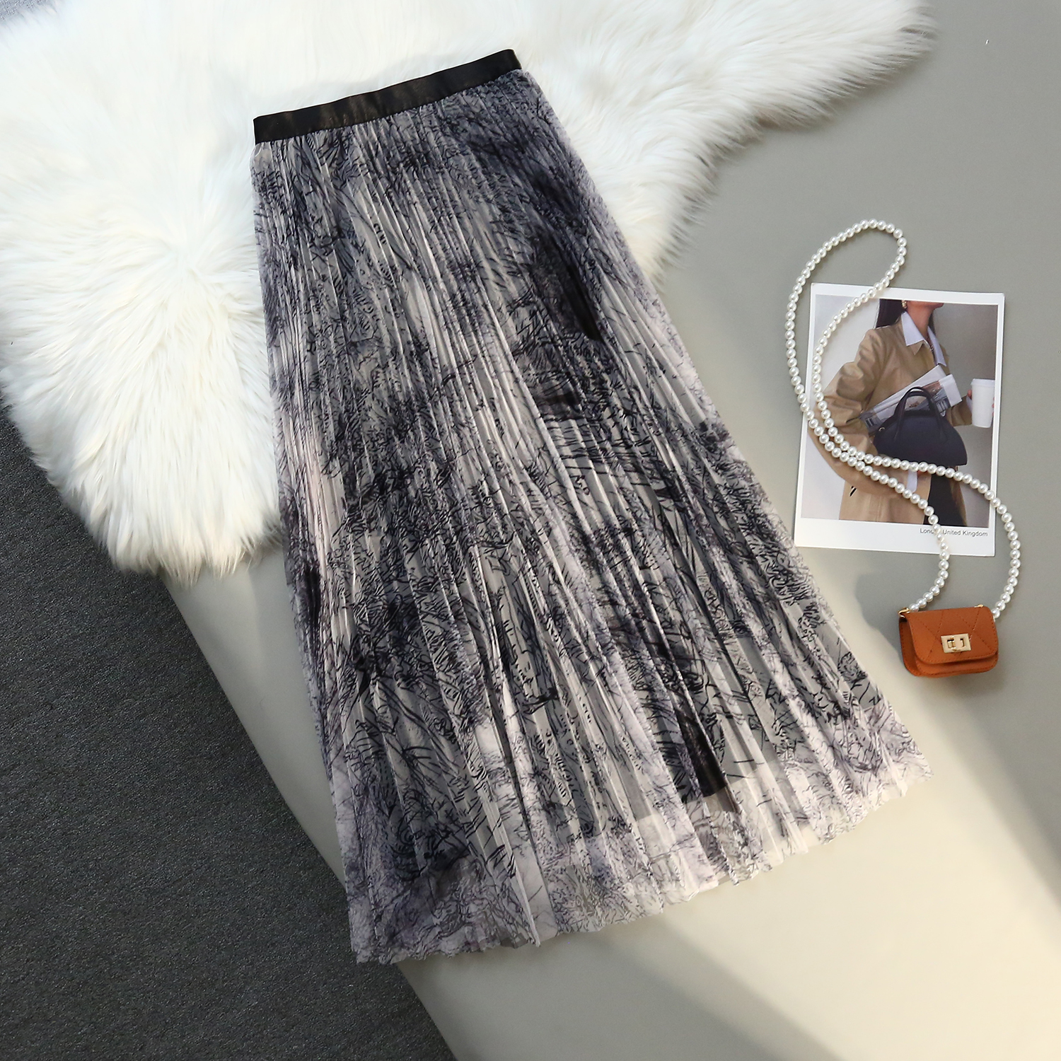RM31192#印花水墨画网纱百褶中高腰百搭显瘦名媛淑女半身裙