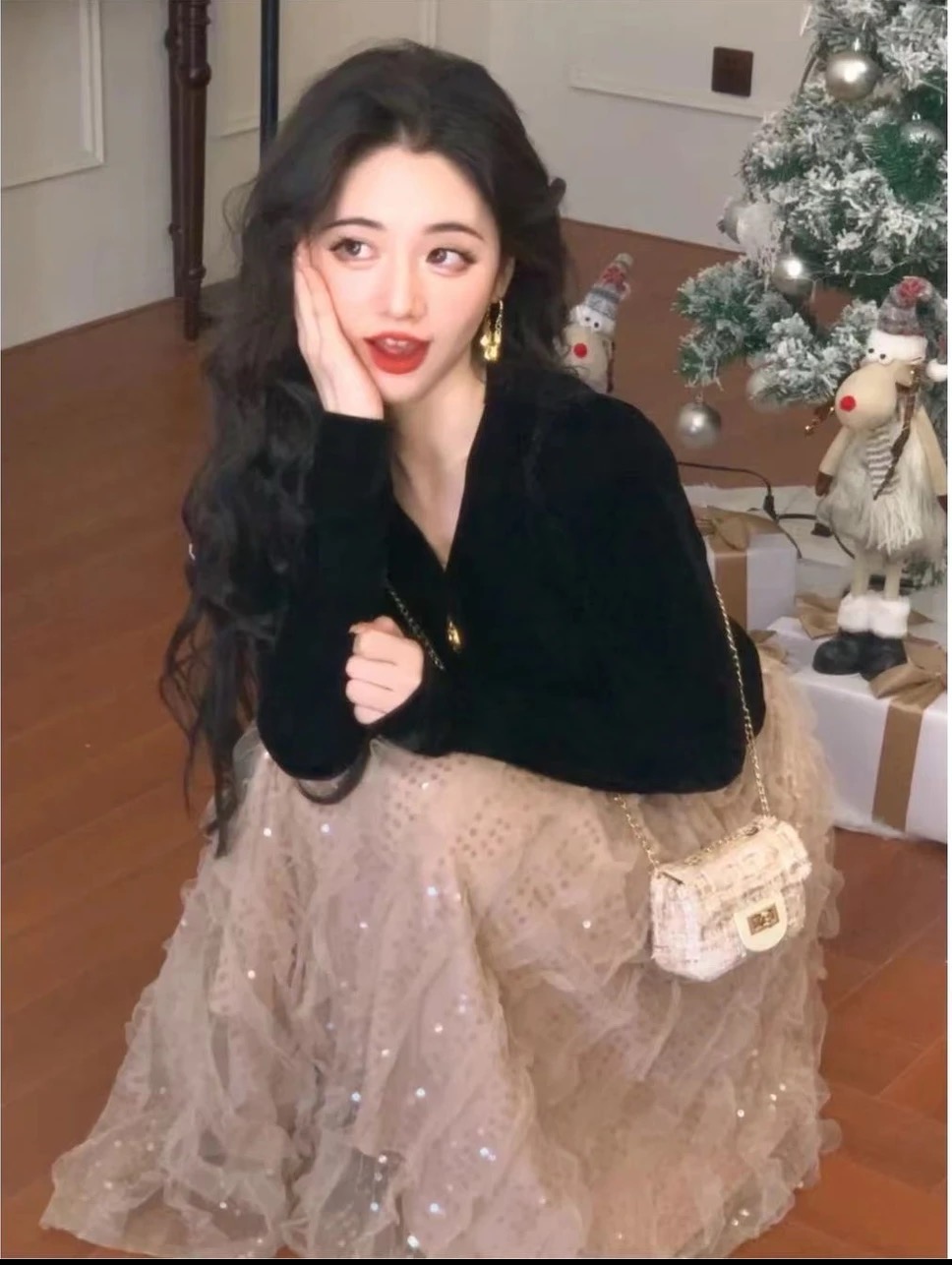 RM31215#黑金派对<祖祖zuzu>法式复古丝绒上衣蕾丝亮片半裙套装冬女