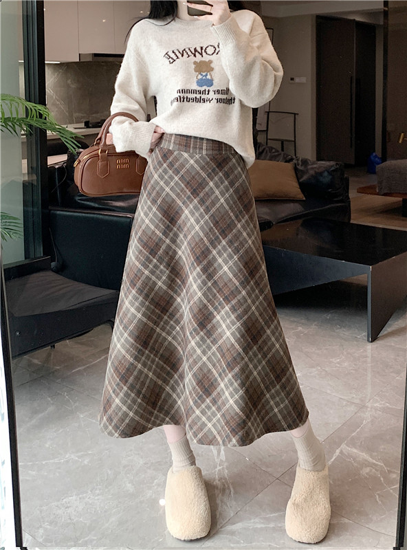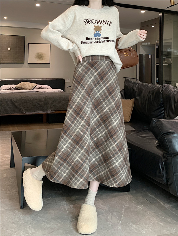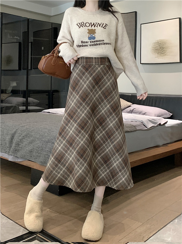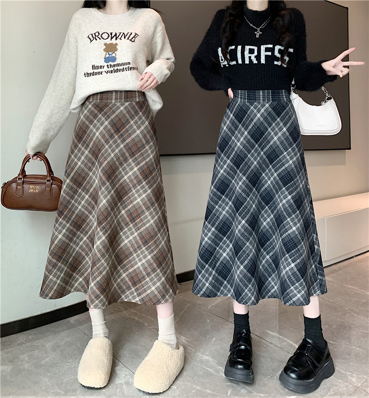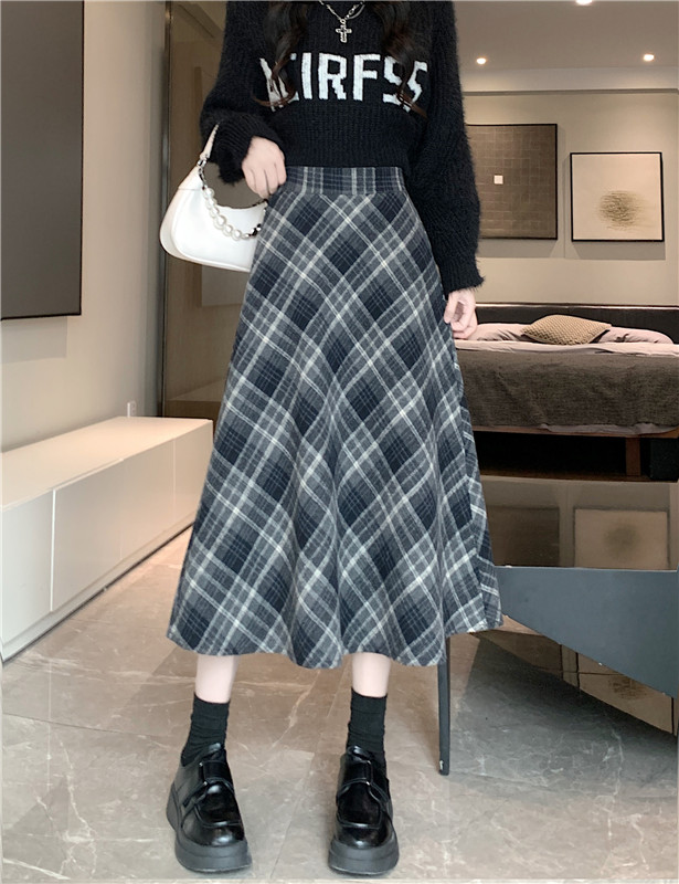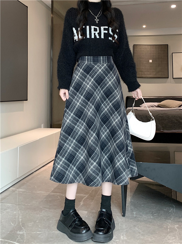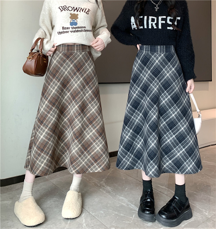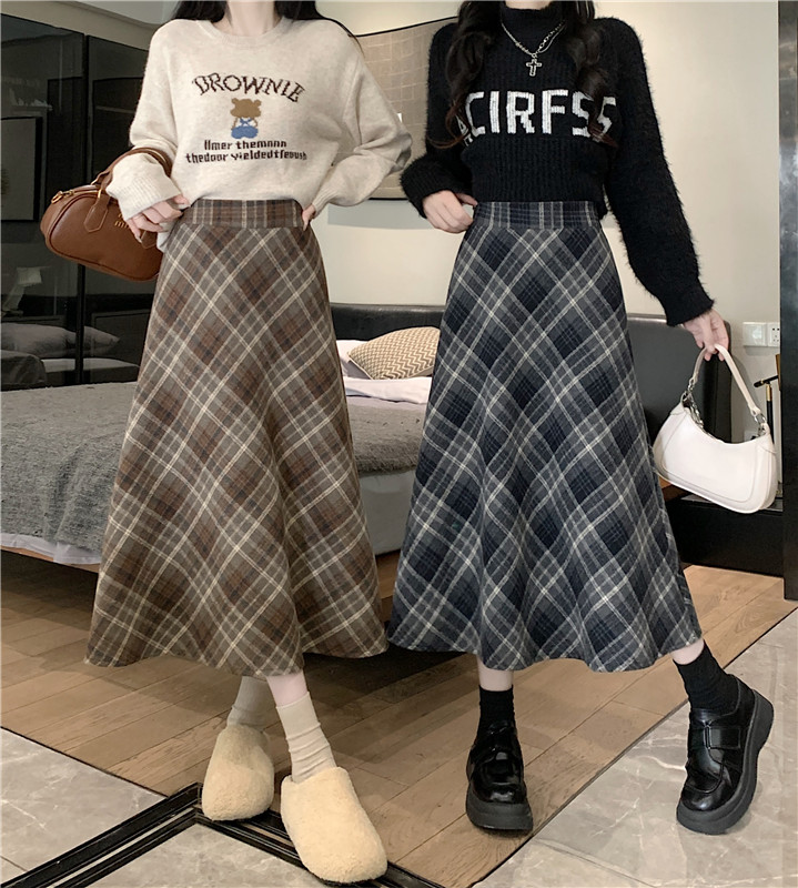 RM31262#韩版毛呢高腰长裙chi格子中长半身裙女