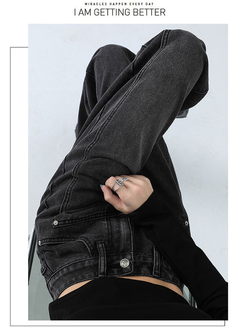 RM31312#秋冬加绒美式黑色牛仔裤高腰宽松显瘦设计感直筒阔腿裤