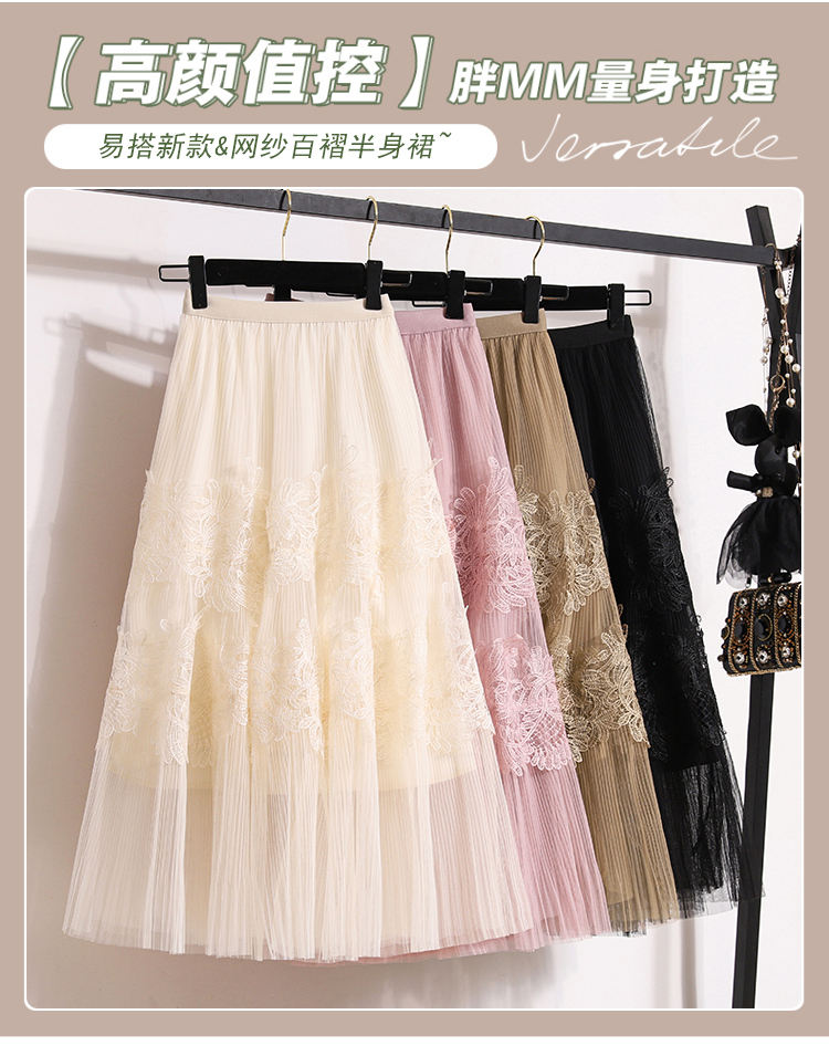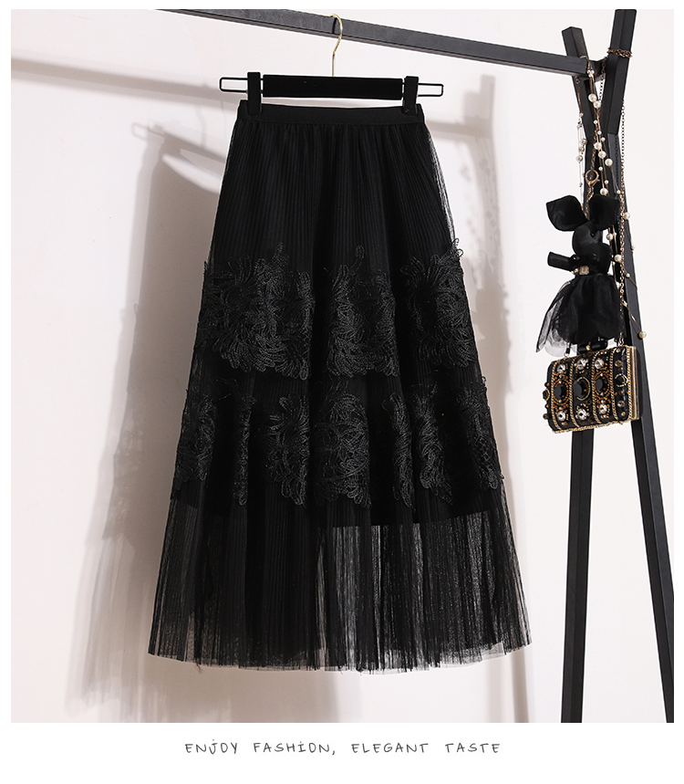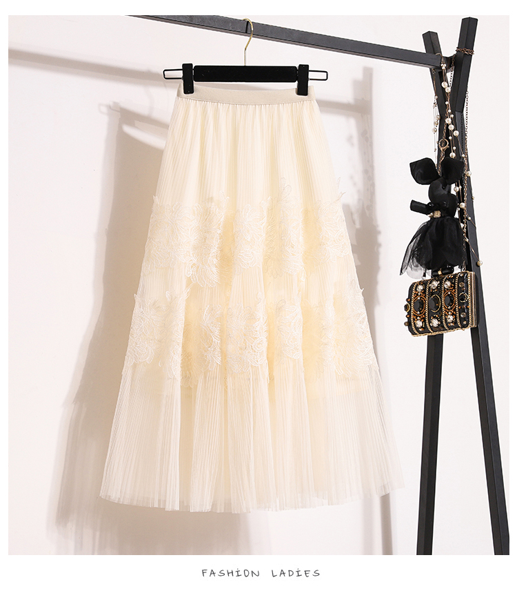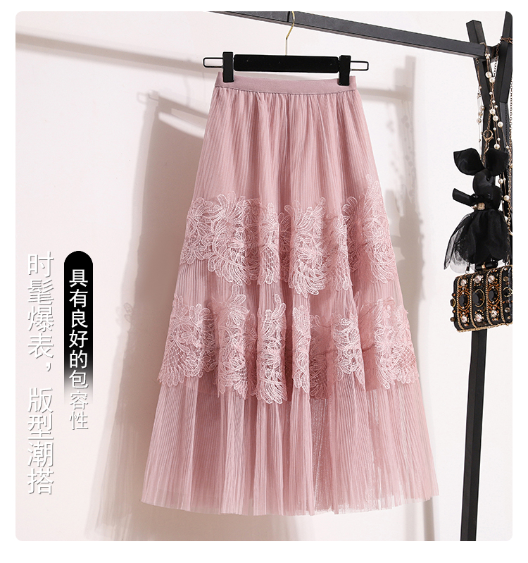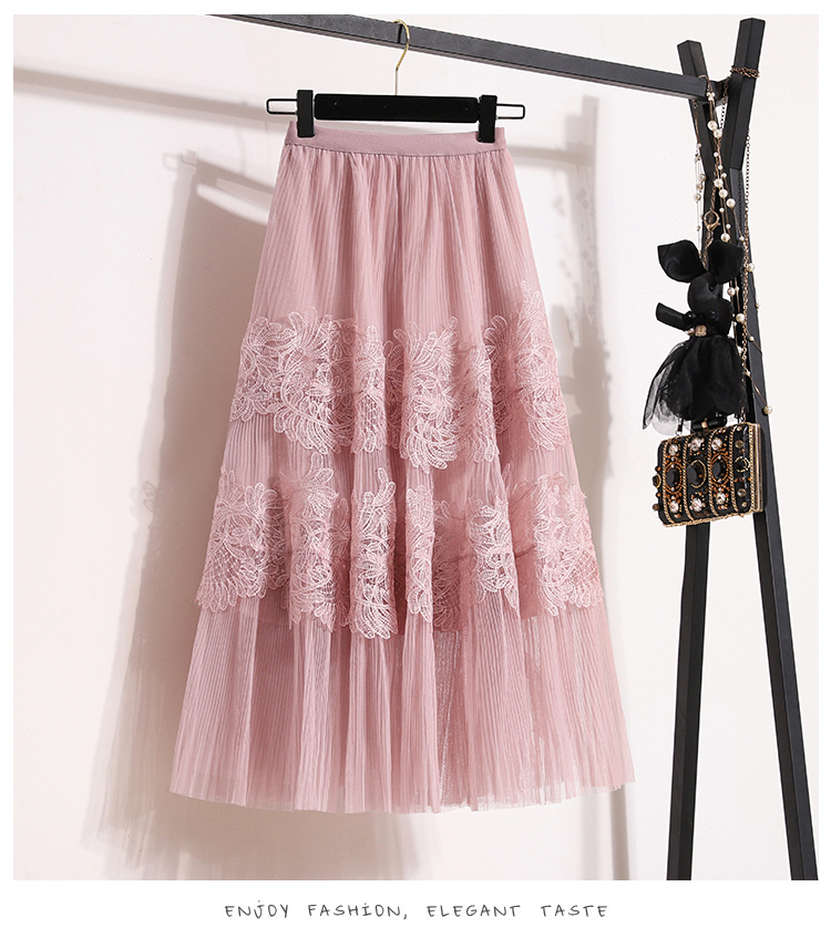 RM31360#网纱压褶大摆刺绣勾花重工蕾丝设计感中长款半身蛋糕裙女