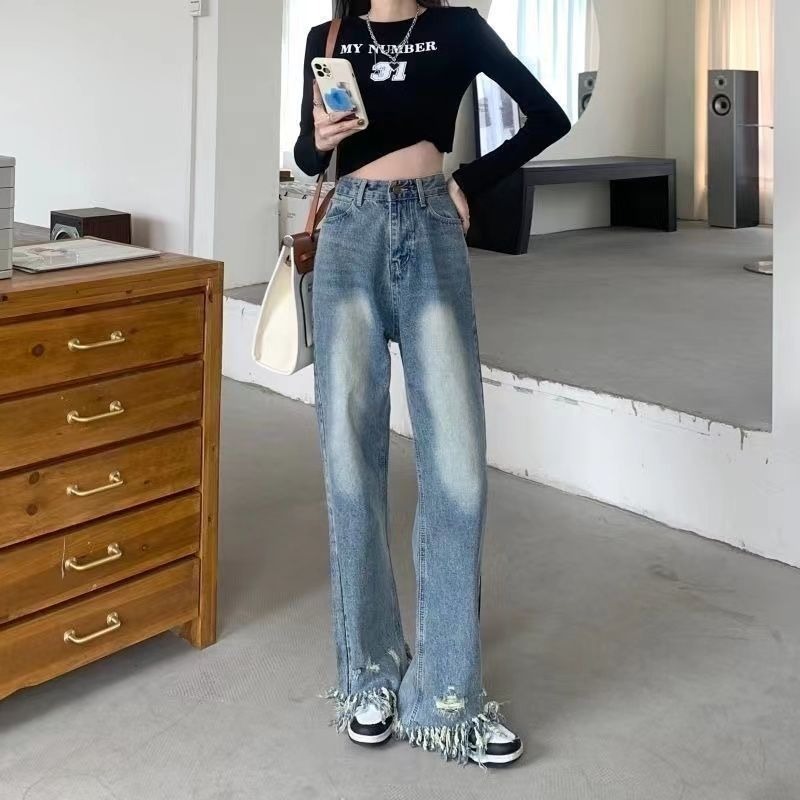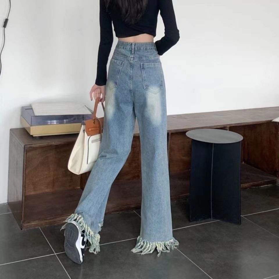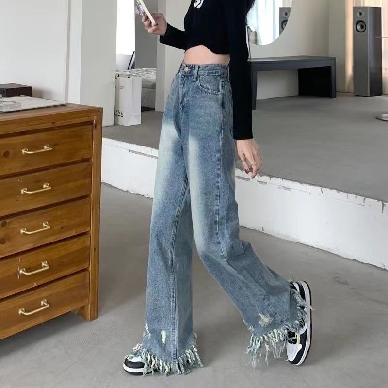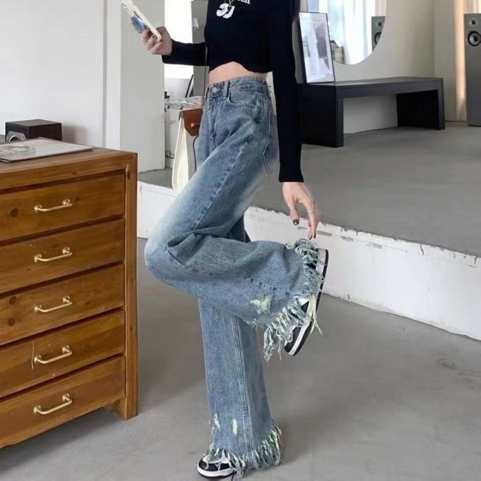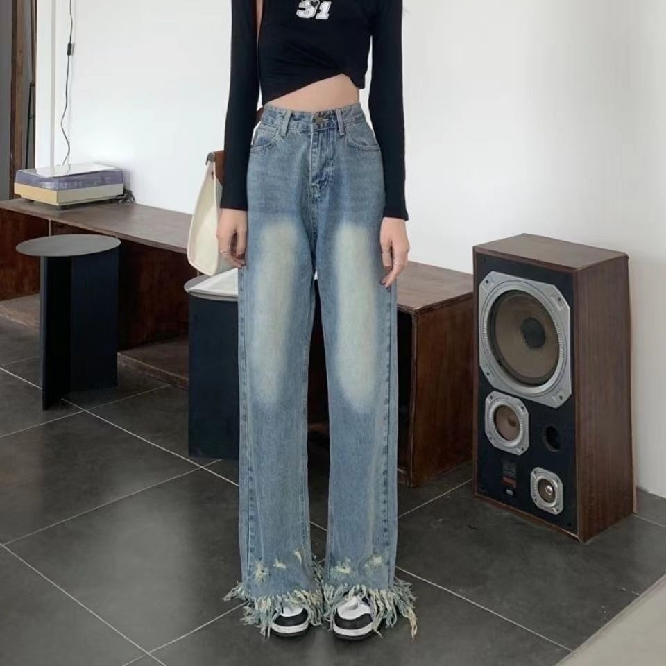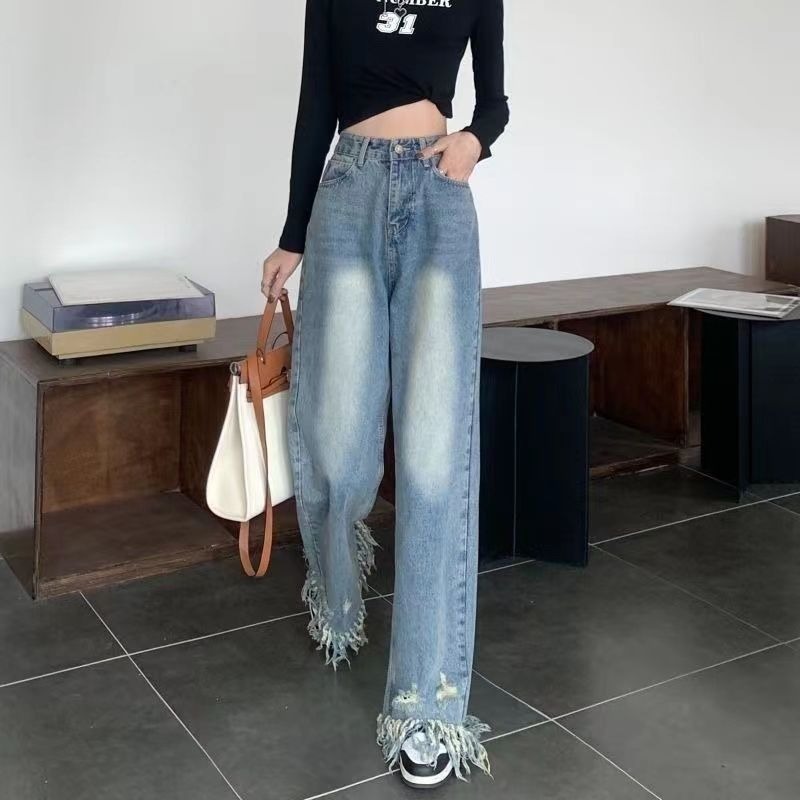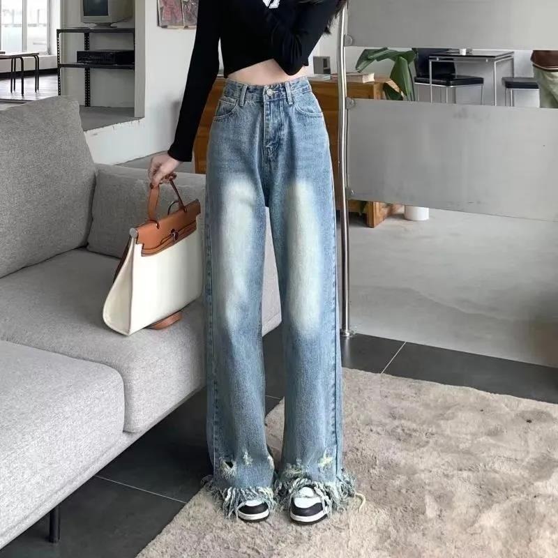 RM31468#新款美式复古水洗毛边裤脚破洞流苏高腰宽松显瘦阔腿牛仔裤女