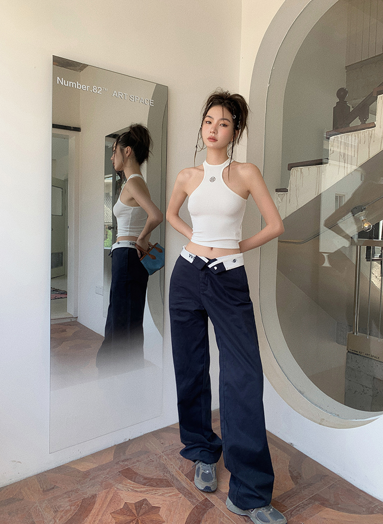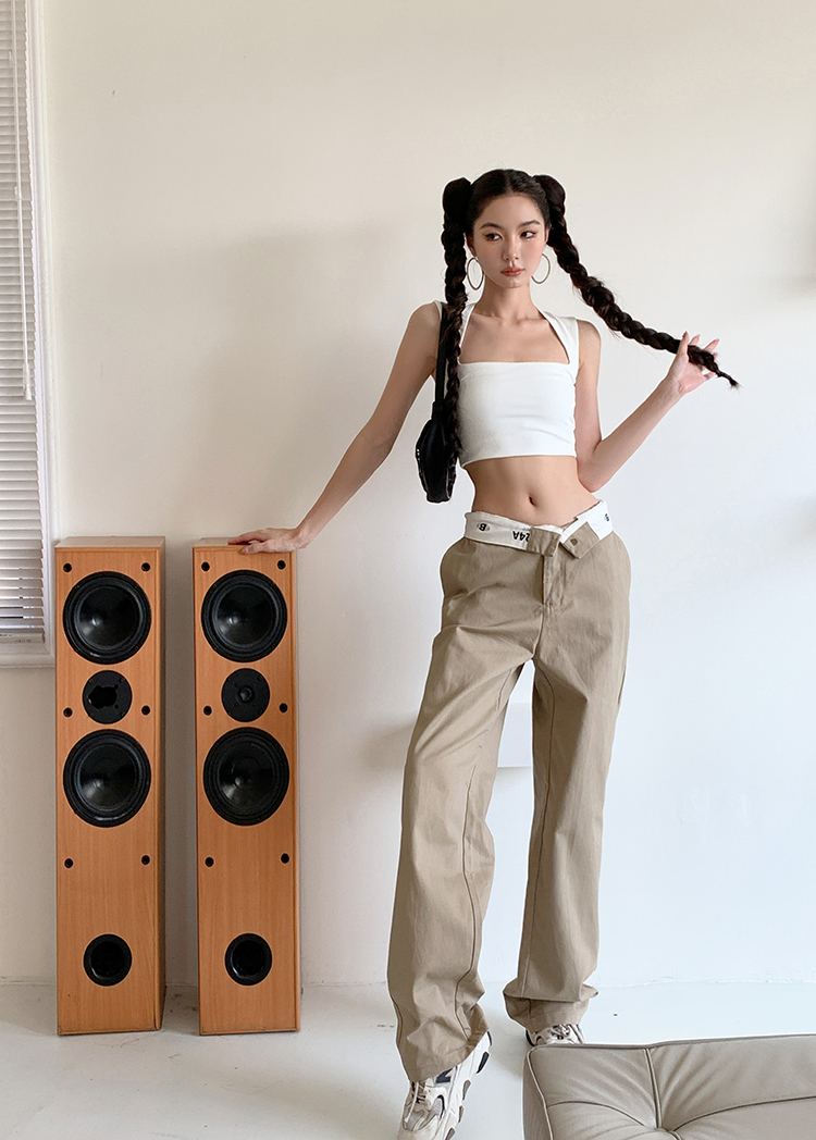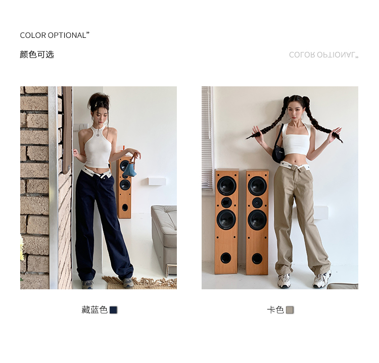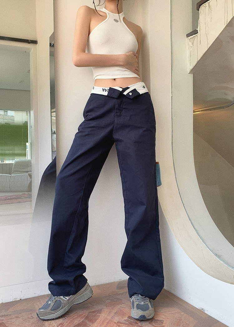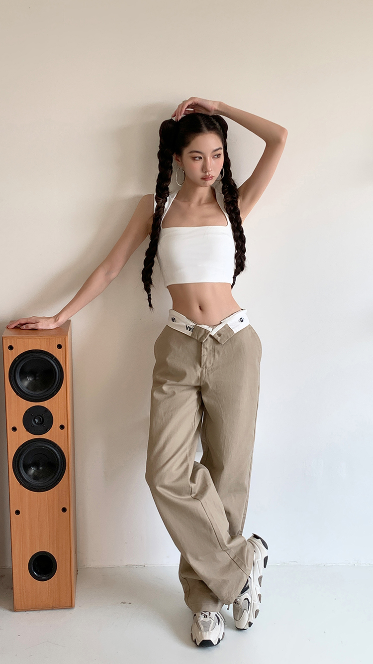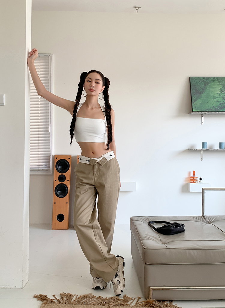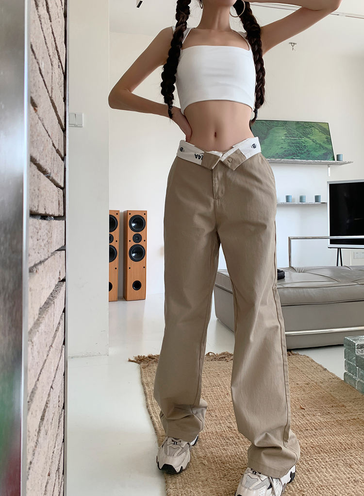 RM31517#春夏新款小众设计翻边腰部字母辣妹休闲直筒阔腿裤女春夏